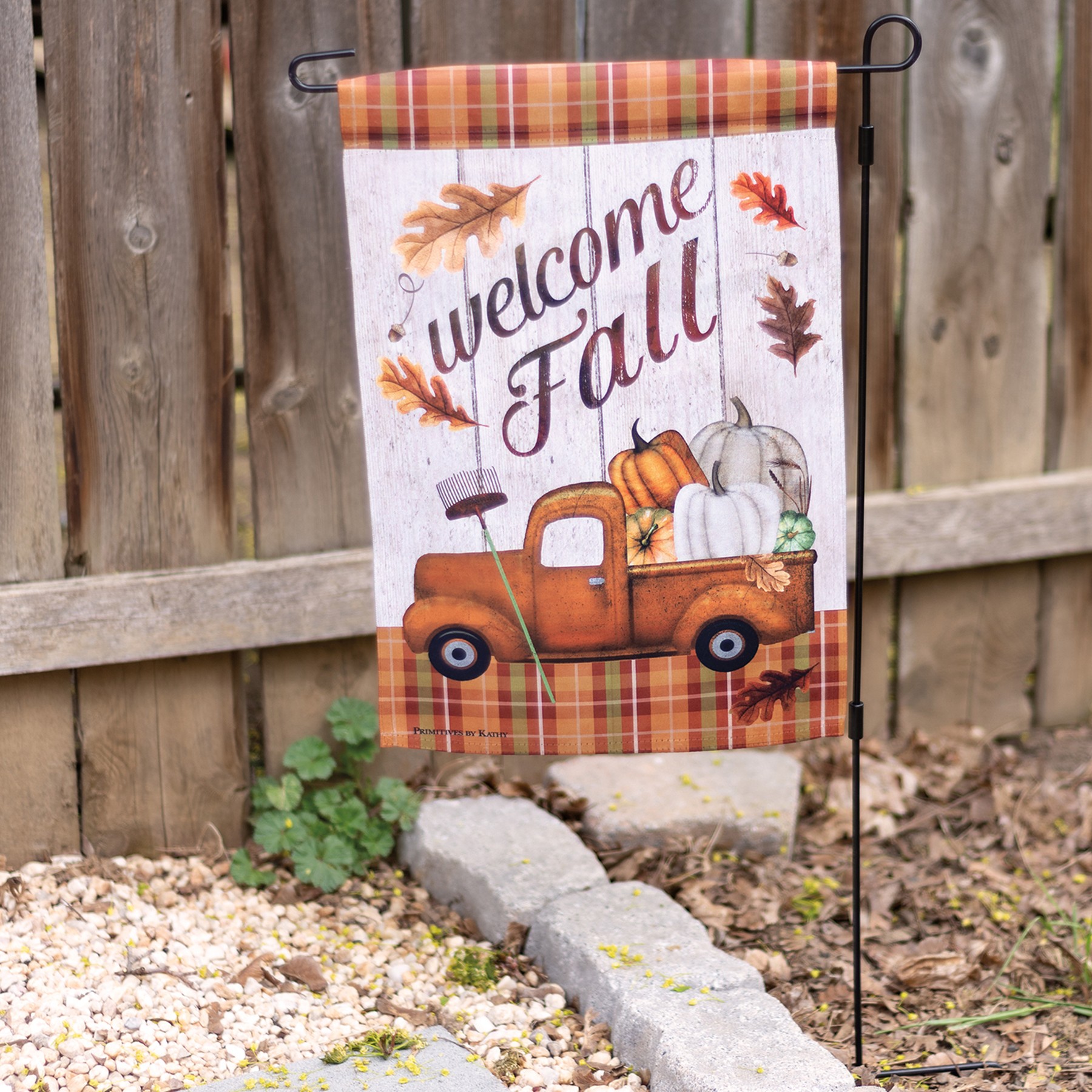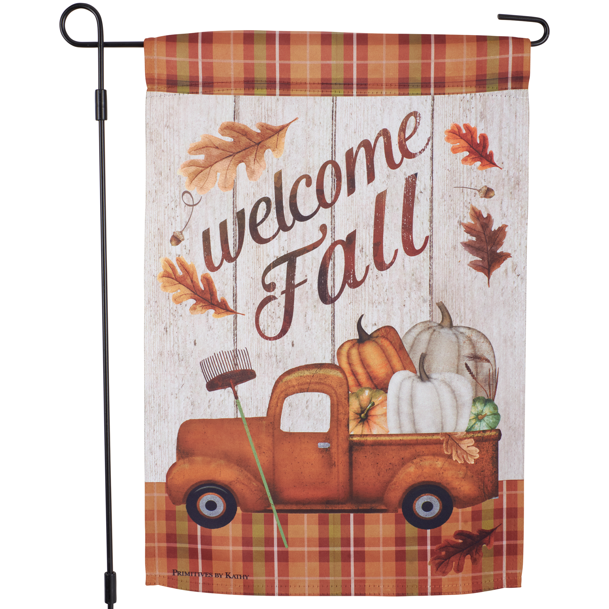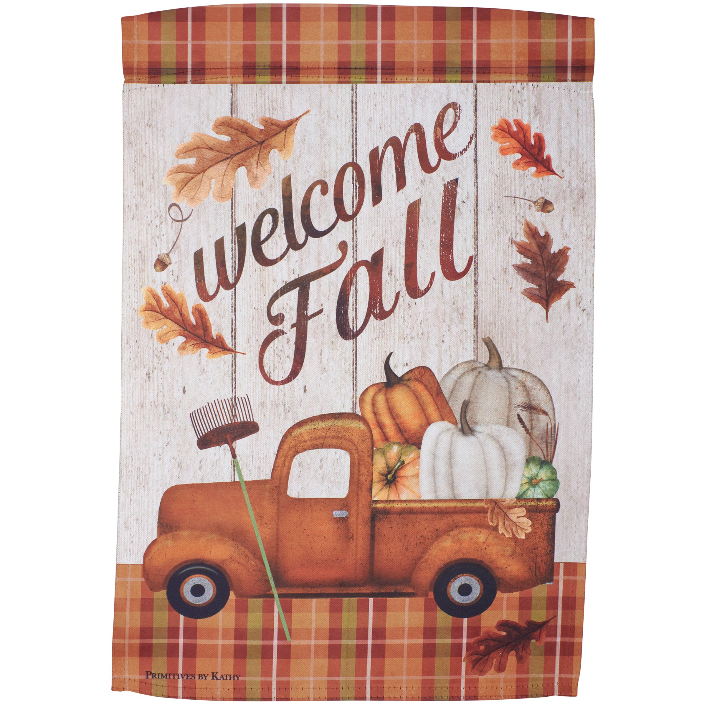 A double-sided polyester garden flag from our Fall & Harvest Collection displaying a vintage design of orange pickup hauling a variety of pumpkins with "Welcome Fall" sentiment. Our garden flags are weather-resistant and feature an opening to hang on ourĀ Garden Flag Pole. Hand-wash only. The Welcome Fall garden flag is packaged with a header card and hook to hang on rack.