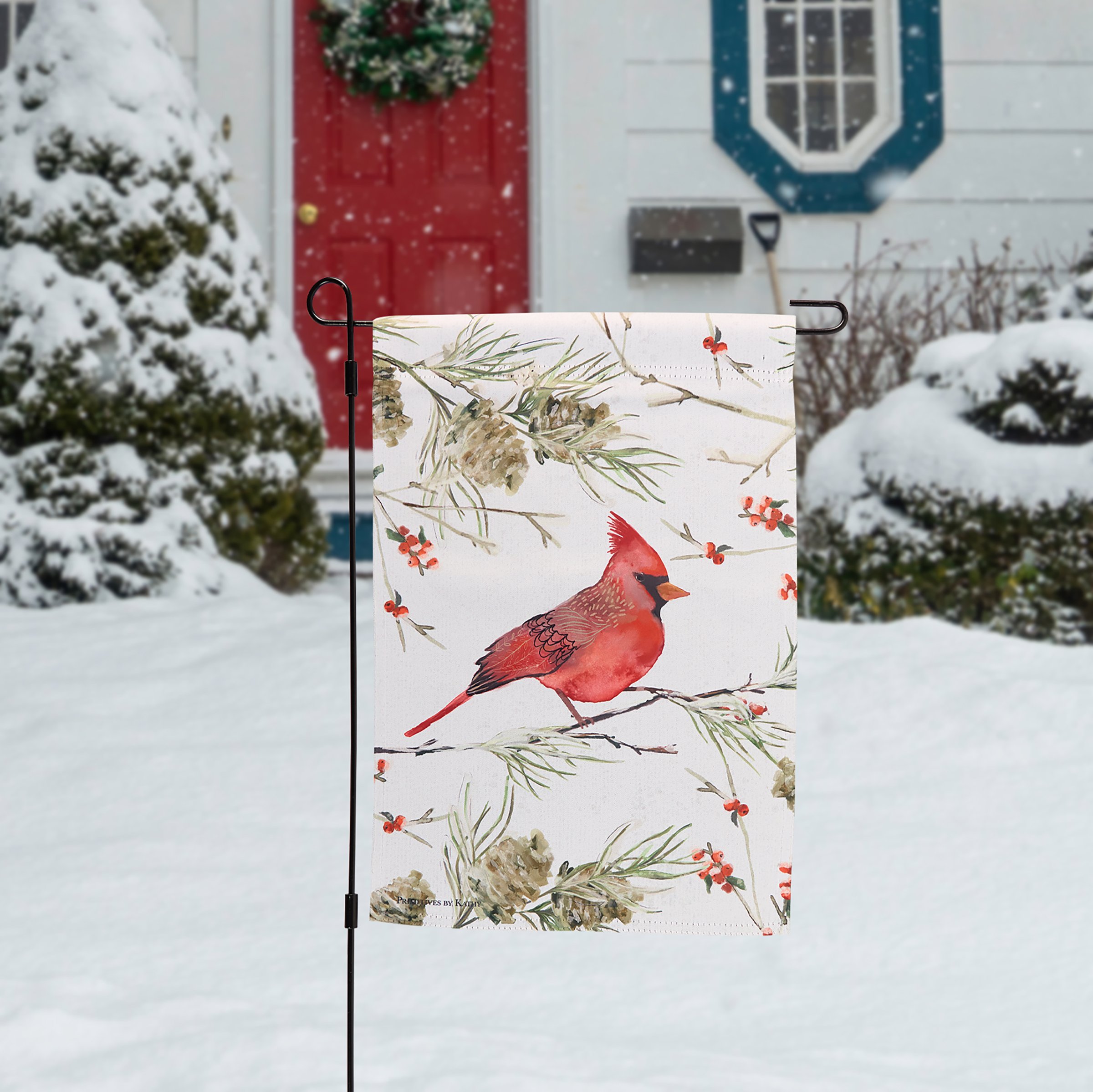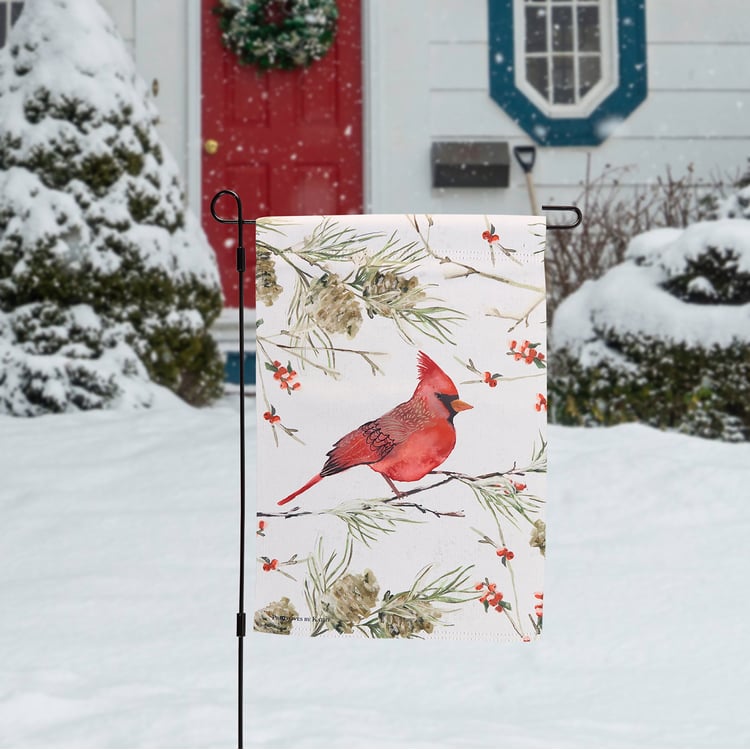 A double-sided polyester garden flag from our Christmas Collection displaying a cardinal with winter branches. Cardinal design is replicated from original art hand painted in a unique watercolor style. Seasonal garden flag is weather-resistant and features an opening to hang on our Garden Flag Pole. Our Winter Red Cardinal garden flag is packaged with a header card and hook to easily hang on rack for store display. Hand wash only. A charming Christmas home accent perfect for seasonal display in any yard or garden.