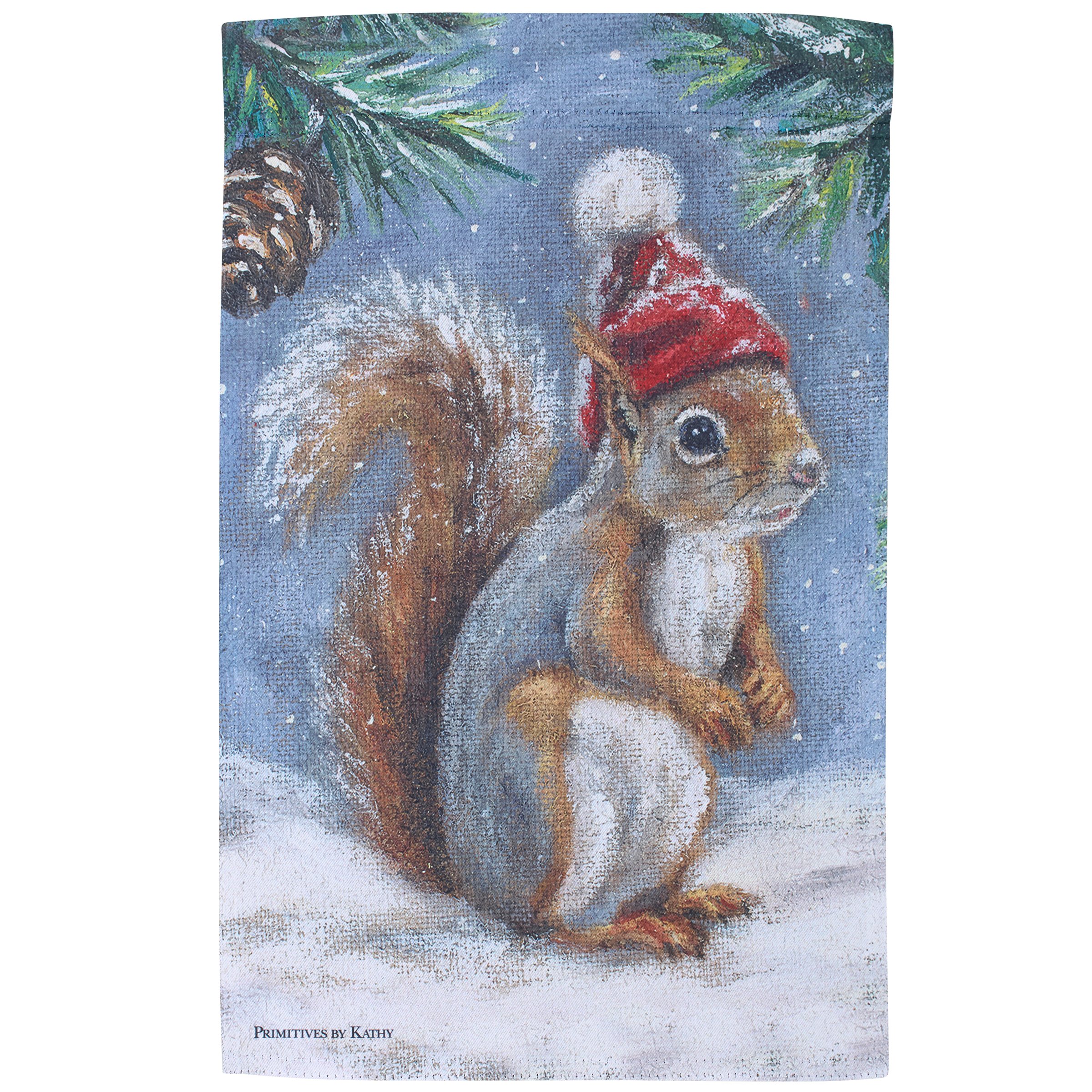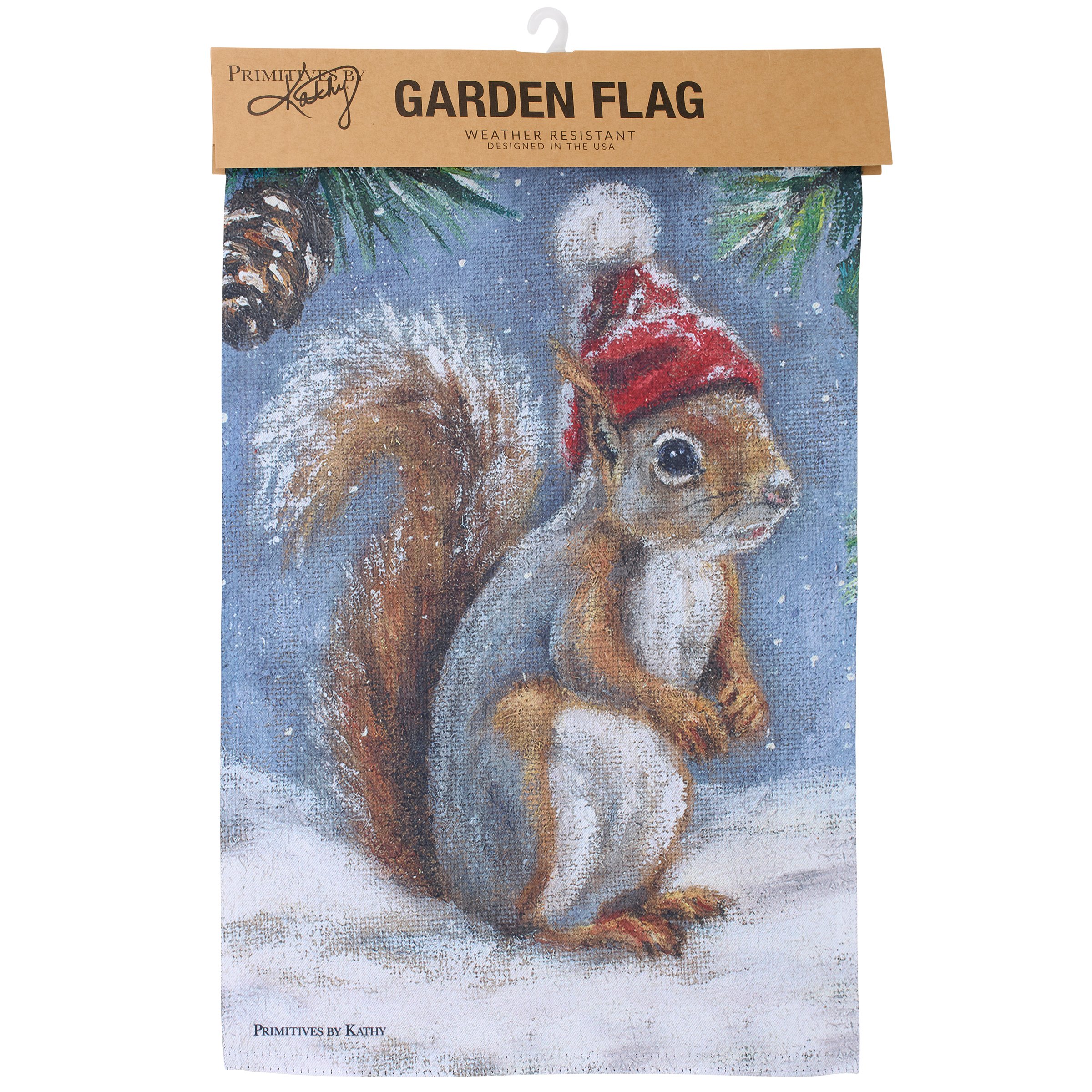 A polyester garden flag from our Christmas Collection featuring a double-sided design displaying a charming winter scene of a squirrel wearing a winter hat. Winter squirrel design is replicated from original artwork painted onto burlap canvas, giving the art a unique depth and texture. Seasonal garden flag is weather-resistant and features an opening to hang on our Garden Flag Pole. Hand-wash only. Our Winter Squirrel garden flag is packaged with a header card and hook to easily hang on rack for store display. A rustic nature themed home accent perfect for seasonal display in any yard or garden.