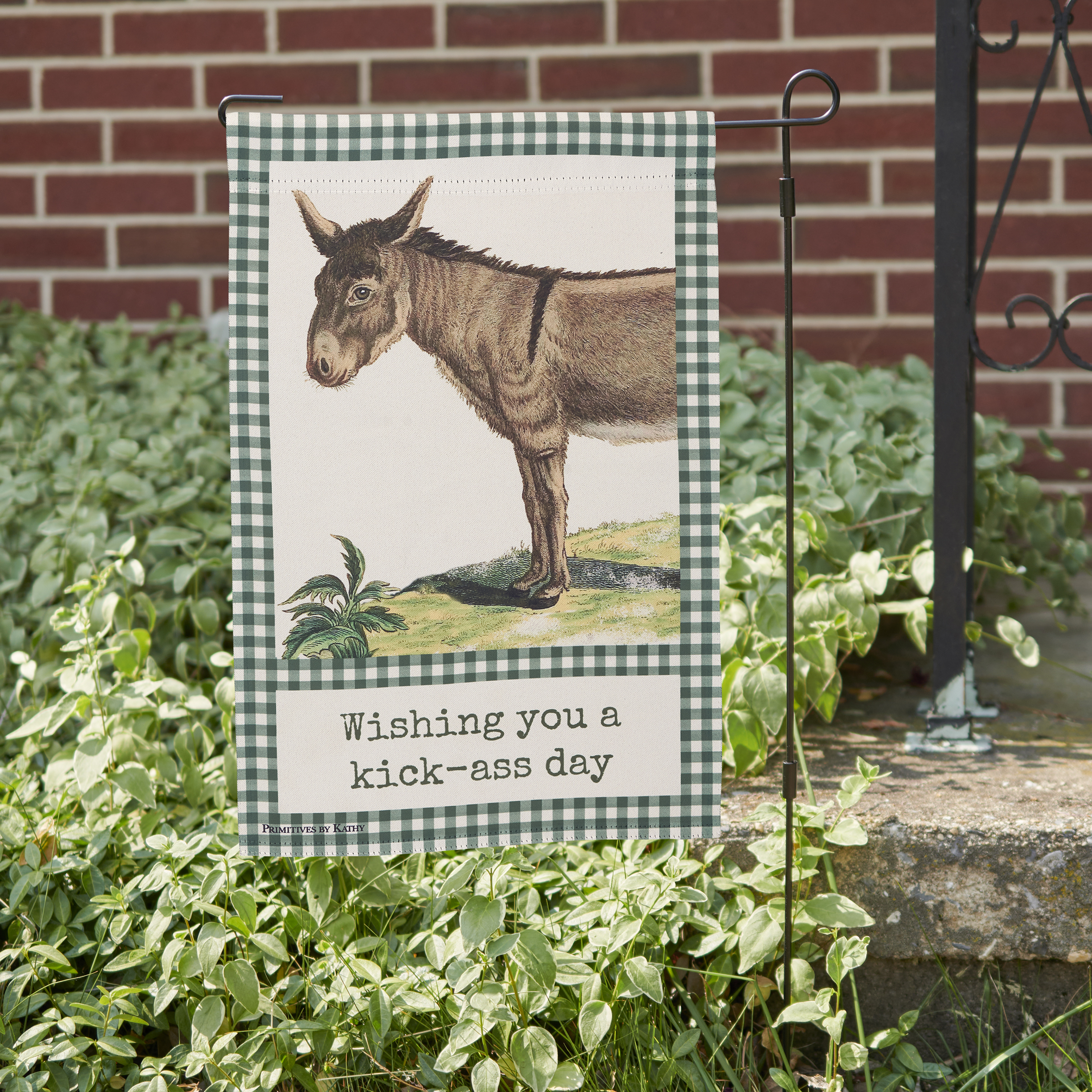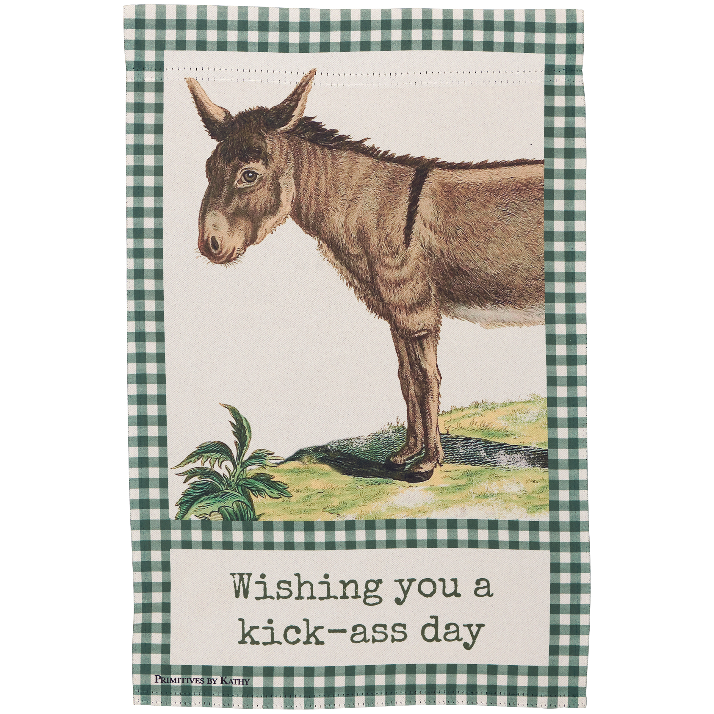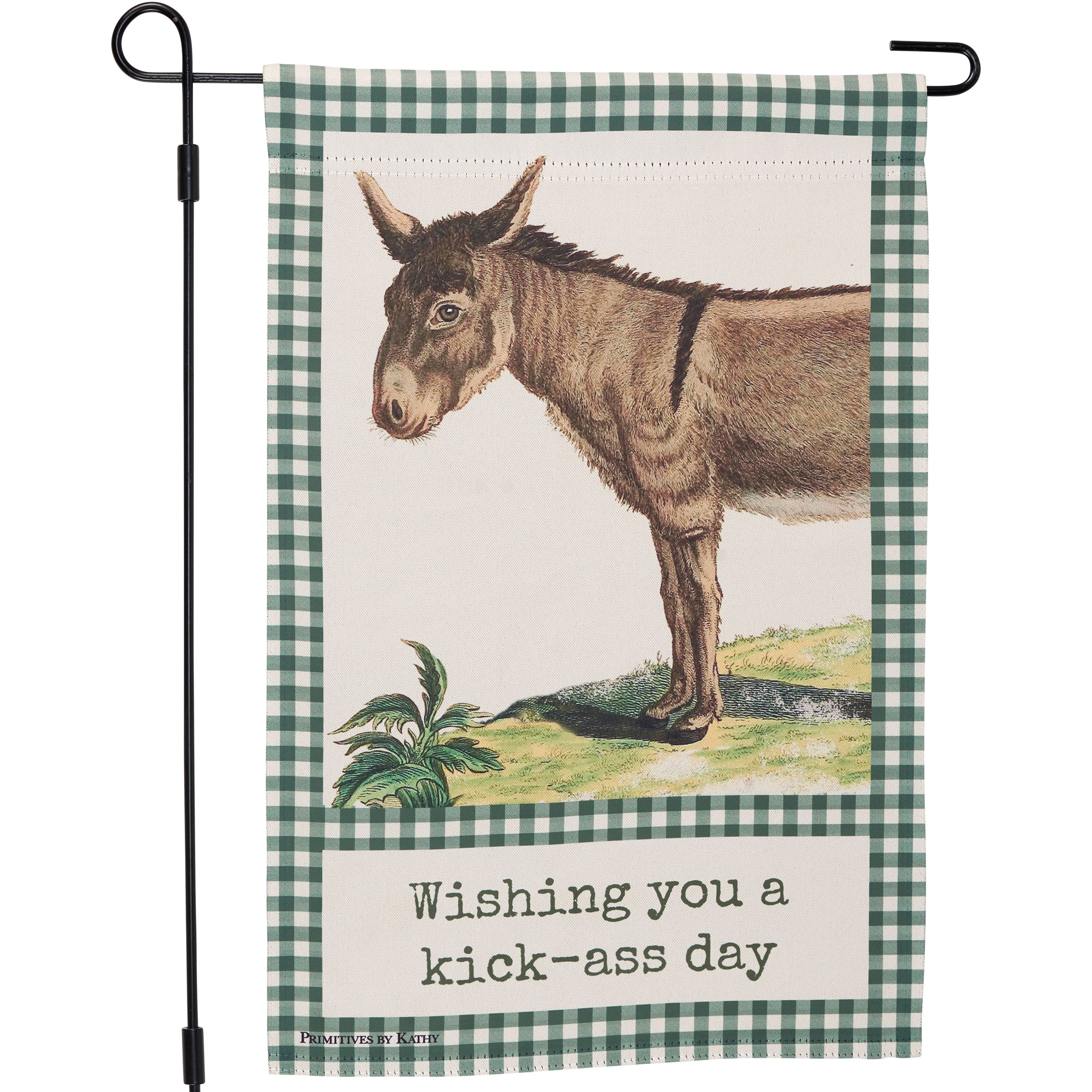 A double-sided polyester garden flag from our Farmhouse Collection displaying a vintage donkey design with green gingham borders. Design features coordinating punny sentiment that reads "Wishing You A Kick-Ass Day." Garden flag is weather-resistant and features an opening to hang on our Garden Flag Pole. Our Wishing You garden flag is packaged with a header card and hook to easily hang on rack. Hand-wash only. A fun farm-themed home accent perfect for everyday display in any yard or garden.
