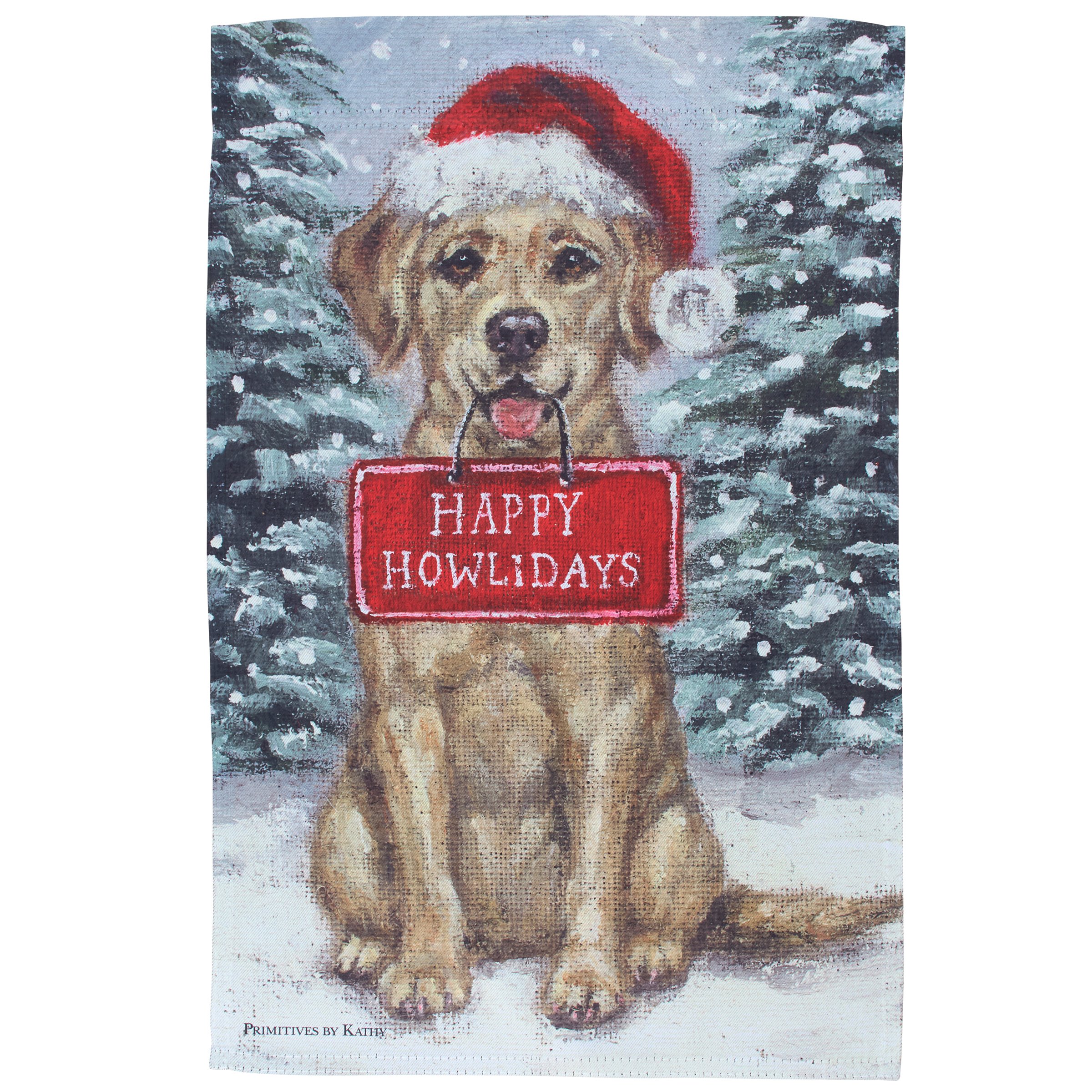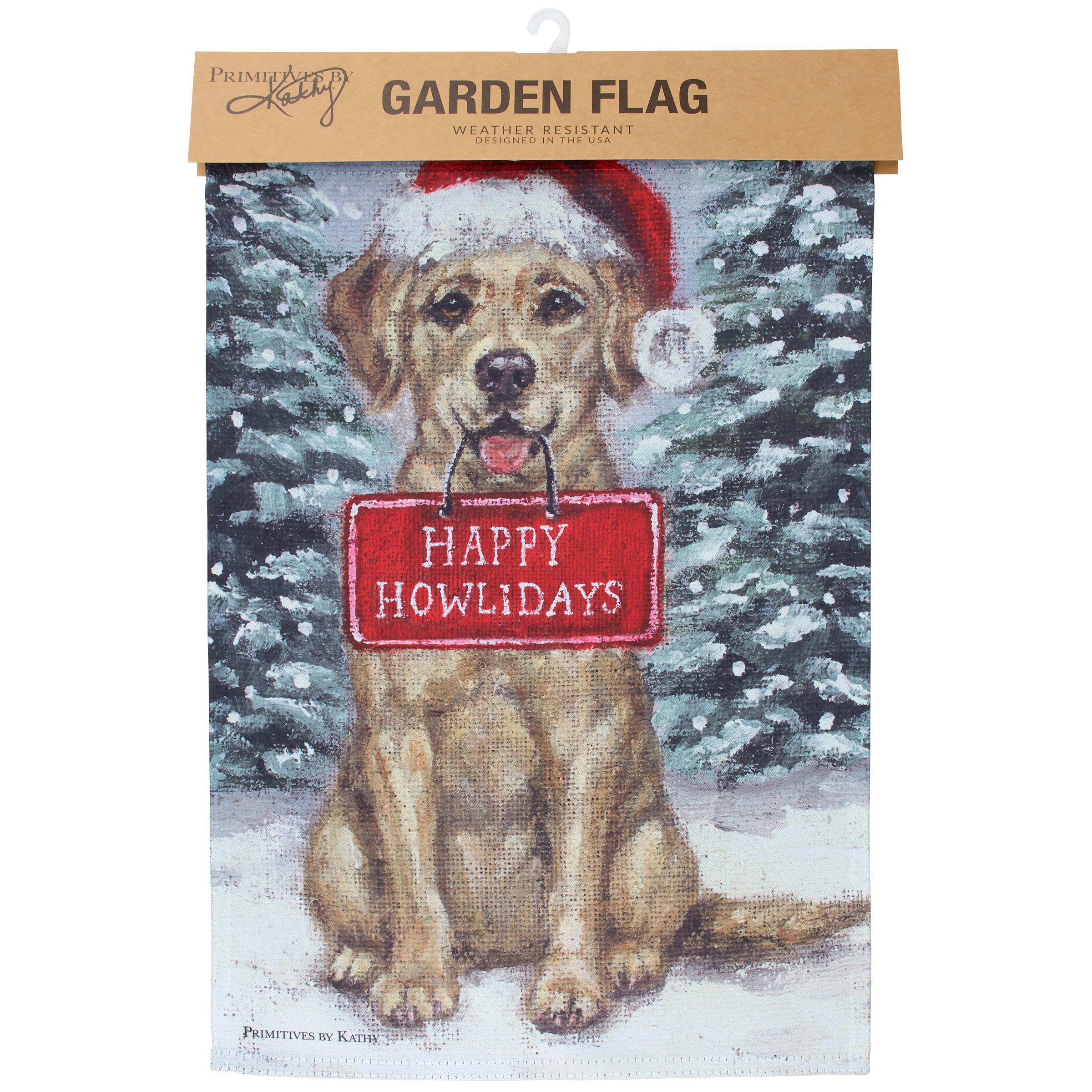 A polyester garden flag from our Holiday Pet Collection featuring a double-sided design displaying a charming winter scene of a Yellow Labrador wearing a Santa hat and holding a sign that reads "Happy Howlidays" for a fun combination of a love for Christmas and pets. Christmas Yellow Labrador design is replicated from original artwork painted onto burlap canvas, giving the art a unique depth and texture. Seasonal garden flag is weather-resistant and features an opening to hang on our Garden Flag Pole. Hand-wash only. Our Yellow Lab Happy Howlidays garden flag is packaged with a header card and hook to easily hang on rack for store display. A fun dog themed home accent perfect for seasonal display in any yard or garden.