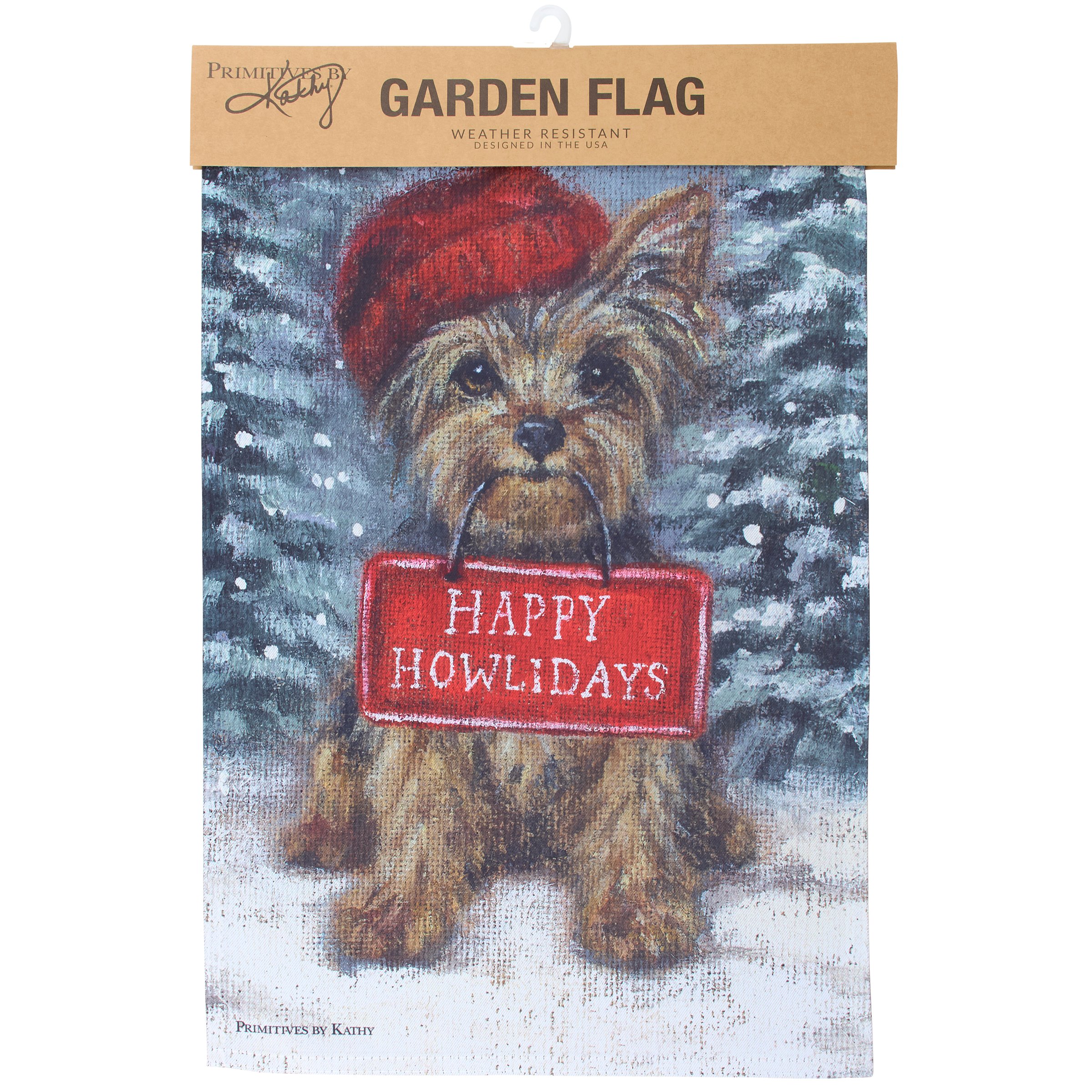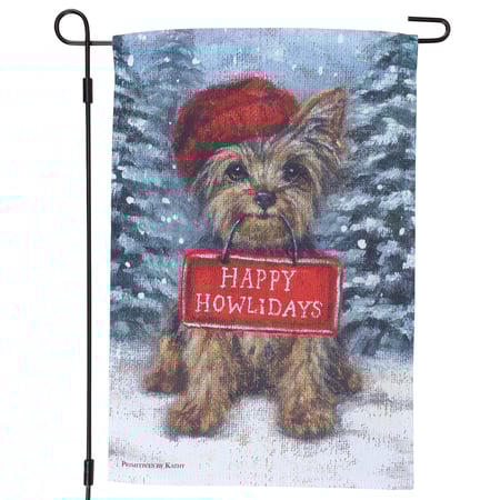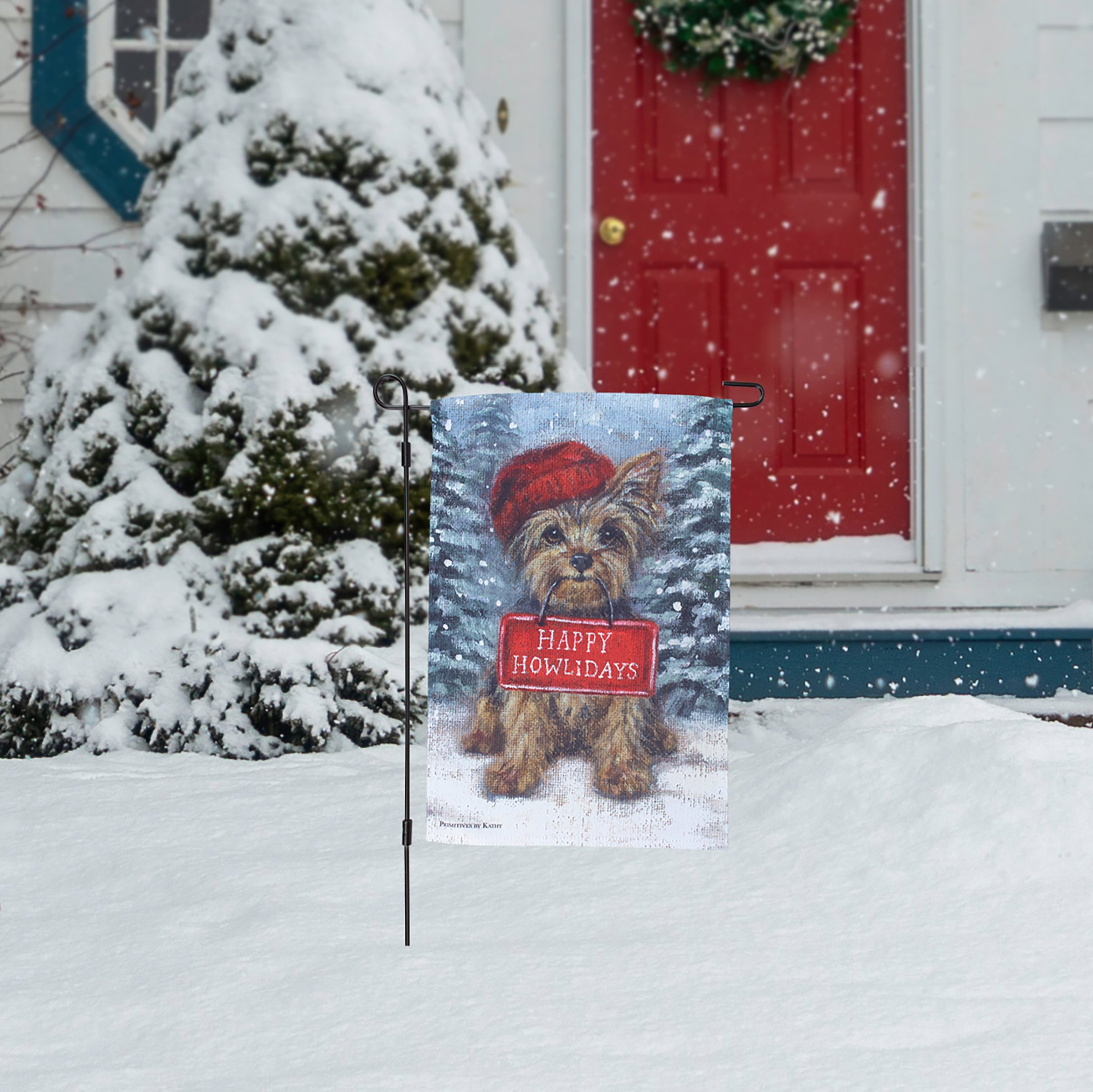 A polyester garden flag from our Holiday Pet Collection featuring a double-sided design displaying a charming winter scene of a Yorkie dog wearing a winter hat and holding a sign that reads "Happy Howlidays" for a fun combination of a love for Christmas and pets. Christmas Yorkie design is replicated from original artwork painted onto burlap canvas, giving the art a unique depth and texture. Seasonal garden flag is weather-resistant and features an opening to hang on our Garden Flag Pole. Hand-wash only. Our Yorkie Happy Howlidays garden flag is packaged with a header card and hook to easily hang on rack for store display. A fun dog themed home accent perfect for seasonal display in any yard or garden.