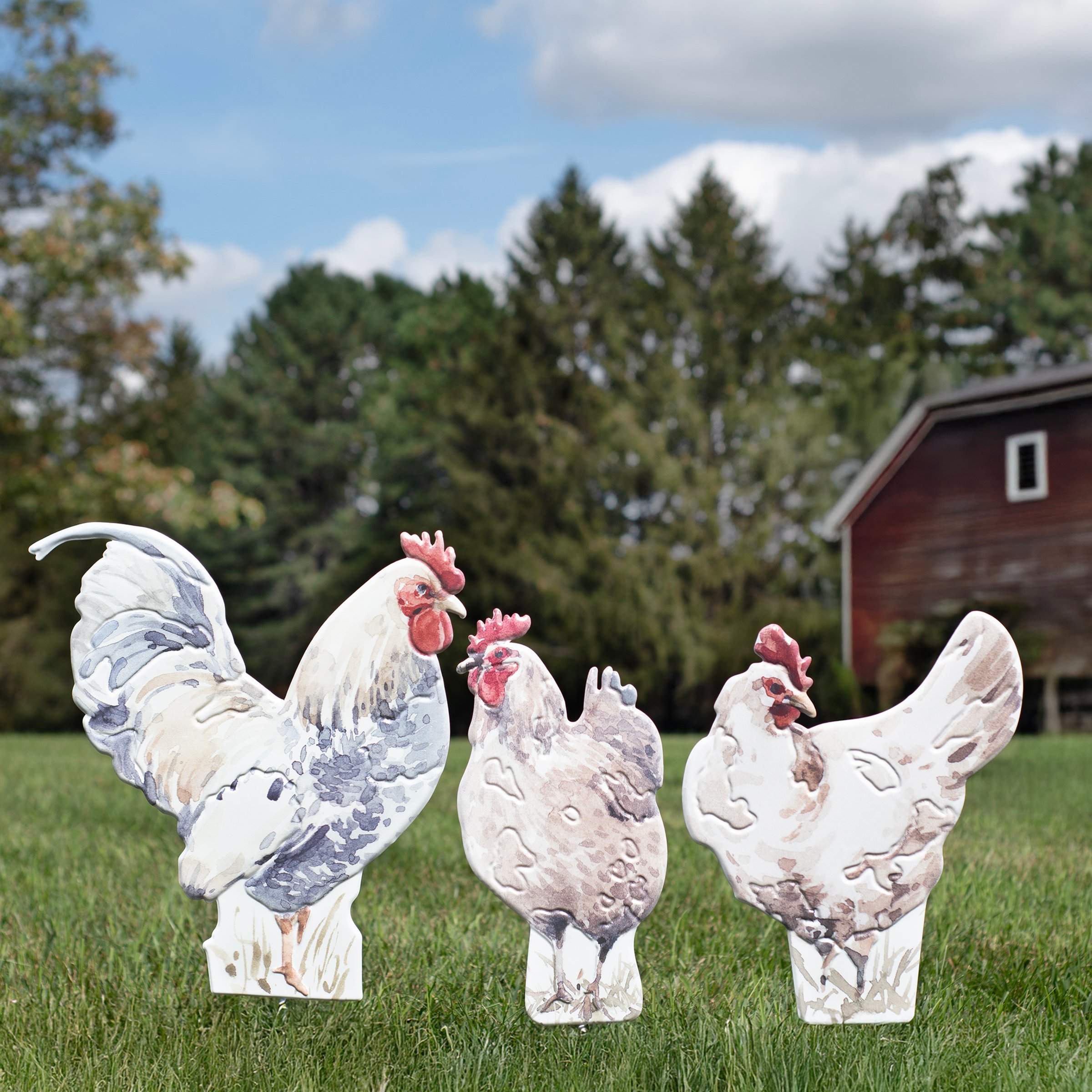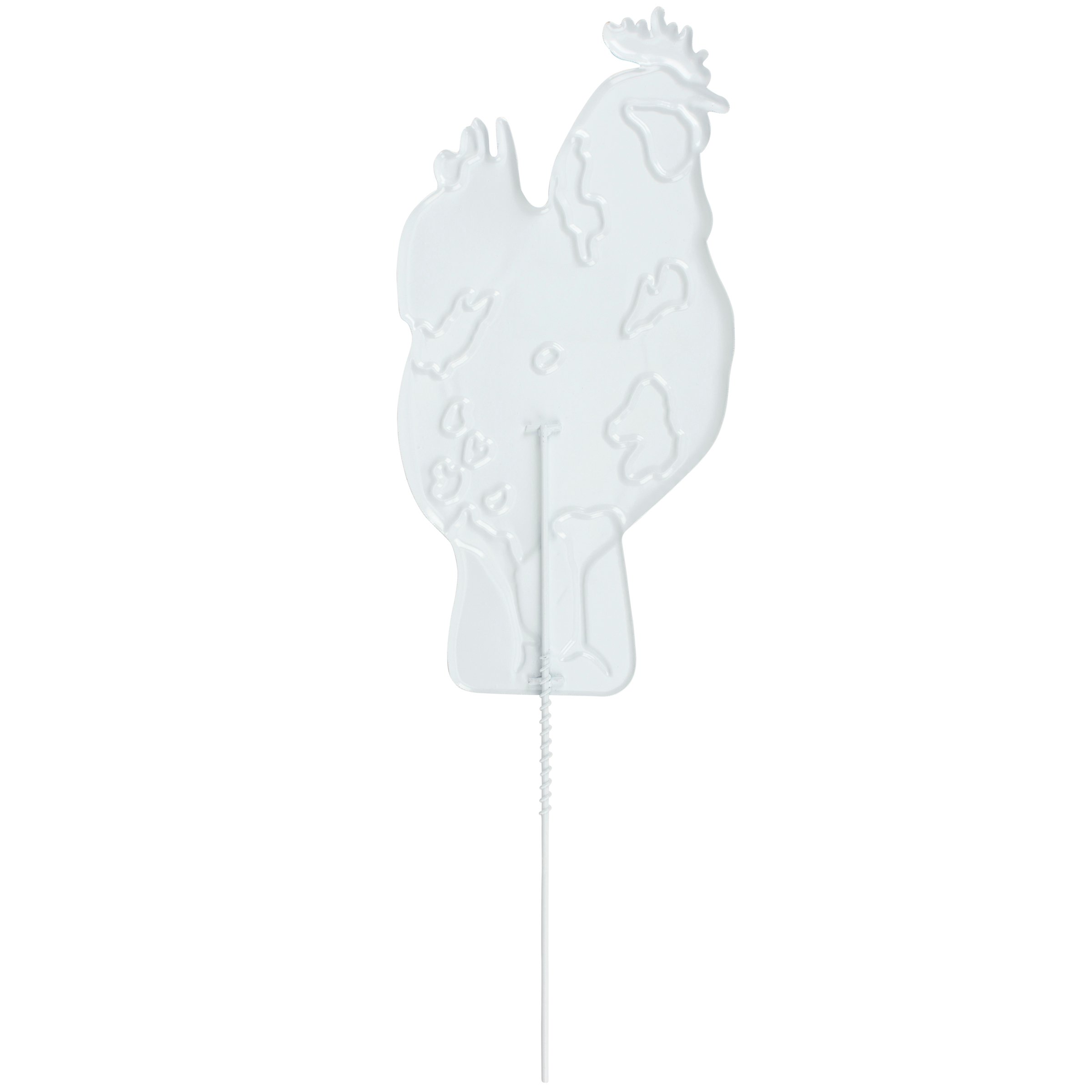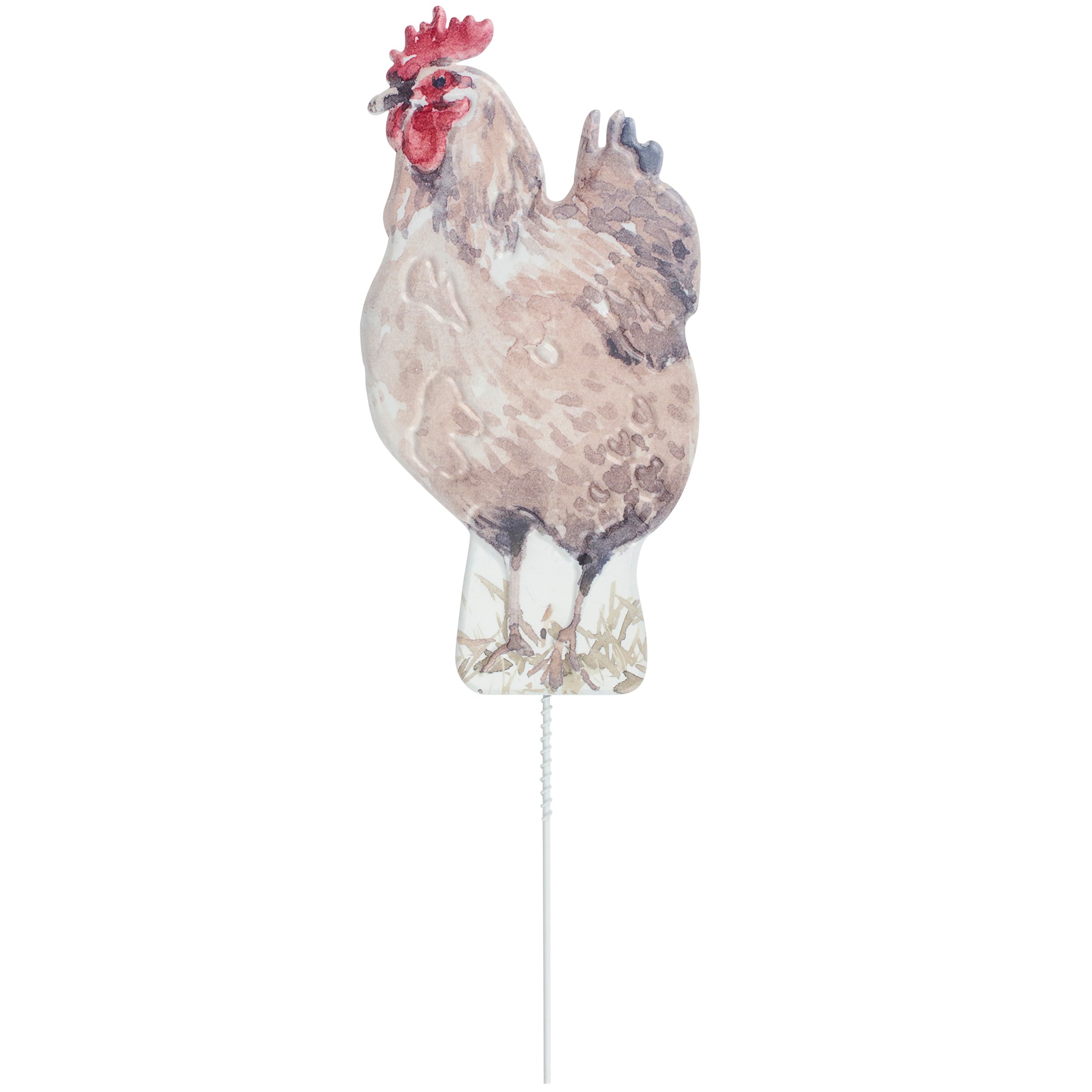 A decorative metal pick from our Farmhouse Collection featuring a metal cutout piece in the shape of the displayed brown chicken art that is attached to a white metal stake. Farm chicken design is replicated from original artwork hand painted in a delicate watercolor style with embossed details for added dimension. Our Brown Chicken garden pick stands over 22 inches tall to easily stand out in a garden or yard. A farm themed garden accent perfect for adding character to any outdoor display.