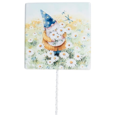 A metal pick from our Garden Collection displaying a design of a cheerful gnome gathering daisies and looking at blue dragonflies hand painted in a delicate watercolor style. Design is attached to a coordinating white stake. Our Daisy Gnome pick includes a 15 inch stake to easily stand out in a garden or decorative vessel. A charming outdoor accent perfect for seasonal display.