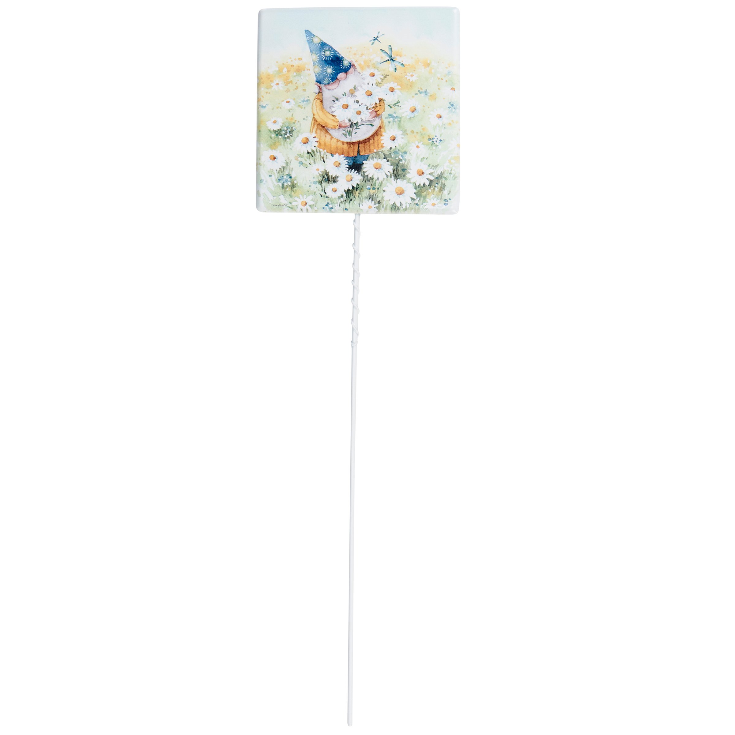A metal pick from our Garden Collection displaying a design of a cheerful gnome gathering daisies and looking at blue dragonflies hand painted in a delicate watercolor style. Design is attached to a coordinating white stake. Our Daisy Gnome pick includes a 15 inch stake to easily stand out in a garden or decorative vessel. A charming outdoor accent perfect for seasonal display.