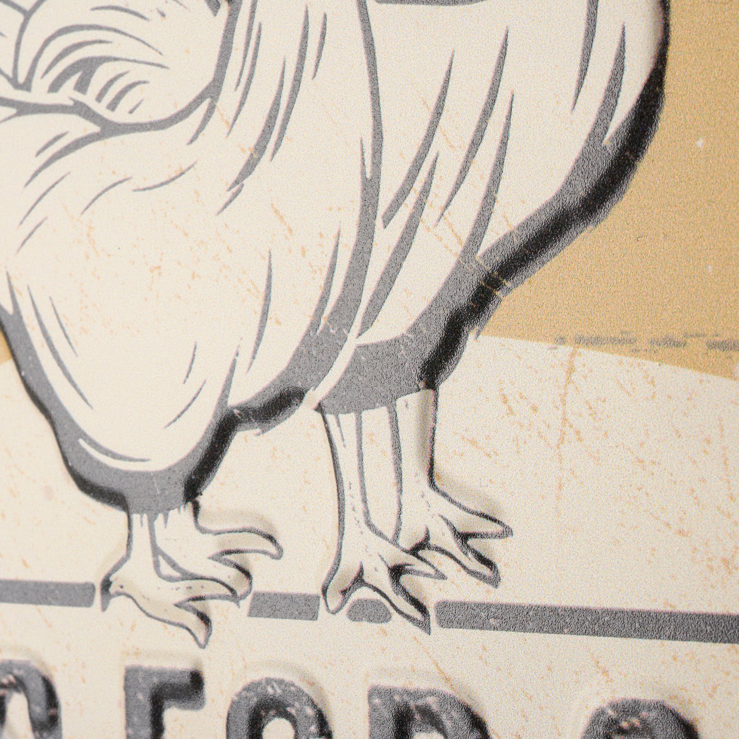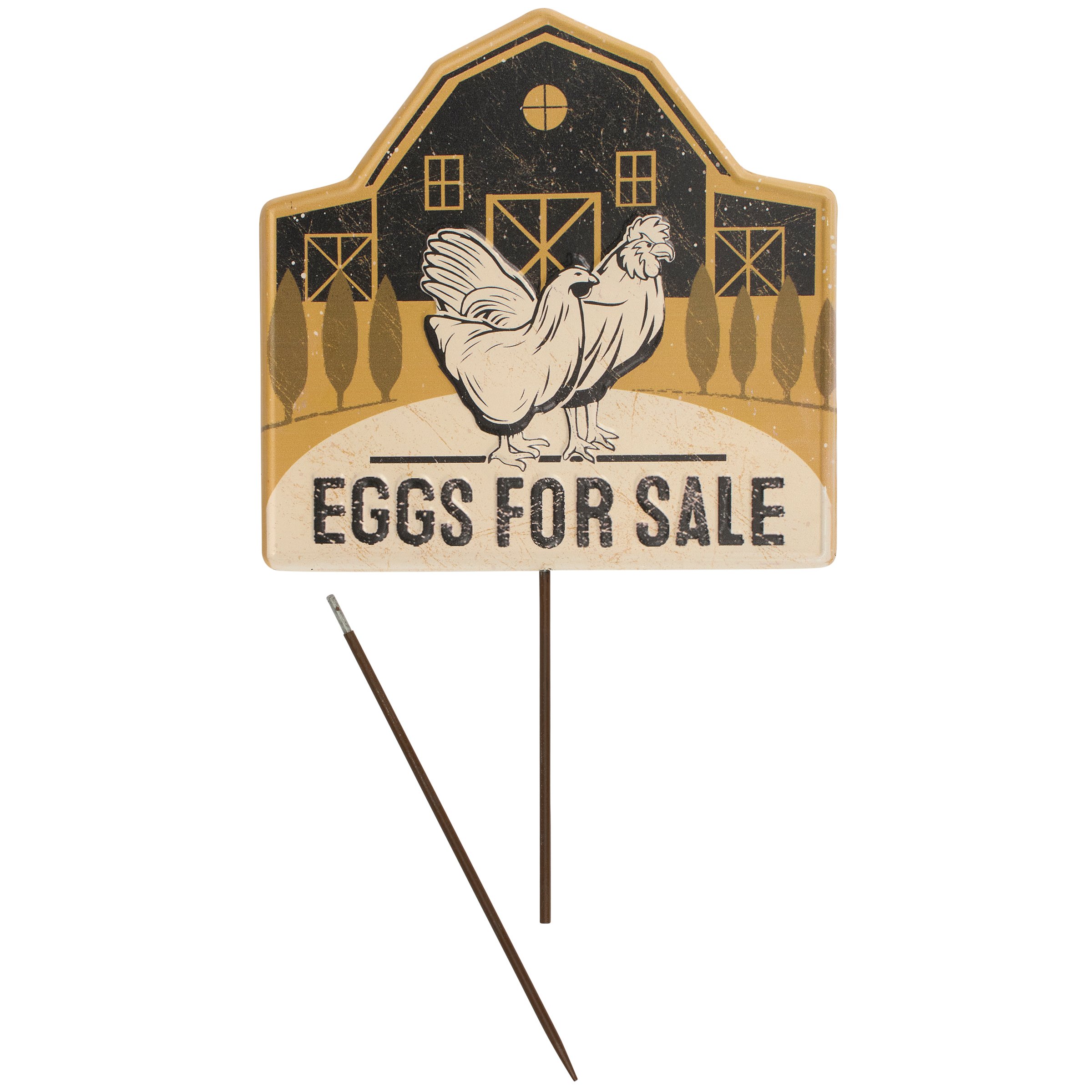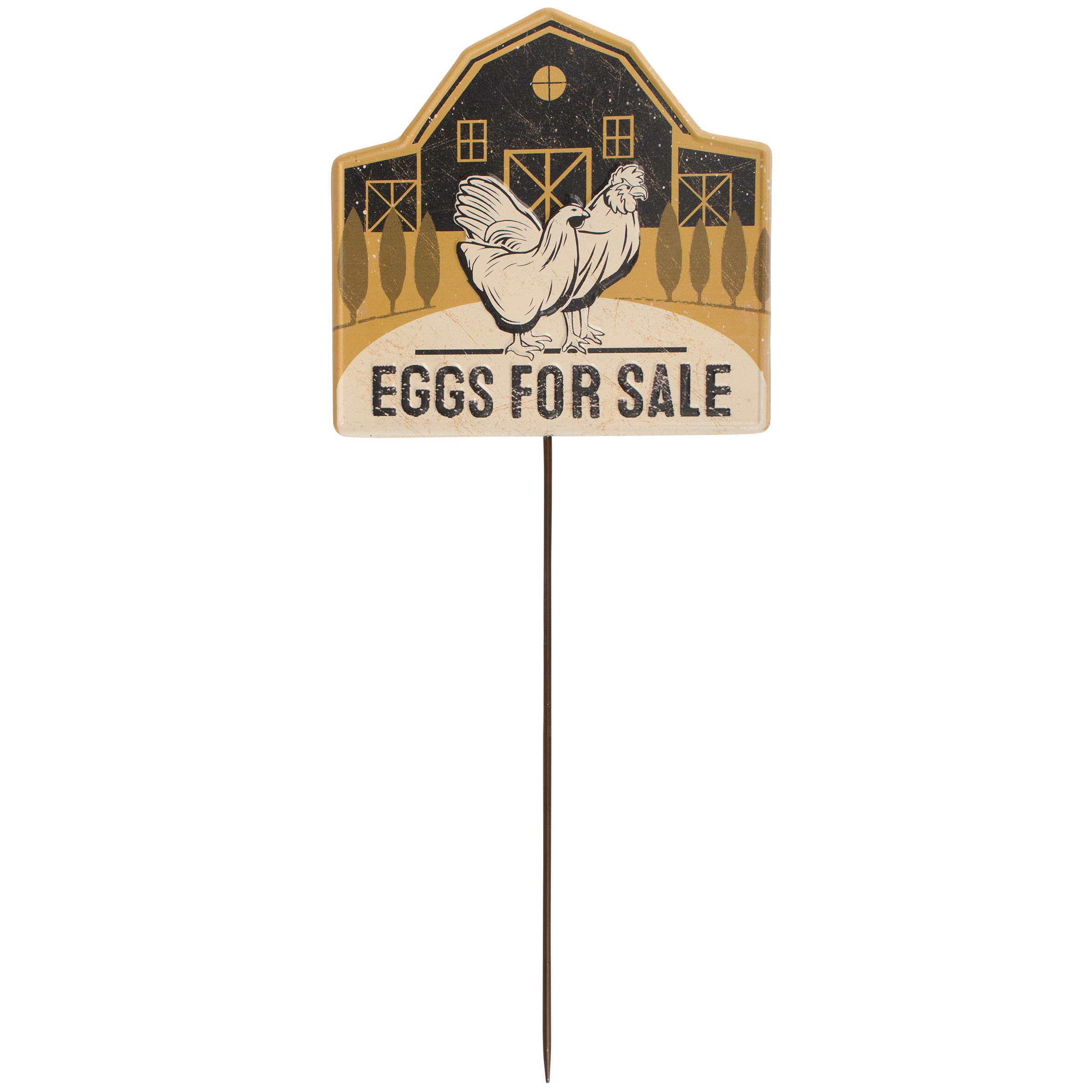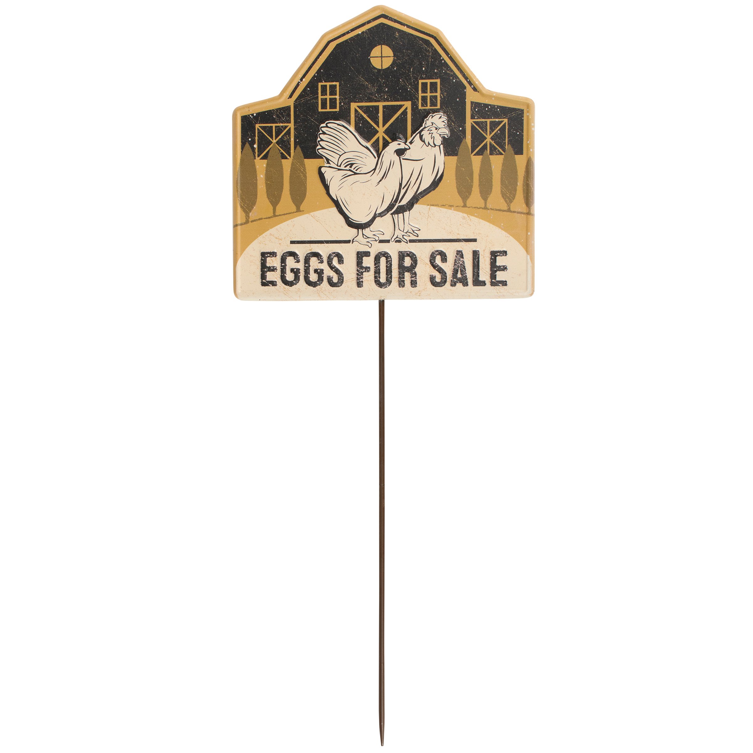 A decorative metal pick from our Homestead Collection displaying a rustic design of a chicken and rooster in front of a barn with a farm inspired sentiment that reads "Eggs For Sale." Homestead design features embossed details as well as a rust finish for an aged appearance. Our Eggs For Sale garden pick includes an 18 inch stake to easily stand out in a garden or yard. A rustic garden accent perfect for adding character to any outdoor display.