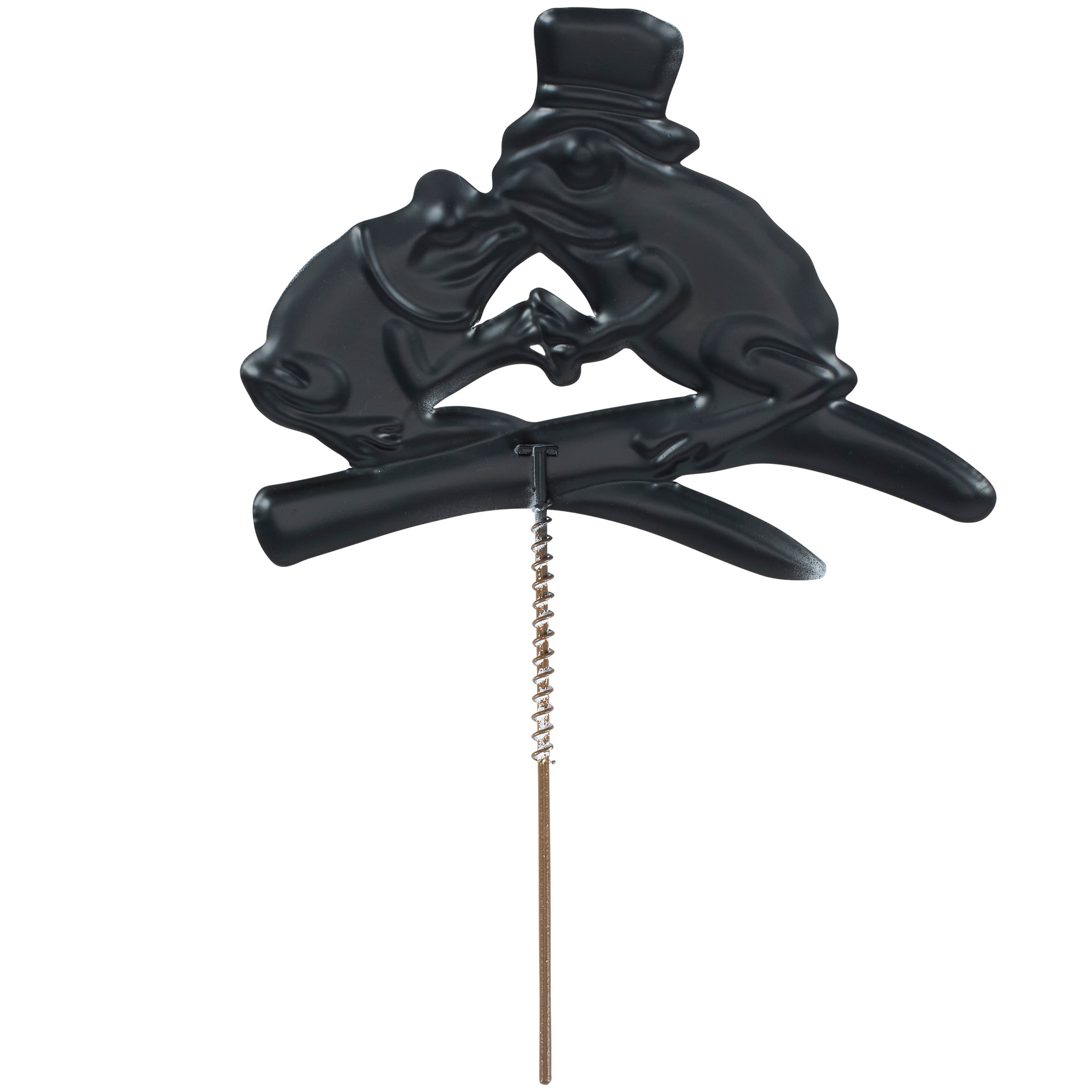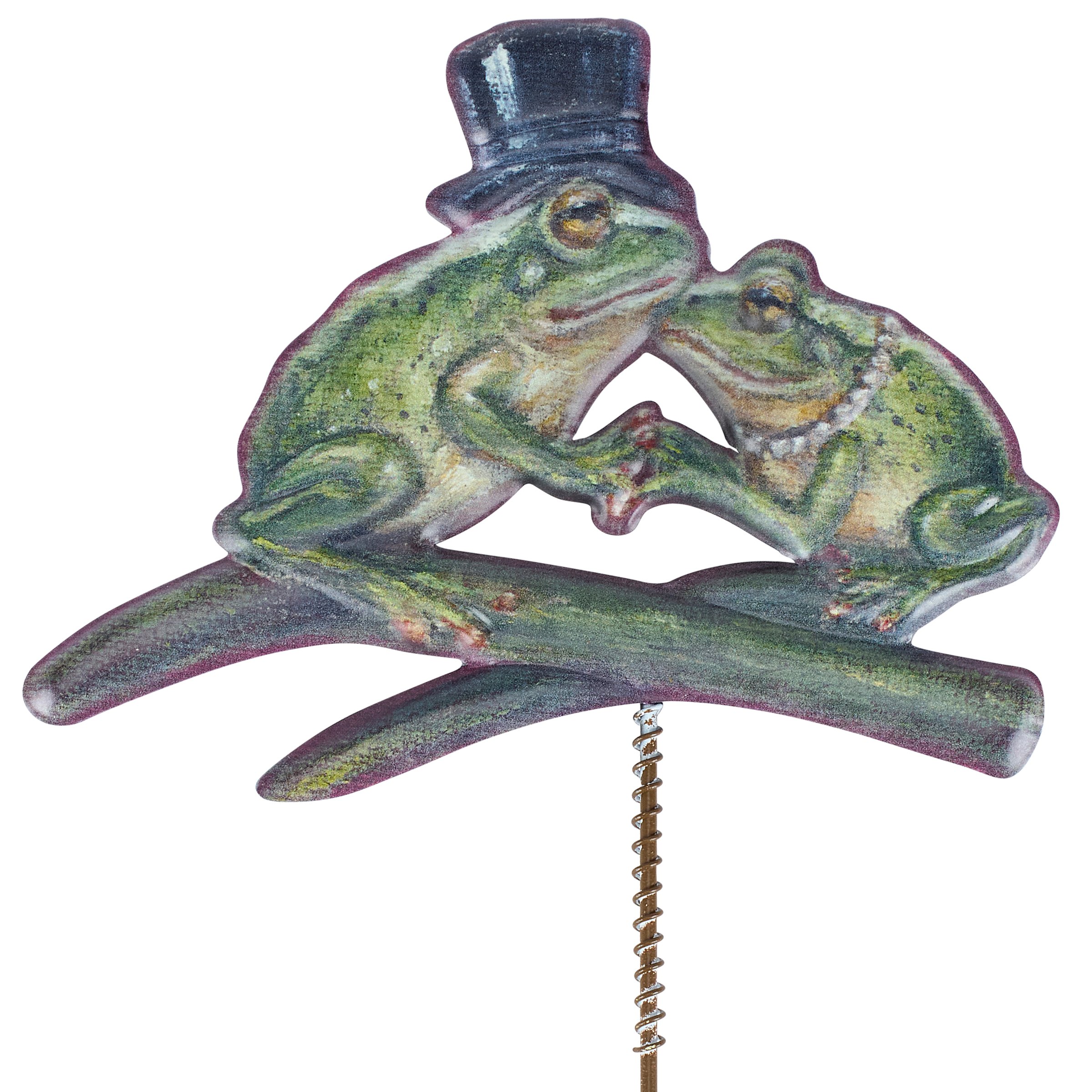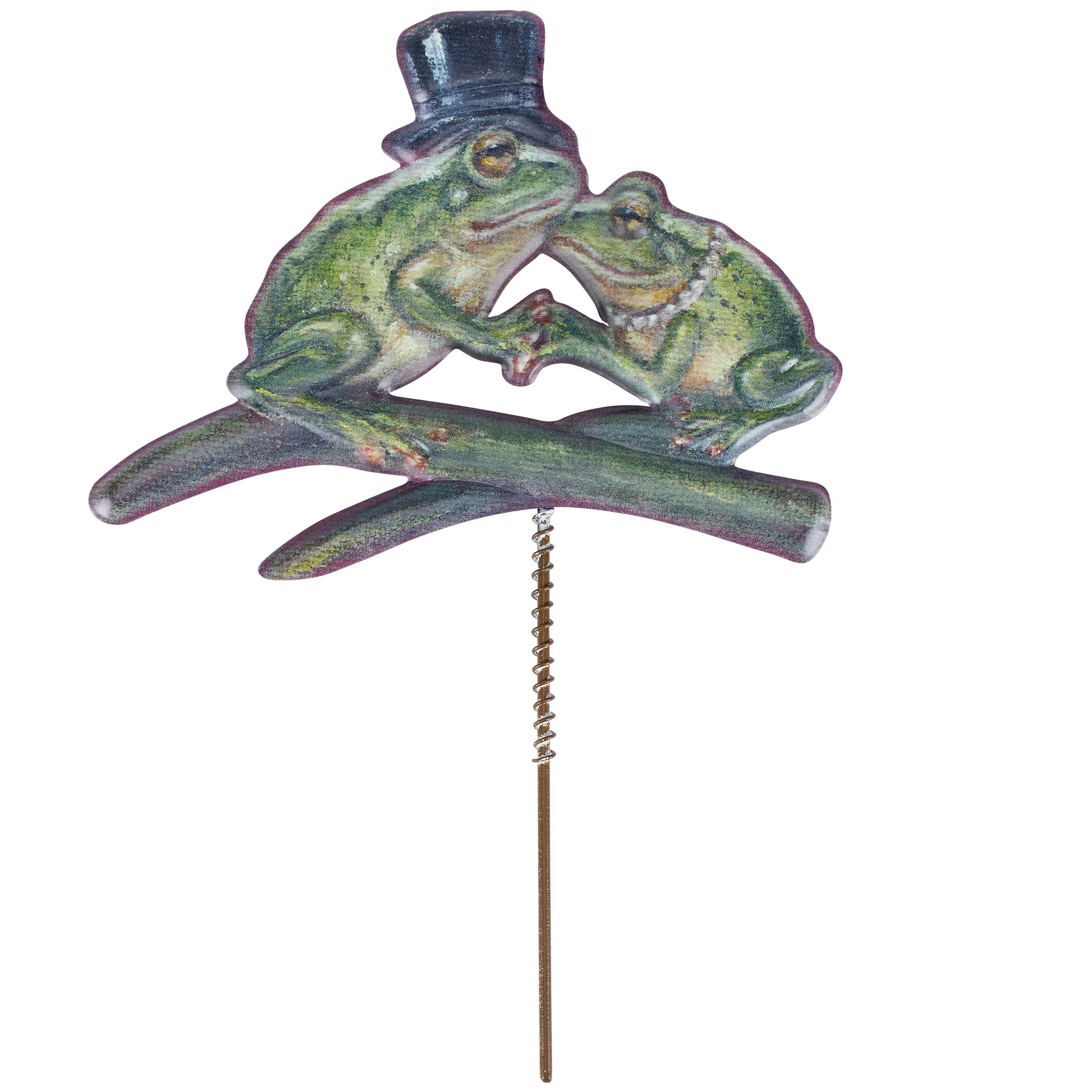 A decorative garden pick from our Garden Collection featuring a metal display piece cutout in the shape of the love inspired animal art attached to a metal stake. Valentine's Day inspired art features a heartwarming scene of a fancy frog couple with embossed details for added dimension. Frog couple design is replicated from original artwork painted onto burlap canvas, giving the art a unique depth and texture. Our Frog Love garden pick stands over 15 inches tall to easily stand out in a garden or decorative vessel. A fun love-themed garden accent perfect for adding character to any garden or yard display.