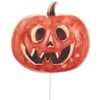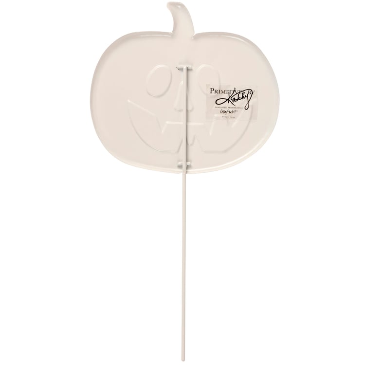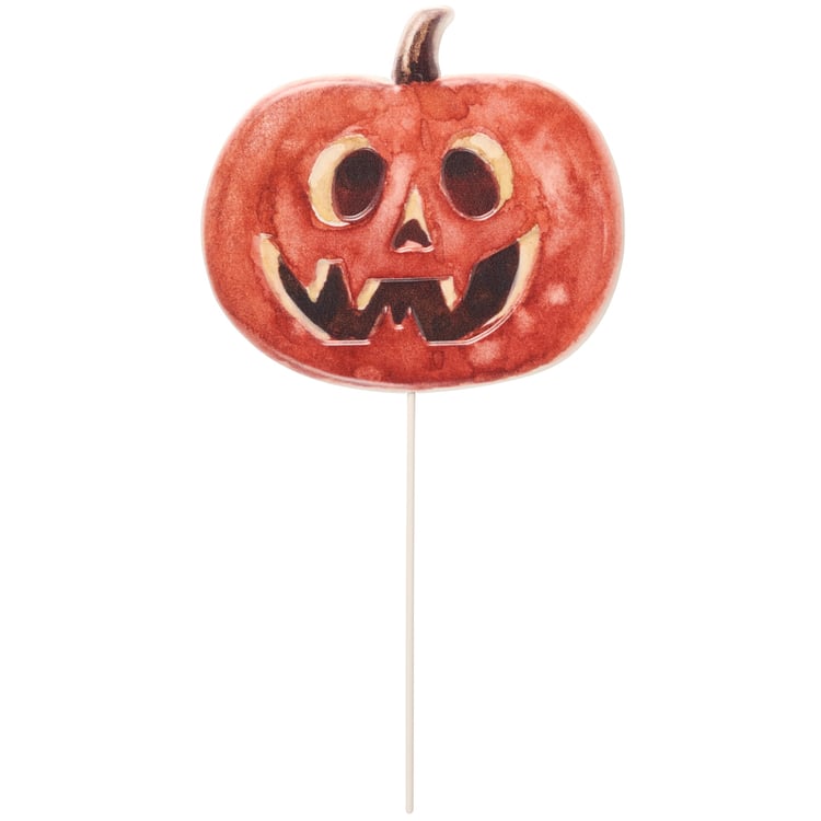 A metal garden pick from our Halloween Collection displaying a cutout of a jack o'lantern design with embossed details. Jack o'lantern design is replicated from original art hand painted in a delicate watercolor style. Our Jack O'Lantern garden pick includes an 8 inch stake to easily stand out in a garden or seasonal vessel. A charming Halloween home accent perfect for seasonal display.