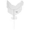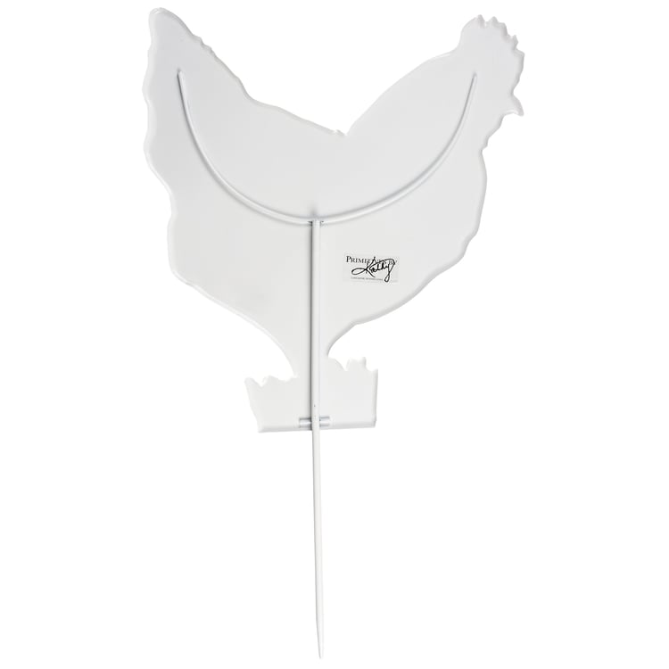 A metal pick from our Farmhouse Collection displaying a hand painted design in the shape of a Plymouth Rock chicken standing in grass attached to a white stake. Design is replicated from original artwork painted onto burlap canvas, giving the art a unique depth and texture. Our Plymouth Rock Chicken garden pick includes a stake to easily display in a garden or decorative vessel. A rustic outdoor accent perfect for everyday display.