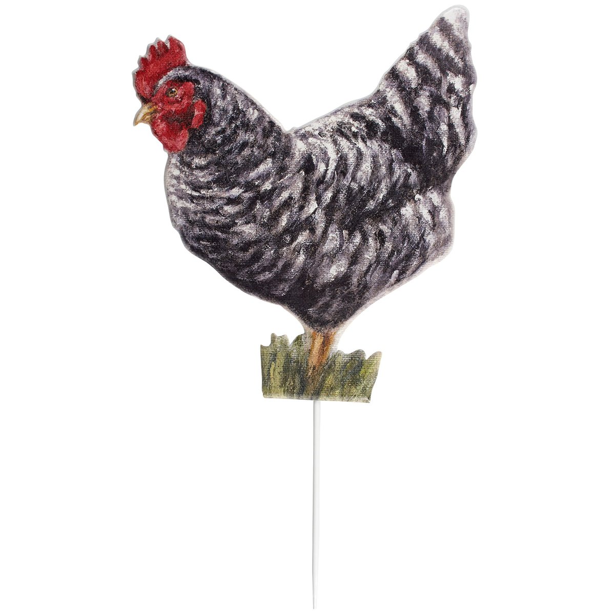 A metal pick from our Farmhouse Collection displaying a hand painted design in the shape of a Plymouth Rock chicken standing in grass attached to a white stake. Design is replicated from original artwork painted onto burlap canvas, giving the art a unique depth and texture. Our Plymouth Rock Chicken garden pick includes a stake to easily display in a garden or decorative vessel. A rustic outdoor accent perfect for everyday display.