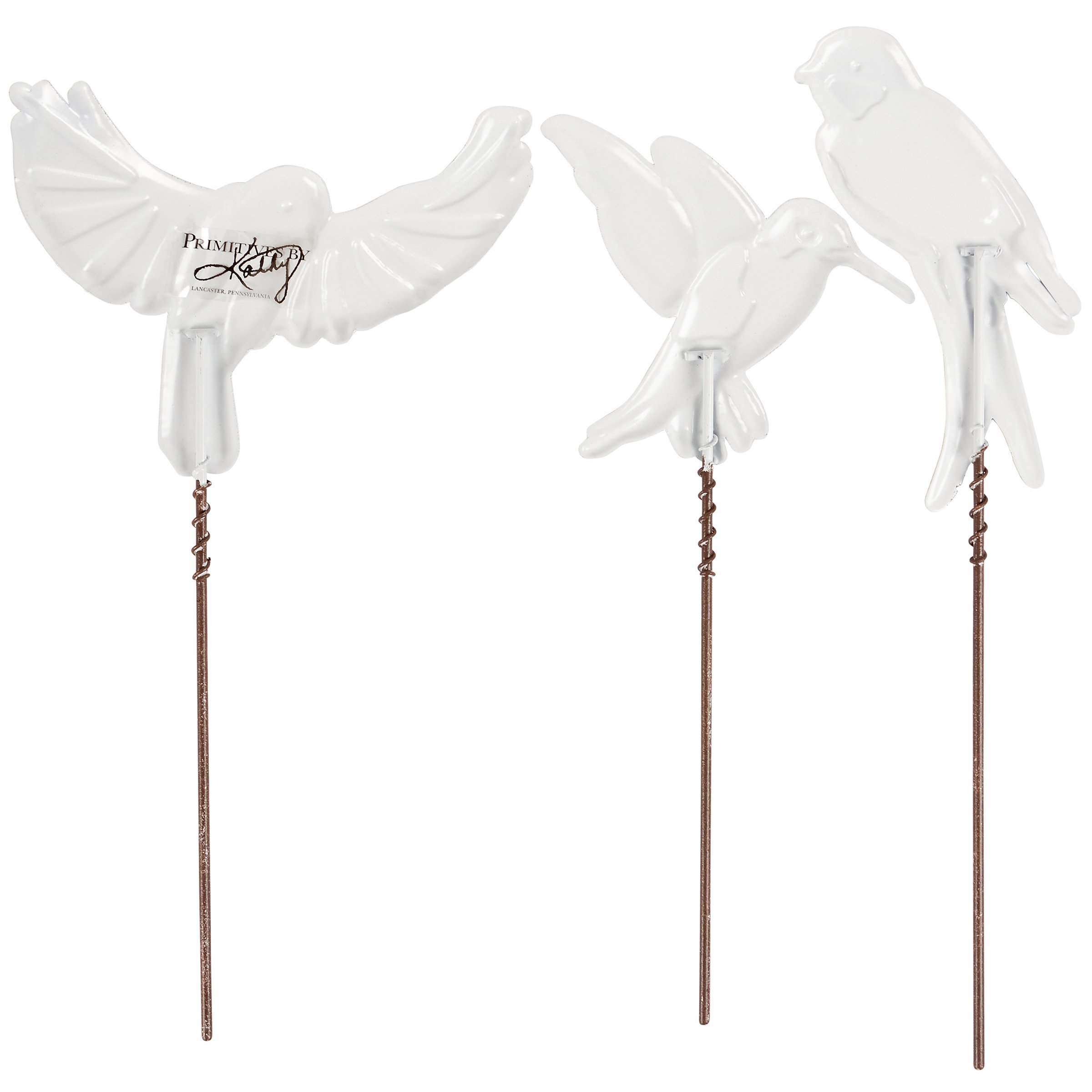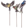 A metal pick set from our Art Nouveau Collection including three individual cutout designs displaying a hummingbird, swallow, and finch with embossed details. Each bird design is replicated from original artwork painted onto burlap canvas, giving the art a unique depth and texture. Our Bird garden pick set features 8 inch stakes on each to easily stand out in a garden or yard. A set of nature-themed home accents perfect for everyday display.