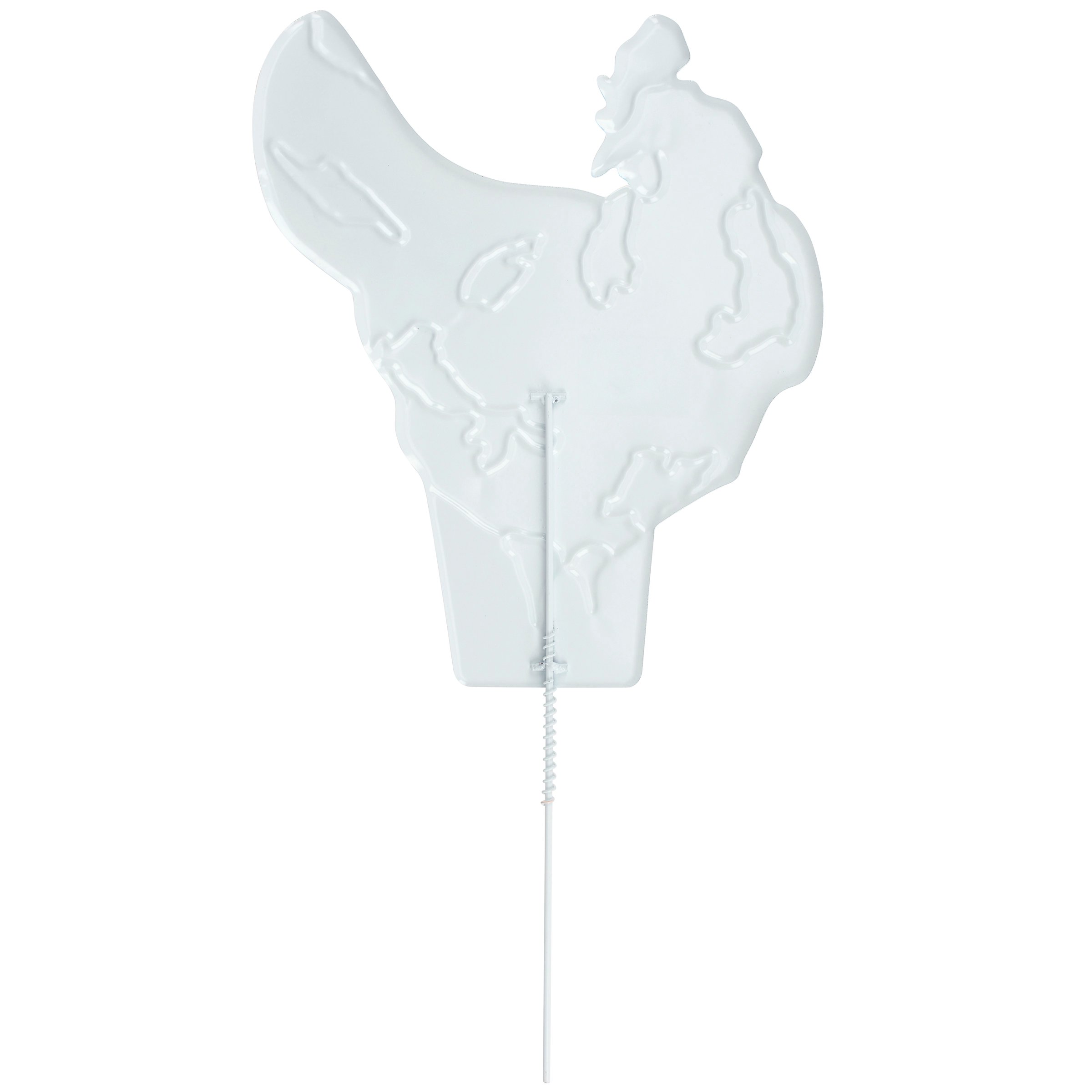 A decorative metal pick from our Farmhouse Collection featuring a metal cutout piece in the shape of the displayed white chicken art that is attached to a white metal stake. Farm chicken design is replicated from original artwork hand painted in a delicate watercolor style with embossed details for added dimension. Our White Chicken garden pick stands 22 inches tall to easily stand out in a garden or yard. A farm themed garden accent perfect for adding character to any outdoor display.