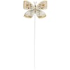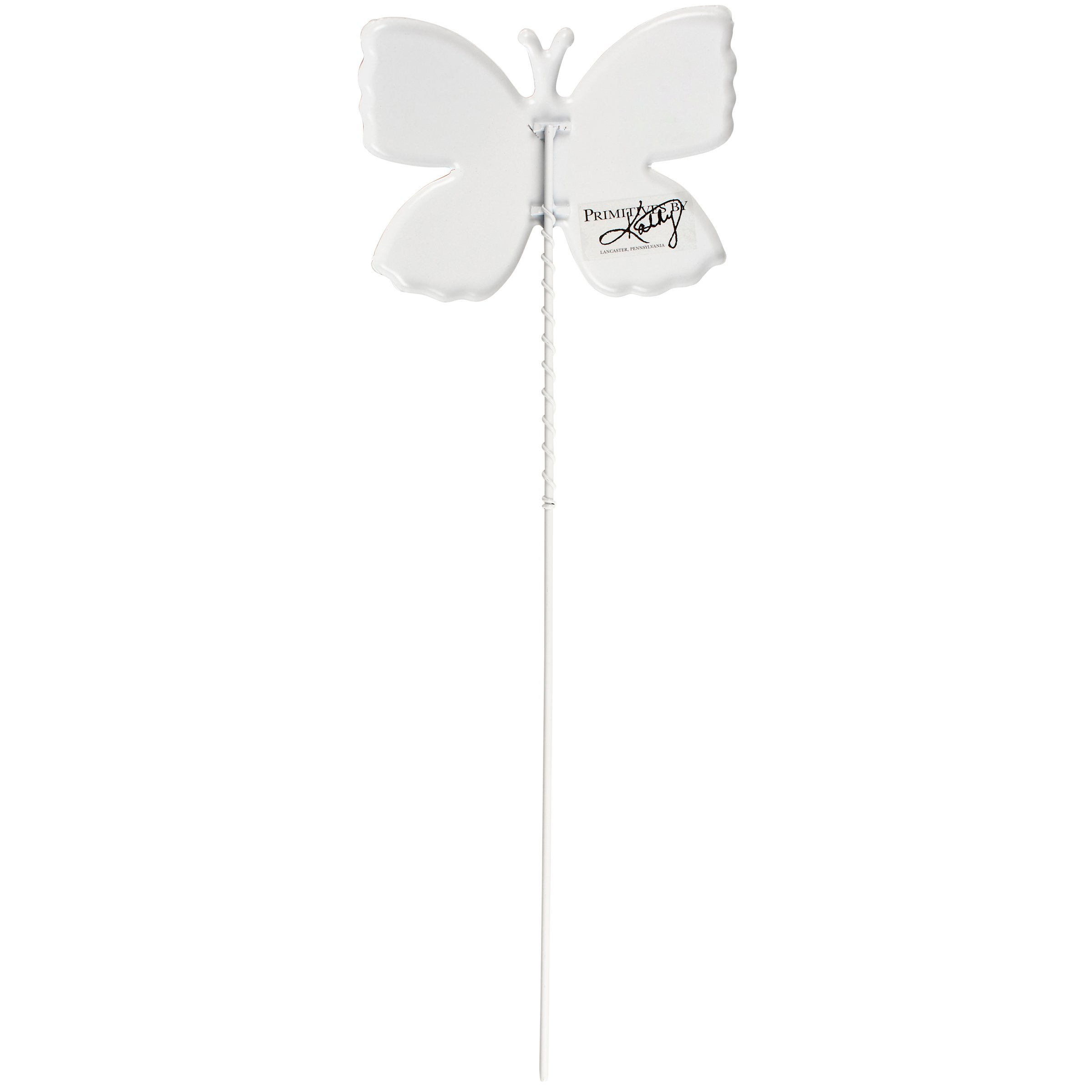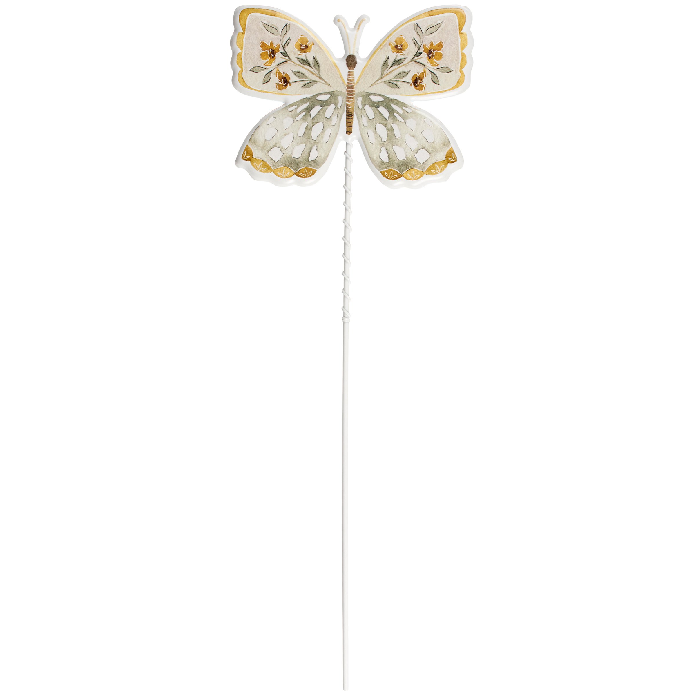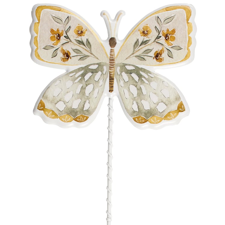 A metal pick from our Garden Collection displaying a design of a butterfly with floral details hand painted in a watercolor style. Design is attached to a coordinating white stake. Our Yellow Butterfly pick includes a 15 inch stake to easily stand out in a garden or decorative vessel. A charming outdoor accent perfect for everyday display.