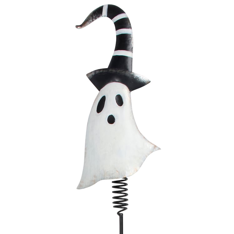 A decorative metal pick from our Halloween Collection featuring a metal cutout piece in the shape of the displayed art of a ghost wearing a whimsical hat. Whimsical ghost design also features dimensional details and is attached to a black metal stake with a sturdy spring at the top for added motion. Assembly required for display. Our Whimsical Ghost garden pick is over 50 inches tall to easily stand out in a garden or yard. A whimsical Halloween garden accent perfect for adding seasonal style to any outdoor display.