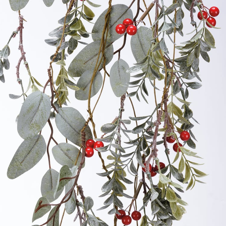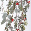 A garland featuring eucalyptus leaves and evergreen berries. Perfect accent for any table or mantel during the holiday and winter seasons.