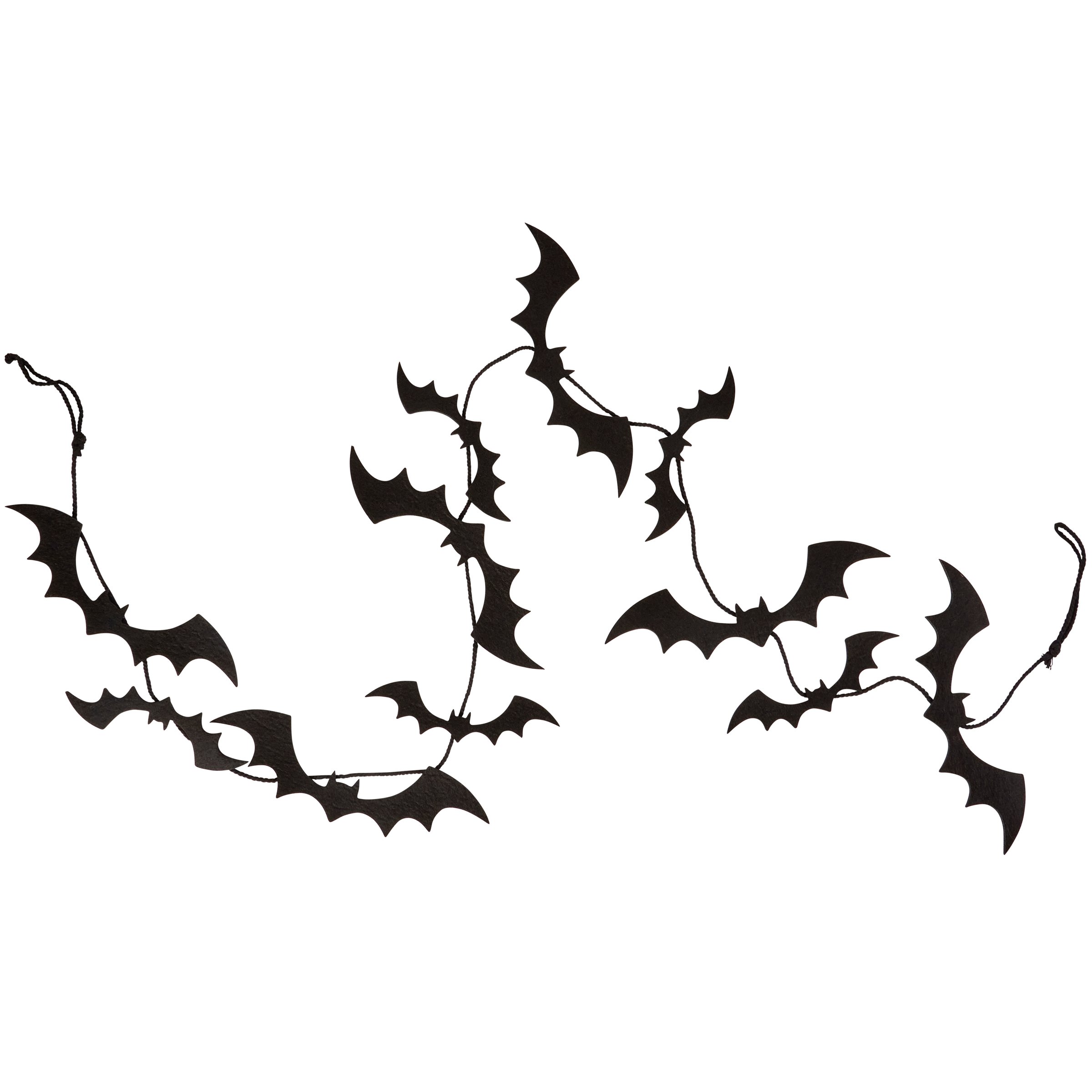 A decorative garland from our Halloween Collection displaying felt bats in various sizes along a black string. Seasonal garland features loops at each end for the option to hang and display. Our Felt Bat garland includes 71 inches of length for plenty of coverage. A seasonal home accent with a variety of display options.