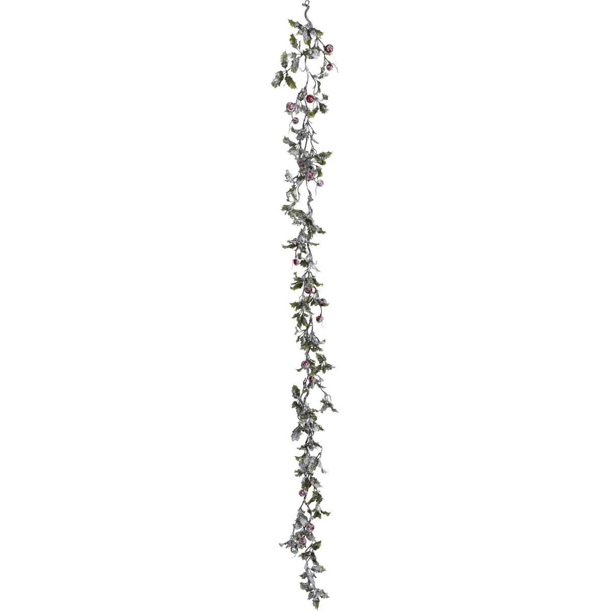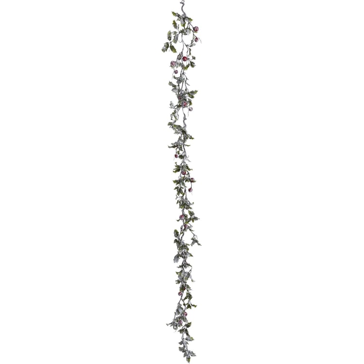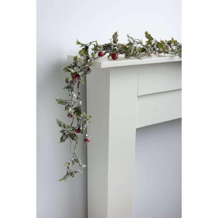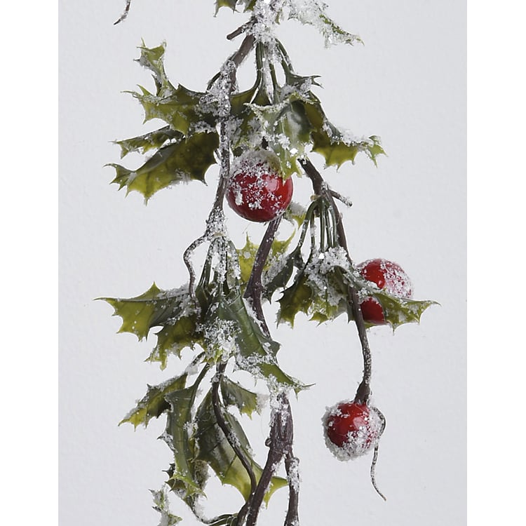 A holly garland featuring berries with a mica coating for a snowy effect. Our holly garland complements well with with decor from our Christmas Collection.