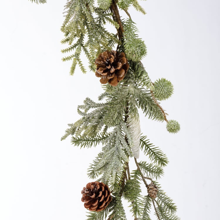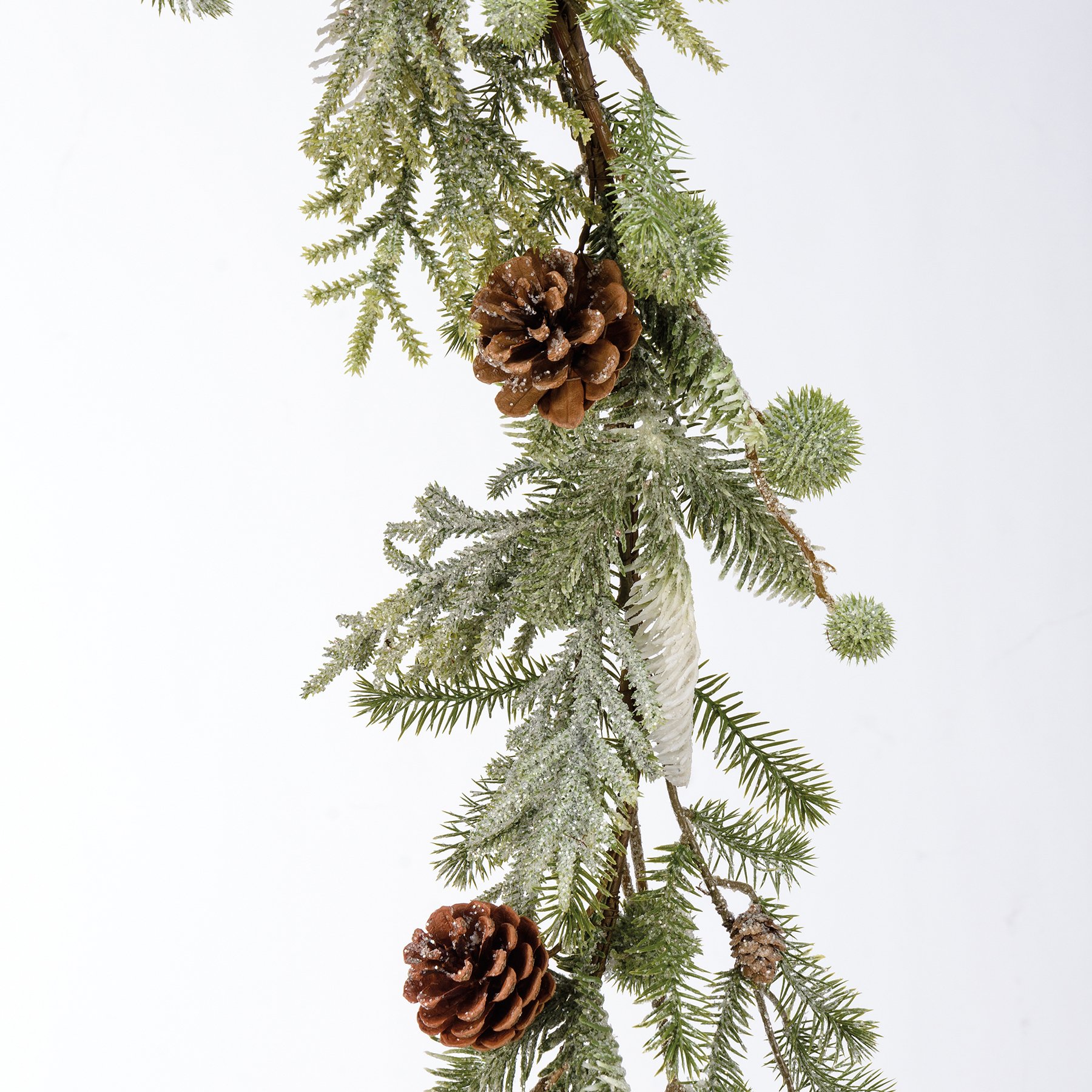 A mixed evergreen garland with pinecones and a glitter coating. Perfect accent for any table or mantel during the holiday and winter seasons.