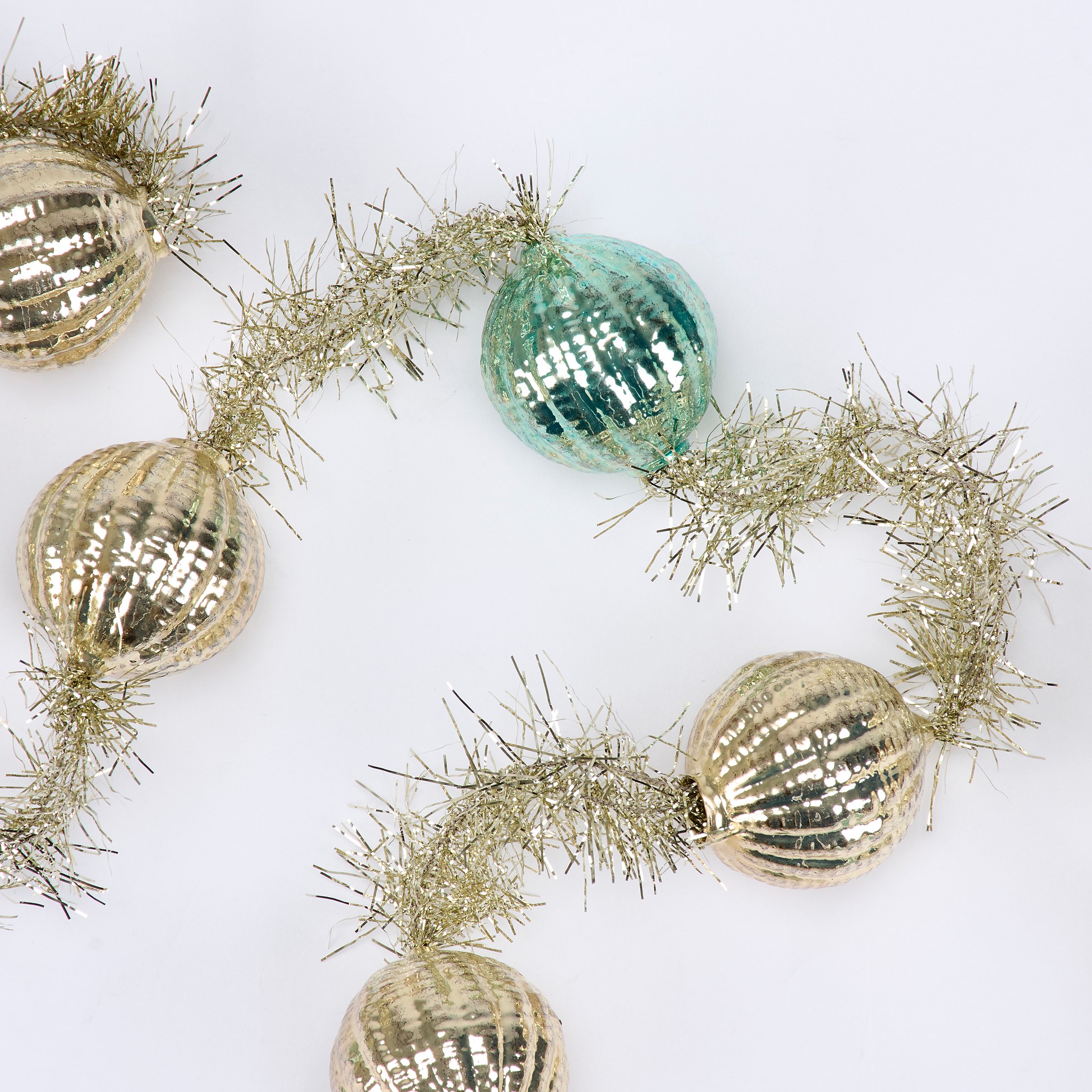 A decorative garland from our Christmas Collection displaying a retro pastel inspired design made with pastel blue and silver glass balls along silver tinsel. Our Pastel Balls garland includes 76 inches of length for plenty of coverage and is easy to hang for display via loop. This retro Christmas garland comes packaged neatly displayed in a cardboard box filled out with decorative paper stuffing and finished with an acrylic lid to easily view design. A retro pastel Christmas home accent with a variety of seasonal display options.
