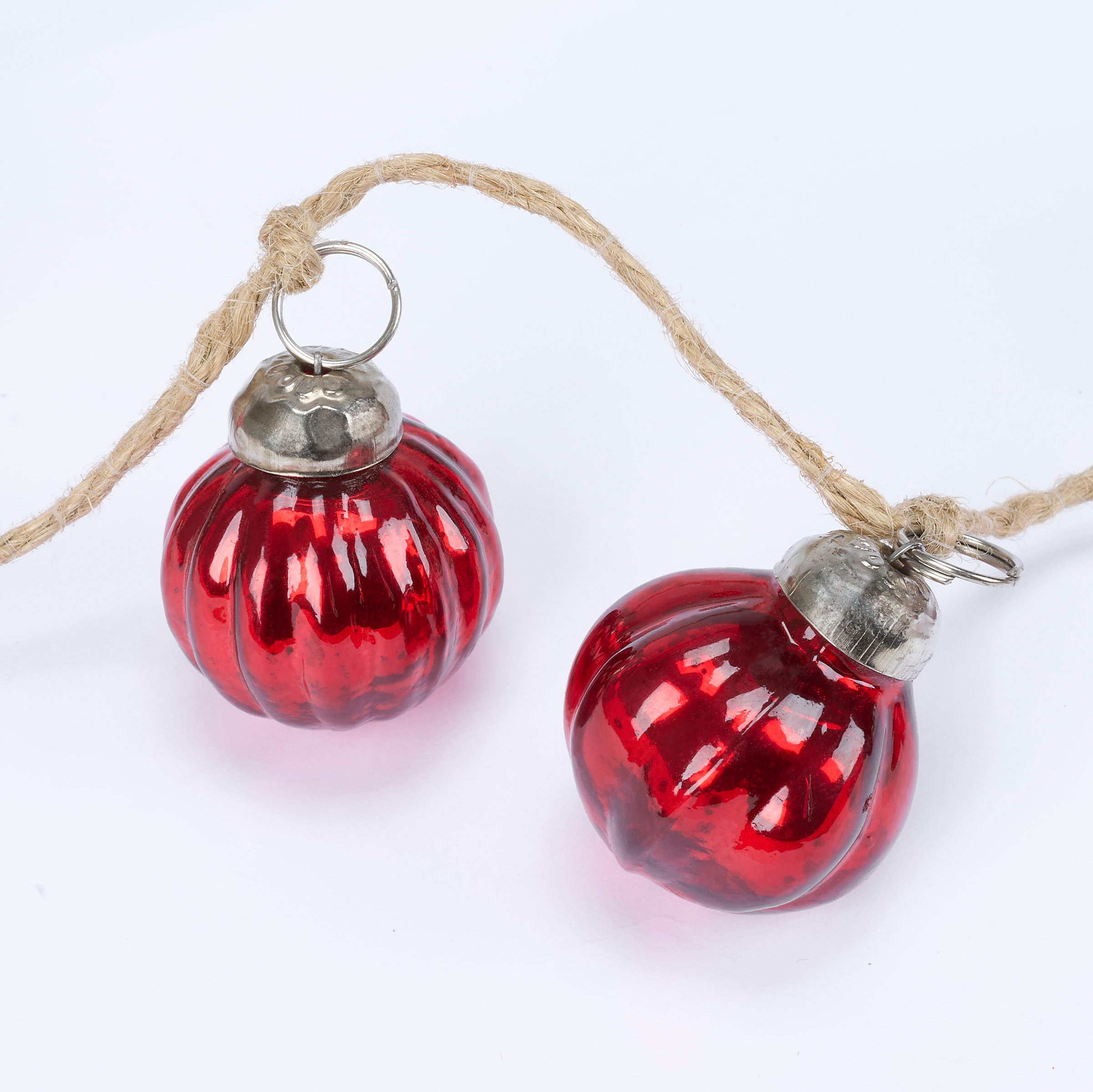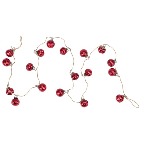 A decorative garland from our Christmas Collection displaying 18 miniature red baubles along a jute string. Our Red Baubles garland includes 70 inches of length for plenty of coverage and is easy to hang for display via loops at each end. This Christmas garland comes packaged neatly displayed in a cardboard box filled out with an acrylic window to easily view design. A classic Christmas home accent with a variety of seasonal display options.