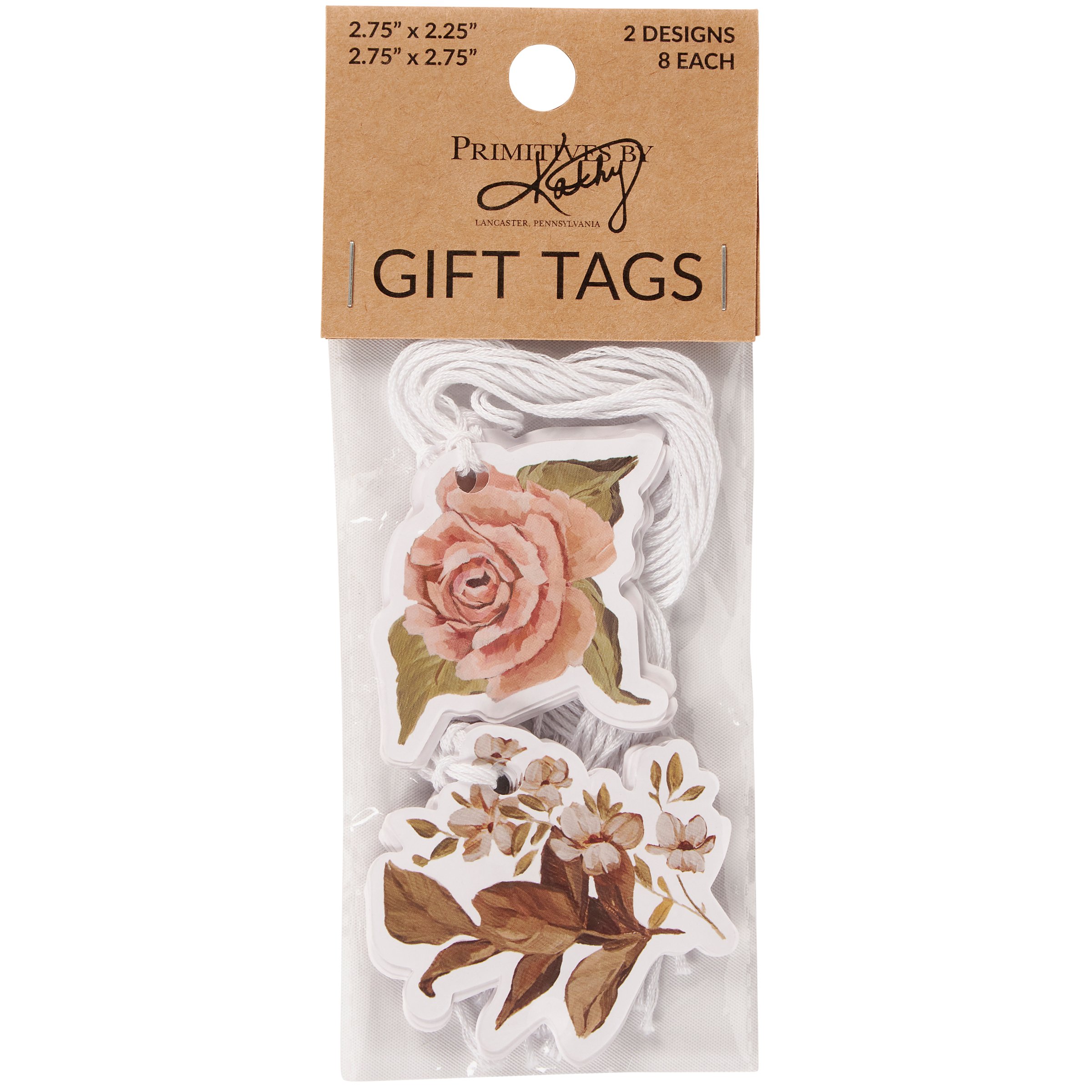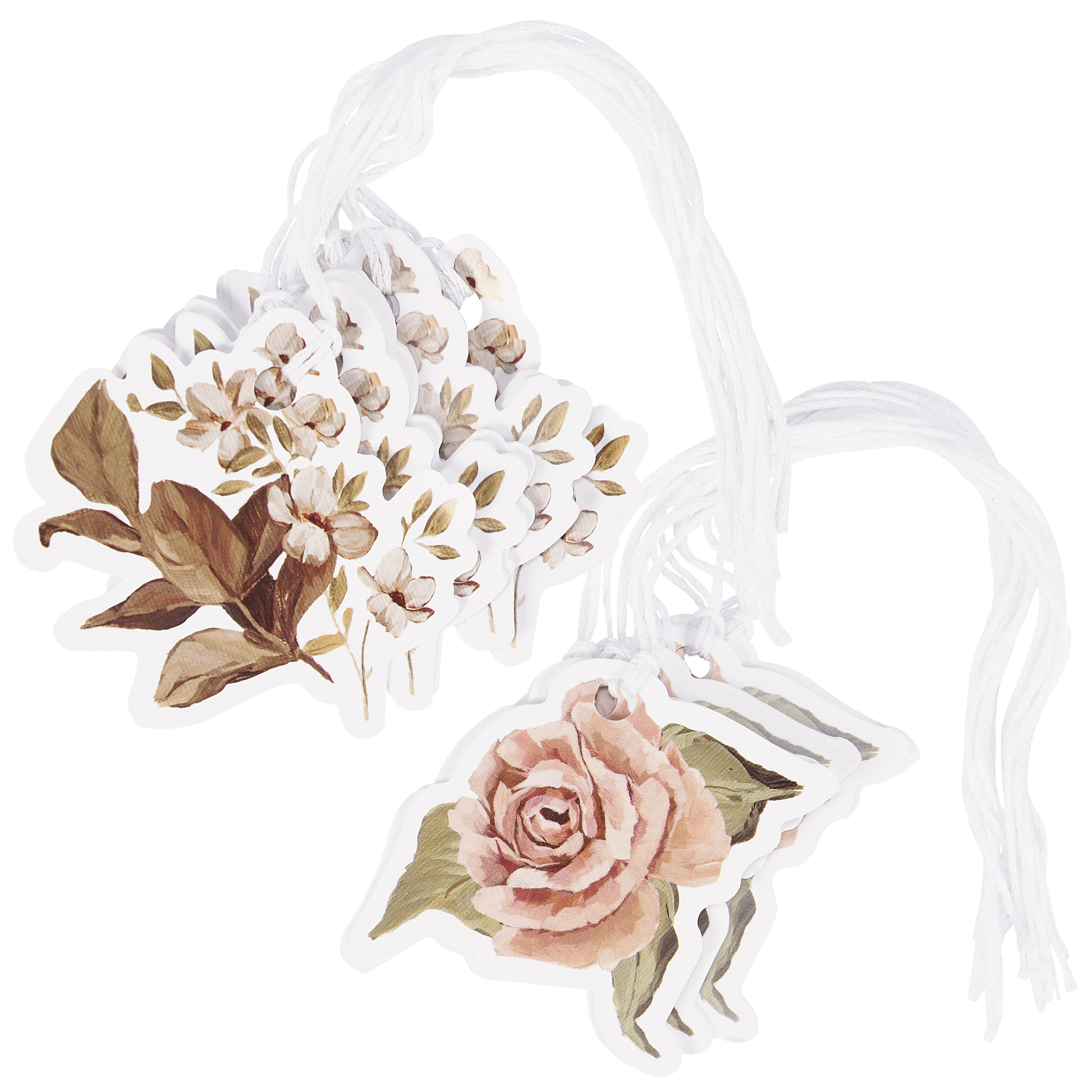 A set of paper gift tags from our Valentine's Day Collection displaying hand painted cabbage rose themed designs and space for a "To and From" message on the back. Set includes 16 tags with 8 of each design. Our Cabbage Rose gift tags each include an attached piece of white string to easily tie around gift. Gift tag set is packaged together in a poly bag with attached header card. A charming set of gift accessories perfect for seasonal moments.