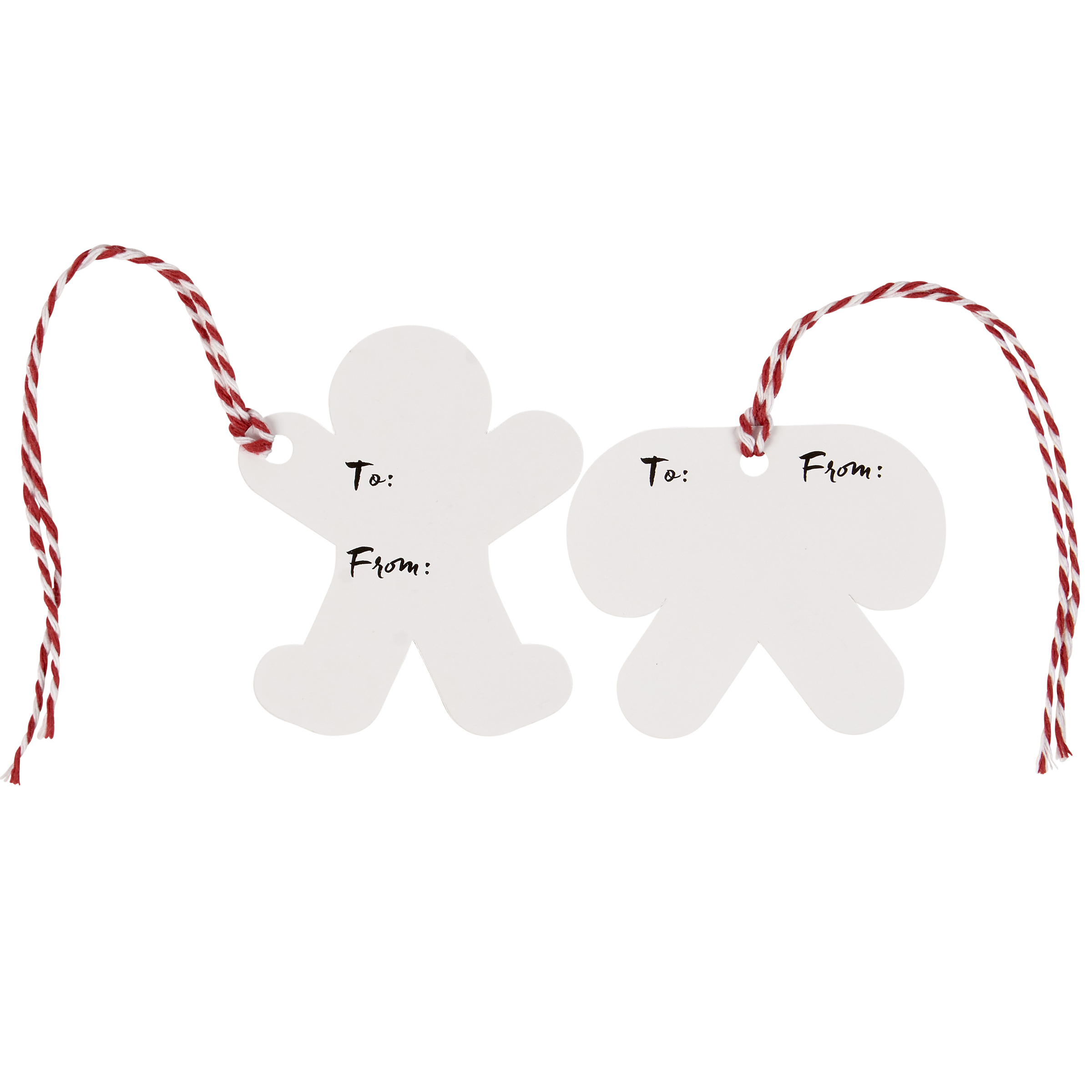 A set of paper gift tags from our Christmas Collection displaying fun holiday-themed designs and space for a "To and From" message on the back. Designs feature shaped cutouts of a gingerbread man as well as candy canes. Set includes 16 tags with 8 of each design. Seasonal gift tags each include an attached piece of red and white twine to easily tie around gift. Our Gingerbread Man gift tags are packaged together in a poly bag with attached header card. A charming set of gift accessories perfect for seasonal gifting.