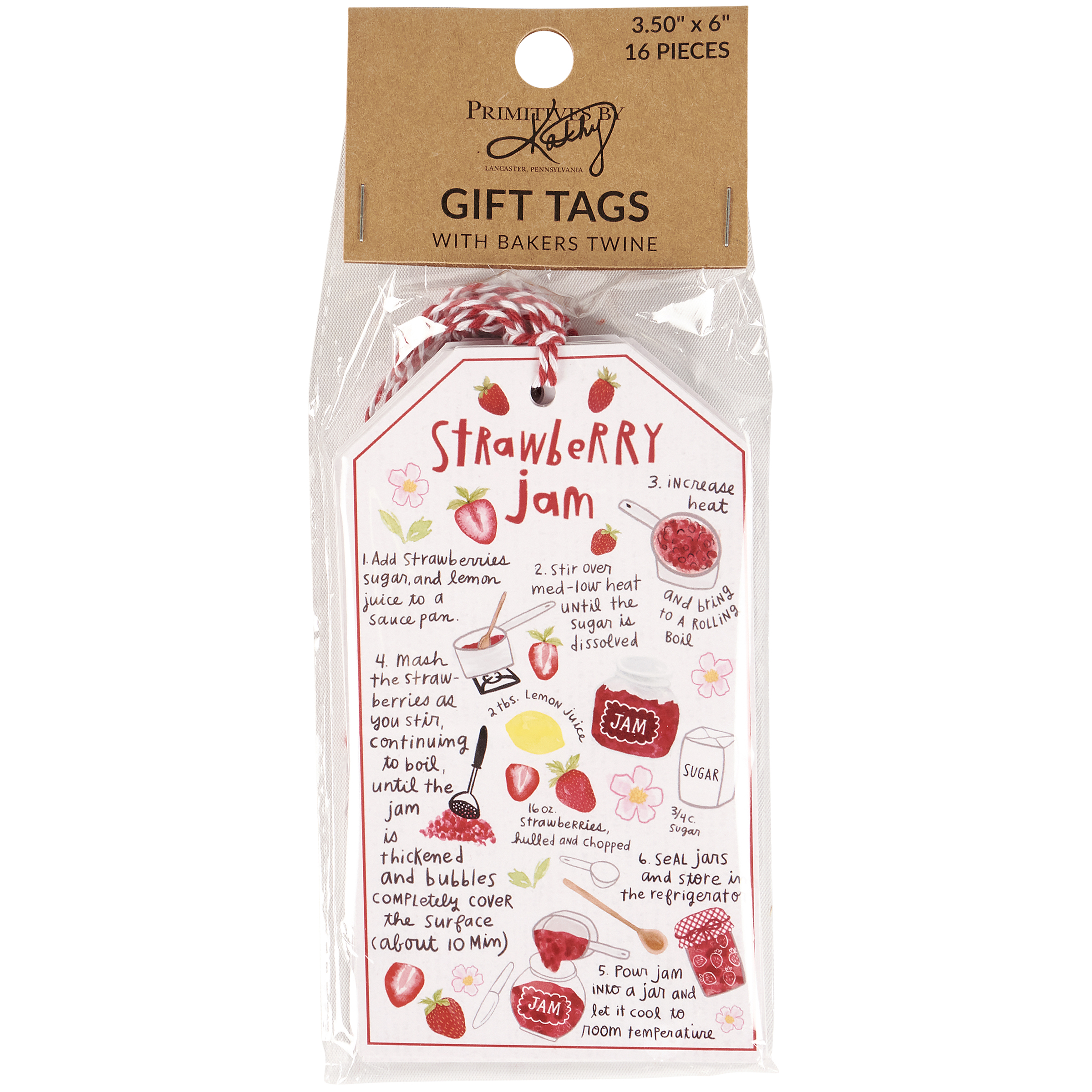 A set of paper gift tags from our Homestead Collection displaying a fun recipe inspired design replicated from original hand illustrated art. Homestead recipe design features steps for making homemade strawberry jam with coordinating illustrations. Our Strawberry Jam gift tag set includes 16 tags with an attached piece of red and white bakers twine to easily tie around gift. Homestead gift tag set is packaged together in a poly bag with attached header card and hole for easy store rack display. A charming set of gift accessories perfect for everyday moments.