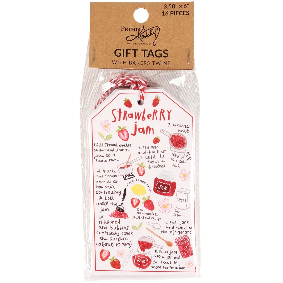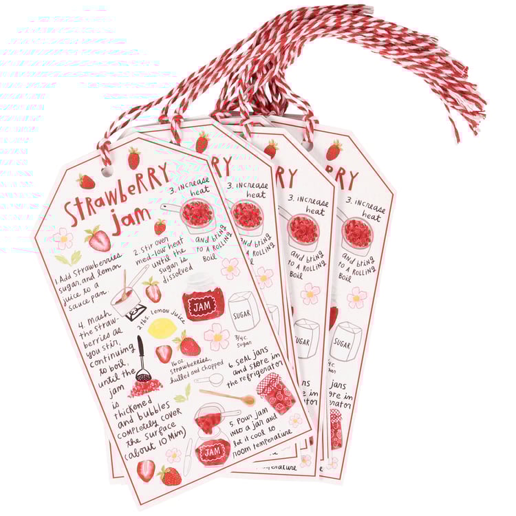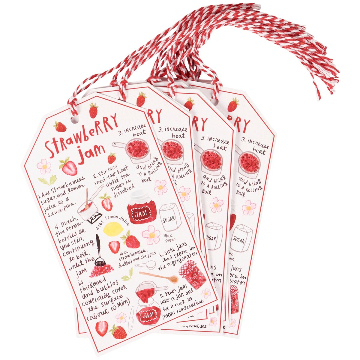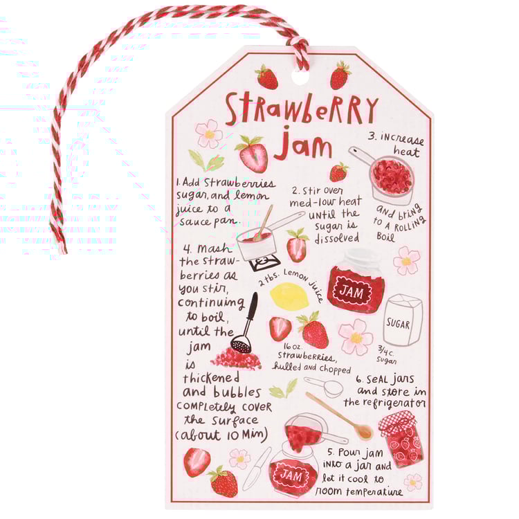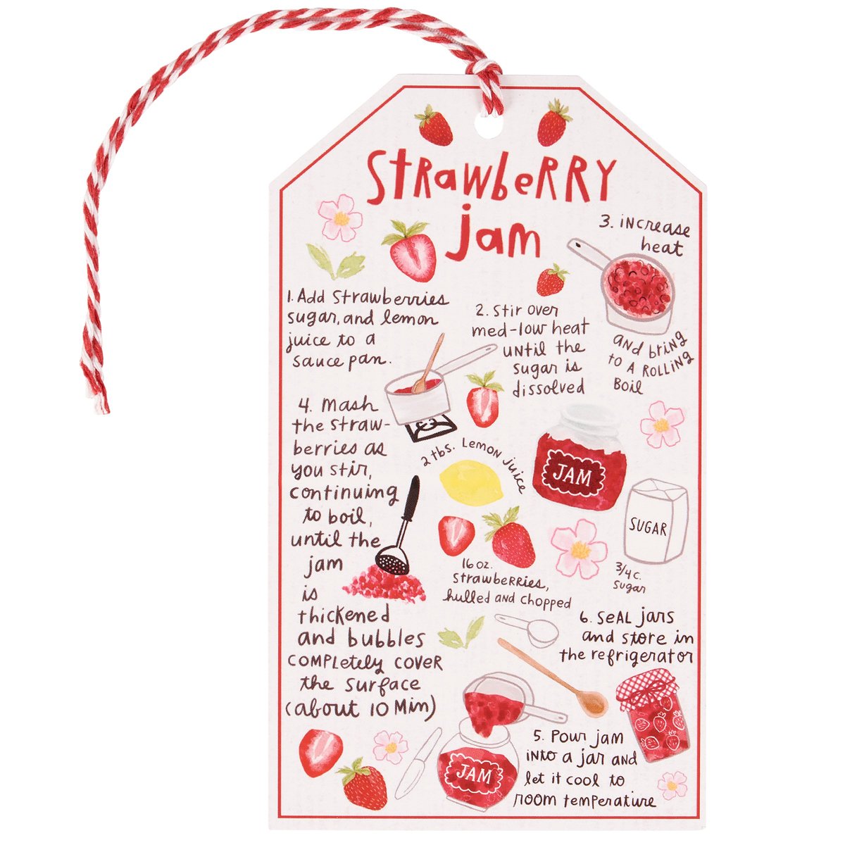 A set of paper gift tags from our Homestead Collection displaying a fun recipe inspired design replicated from original hand illustrated art. Homestead recipe design features steps for making homemade strawberry jam with coordinating illustrations. Our Strawberry Jam gift tag set includes 16 tags with an attached piece of red and white bakers twine to easily tie around gift. Homestead gift tag set is packaged together in a poly bag with attached header card and hole for easy store rack display. A charming set of gift accessories perfect for everyday moments.