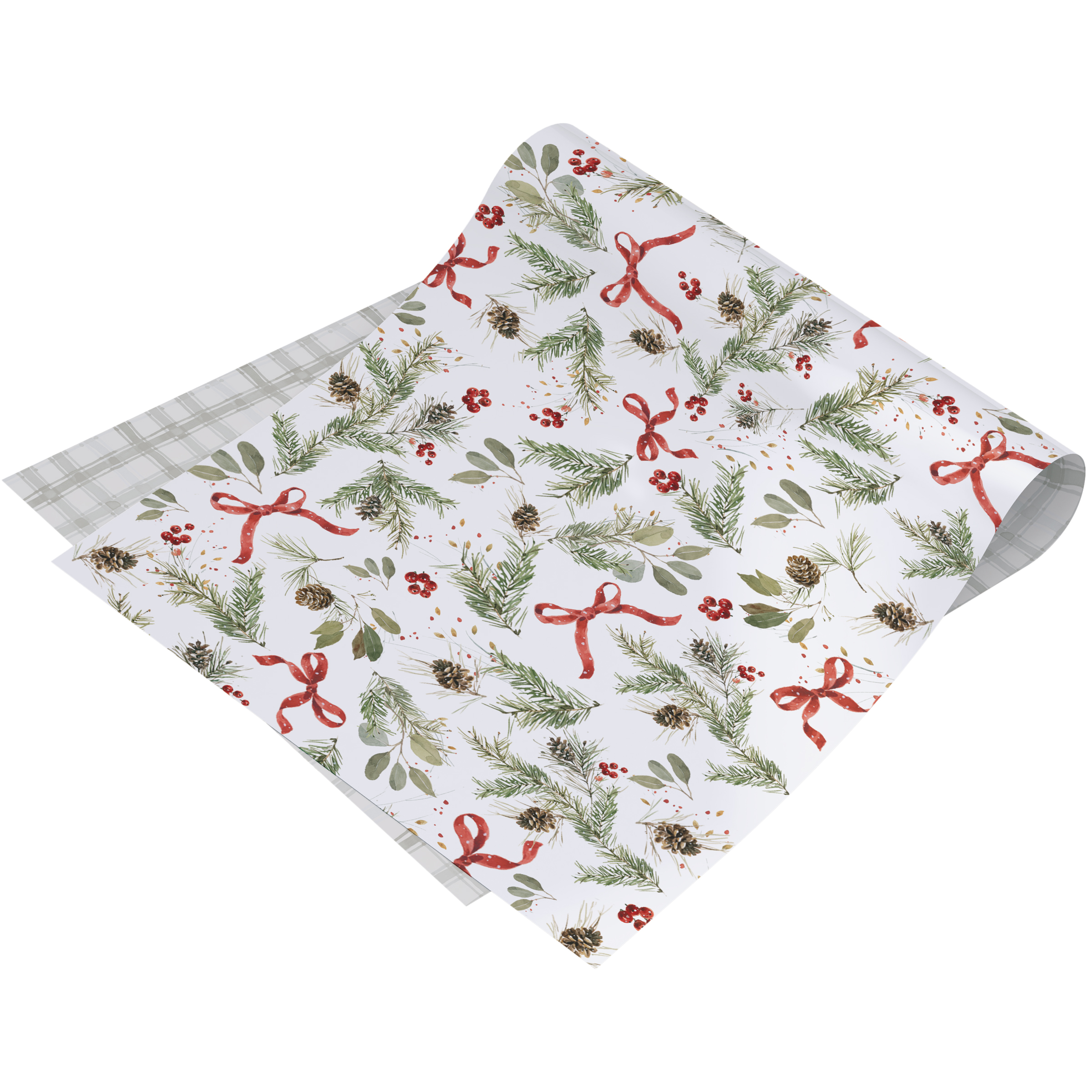 A double-sided roll of gift wrap from our Christmas Collection displaying a pattern of winter greenery and red bows on one side and a gray gingham pattern on the other side for multiple gifting options. Seasonal gift wrap designs are replicated from original art hand painted in a delicate watercolor style. Our Greenery gift wrap includes 9.75 feet of seasonal wrapping paper on a 30 inch cardboard roll and shrink wrapped with a sticker label displaying the reversible designs for easy store display. A lovely Christmas gift accessory perfect for seasonal gifting.