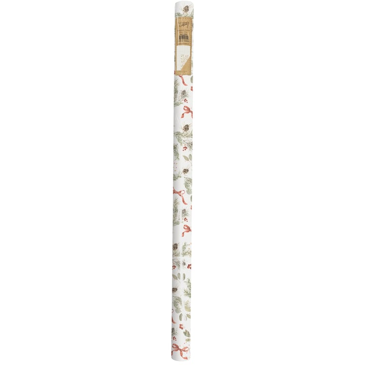 A double-sided roll of gift wrap from our Christmas Collection displaying a pattern of winter greenery and red bows on one side and a gray gingham pattern on the other side for multiple gifting options. Seasonal gift wrap designs are replicated from original art hand painted in a delicate watercolor style. Our Greenery gift wrap includes 9.75 feet of seasonal wrapping paper on a 30 inch cardboard roll and shrink wrapped with a sticker label displaying the reversible designs for easy store display. A lovely Christmas gift accessory perfect for seasonal gifting.