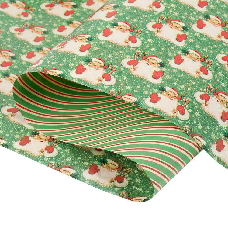 A double-sided roll of gift wrap from our Christmas Collection displaying a retro inspired pattern of Santa holding a candy cane on one side as well as green and red stripes on the other side for multiple gifting options. Our Retro Santa gift wrap includes 9.75 feet of seasonal wrapping paper on a 30 inch cardboard roll and shrink wrapped with a sticker label displaying the reversible designs for easy store display. A retro Christmas gift accessory perfect for seasonal gifting.