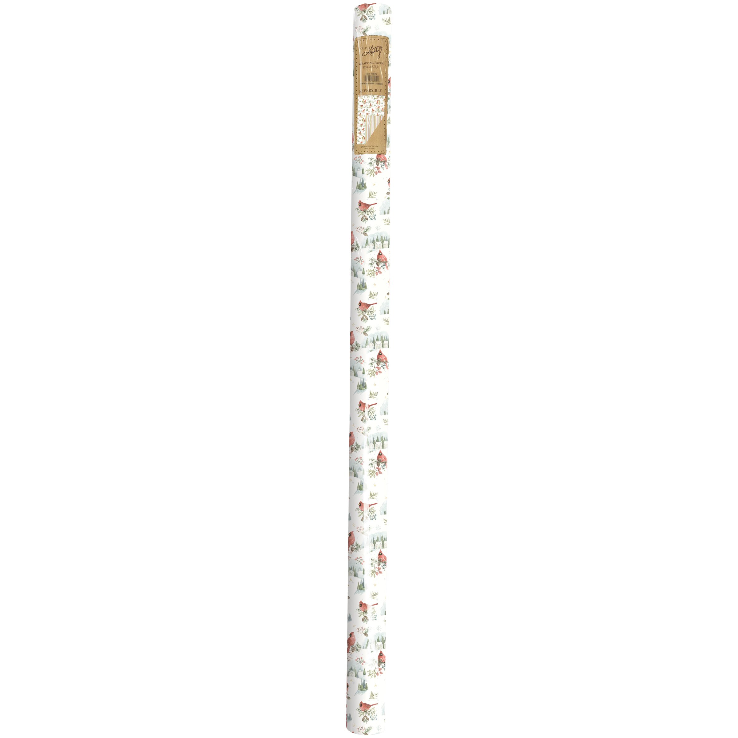A roll of double-sided gift wrap from our Christmas Collection featuring two individual winter inspired patterns on each side replicated from original art hand painted in a delicate watercolor style. Seasonal gift wrap displays winter scenes of cardinals on one side and winter stripe pattern on the other for multiple gifting options. Our Winter Cardinal gift wrap comes shrink-wrapped for protection with sticker that showcases reversible designs. A charming winter-themed gift wrap perfect for seasonal gifting.