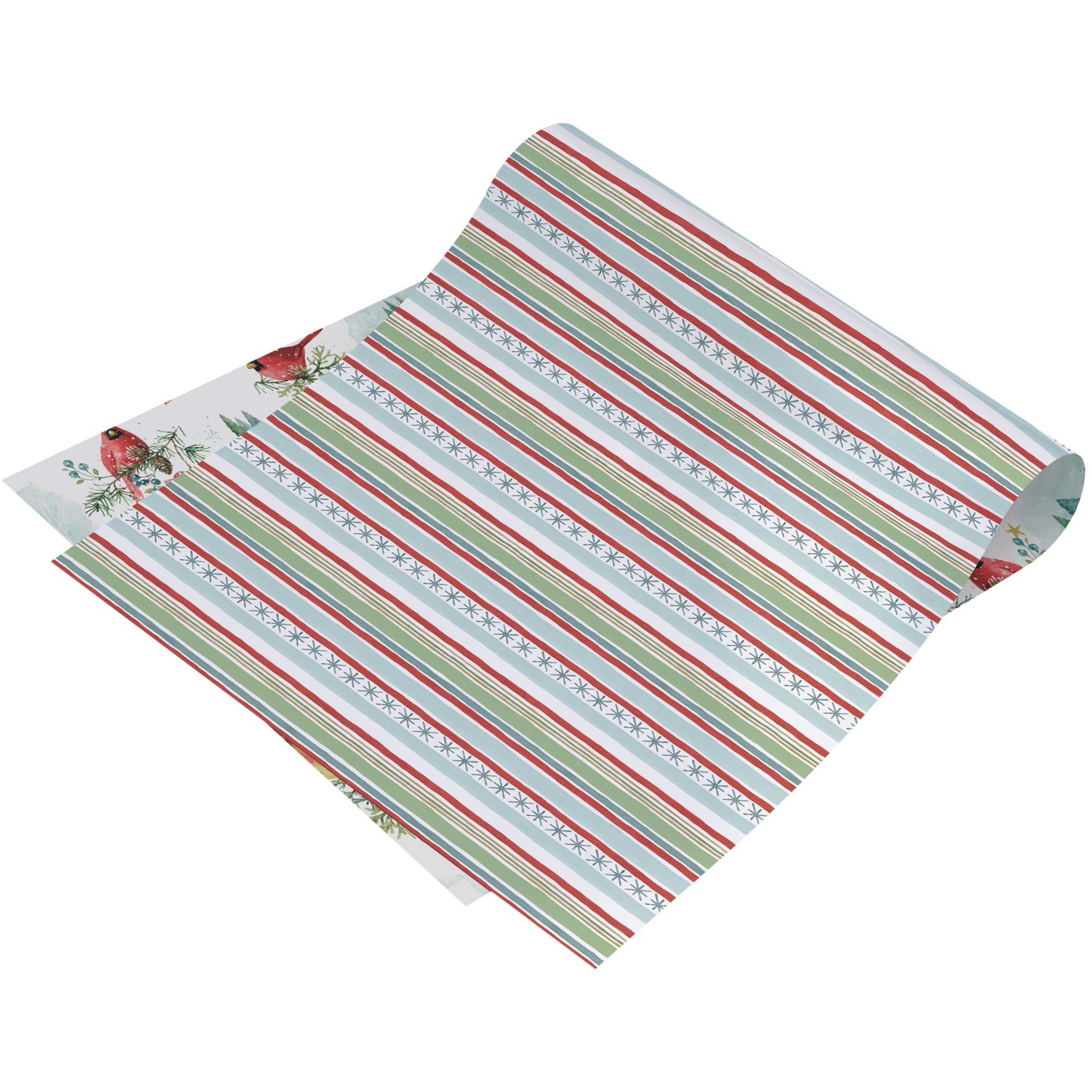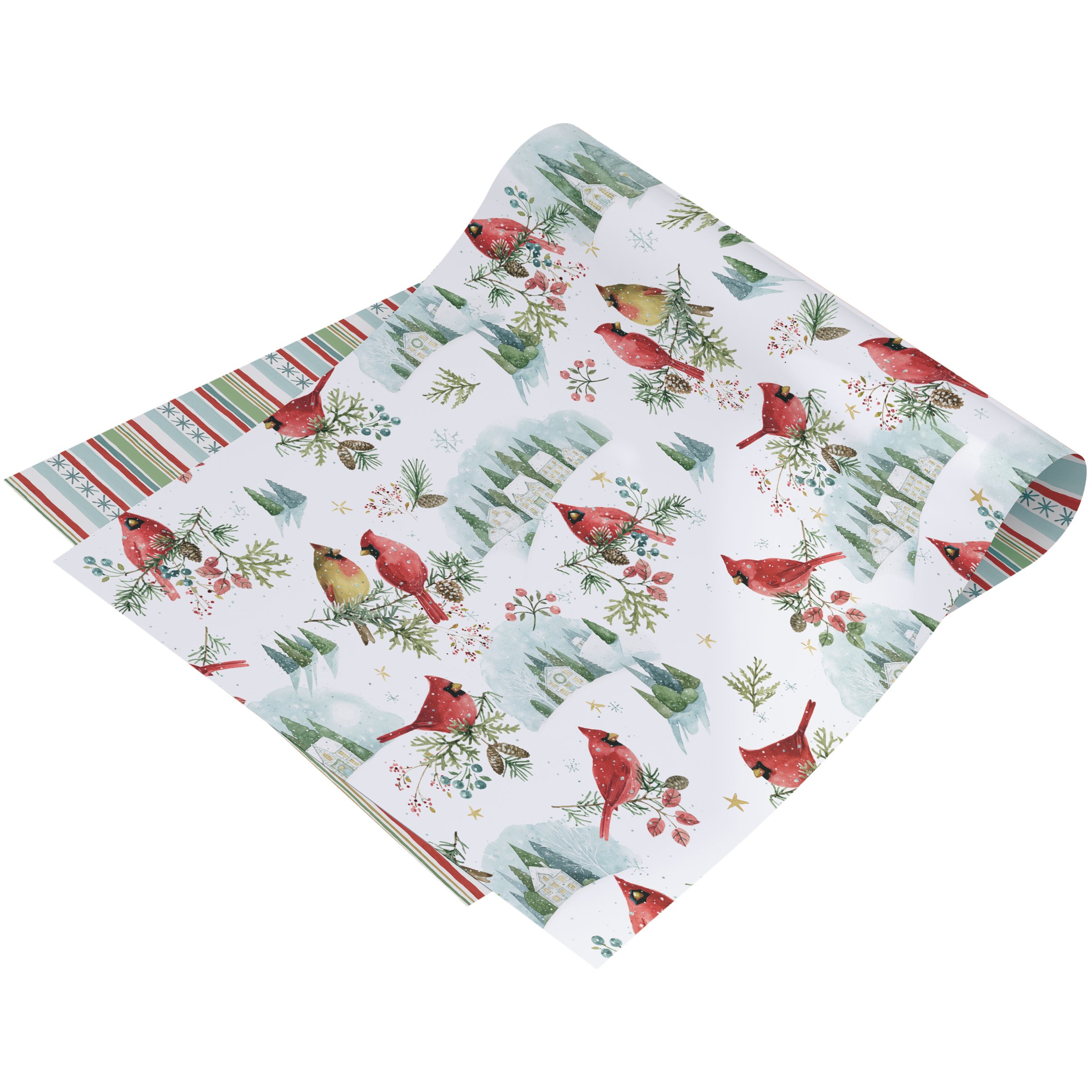 A roll of double-sided gift wrap from our Christmas Collection featuring two individual winter inspired patterns on each side replicated from original art hand painted in a delicate watercolor style. Seasonal gift wrap displays winter scenes of cardinals on one side and winter stripe pattern on the other for multiple gifting options. Our Winter Cardinal gift wrap comes shrink-wrapped for protection with sticker that showcases reversible designs. A charming winter-themed gift wrap perfect for seasonal gifting.