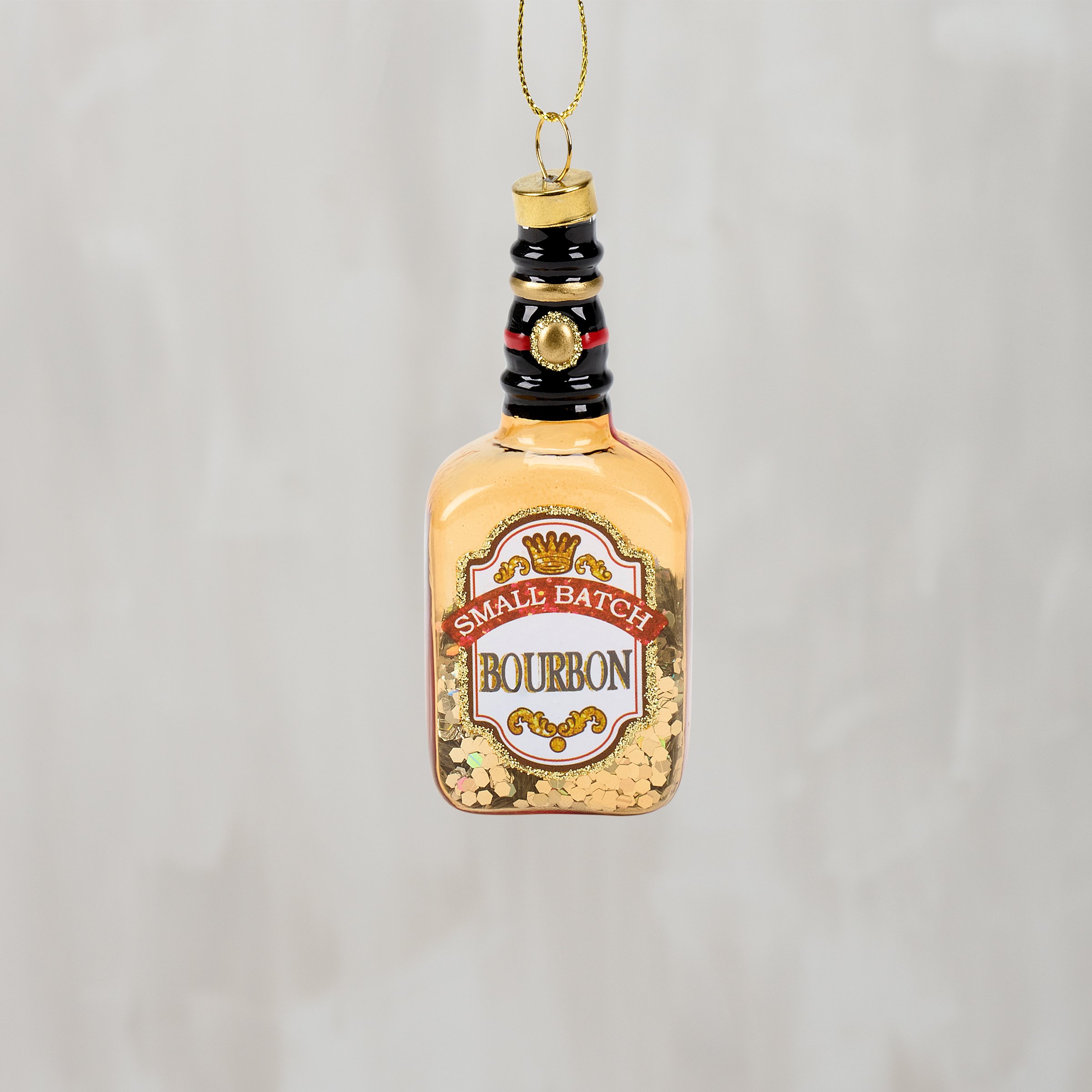 A glass ornament from our Art Deco Collection displaying a fun bourbon bottle design with glitter confetti accents inside and printed label detail. Our glass Bourbon ornament is ready to hang for display via the included top loop and string hanger. A vintage style gift perfect for adding personality to a Christmas tree or for everyday alcohol themed displays.