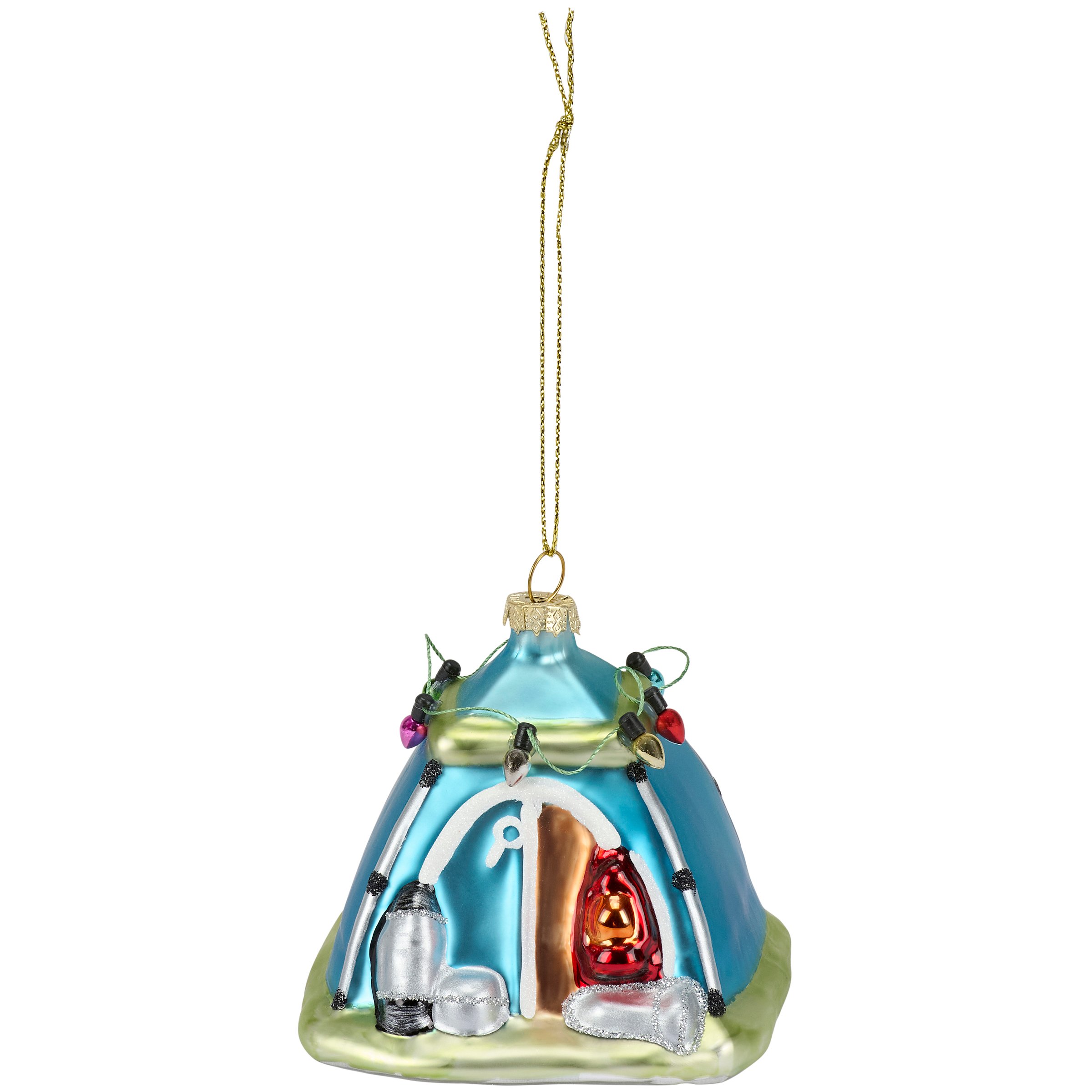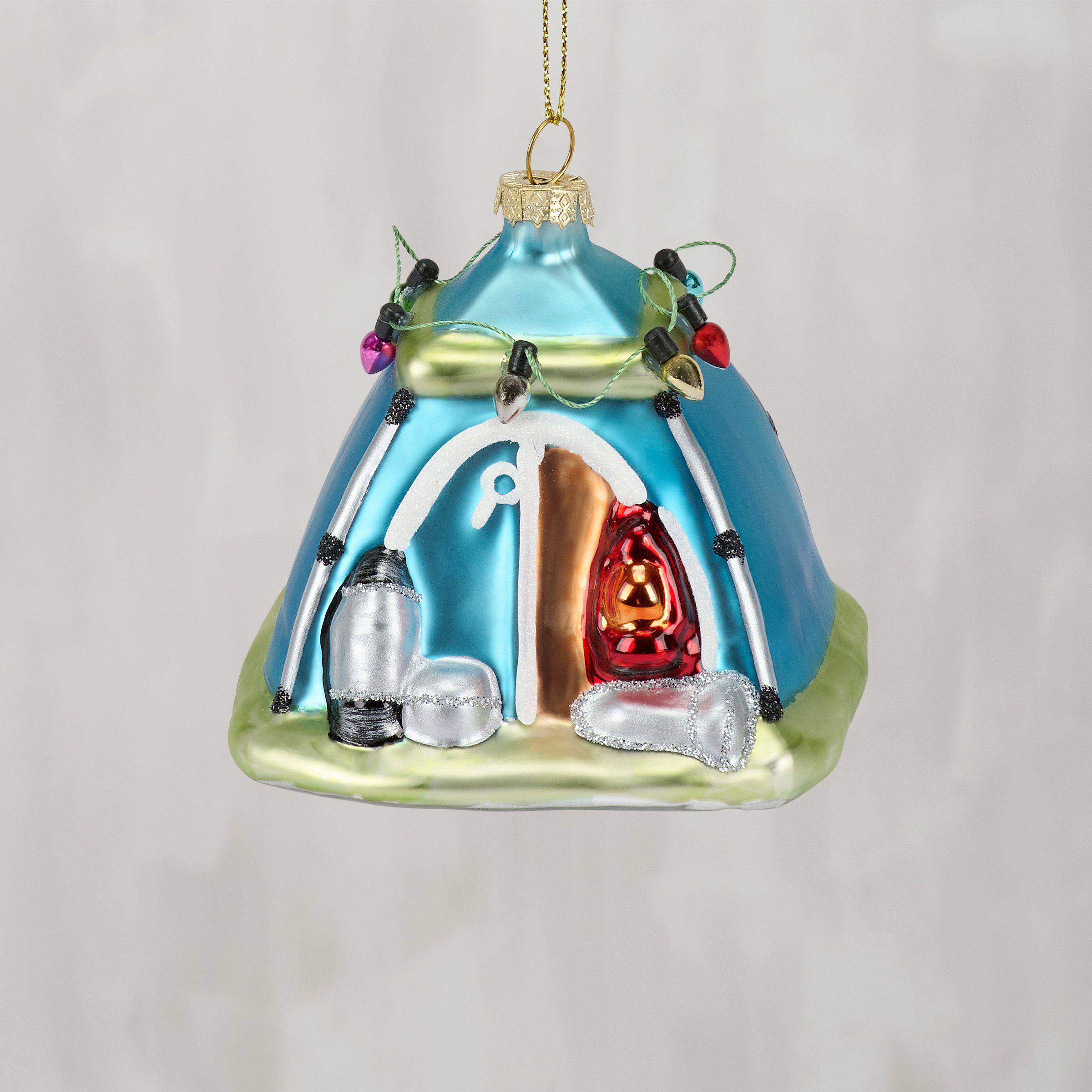 A glass ornament from our Lake & Cabin Collection displaying a fun camping tent design with painted details and glitter accents. Our glass Camping Tent ornament is ready to hang for display via the included top loop and string hanger. A vintage style gift perfect for adding personality to a Christmas tree or for camping themed displays.