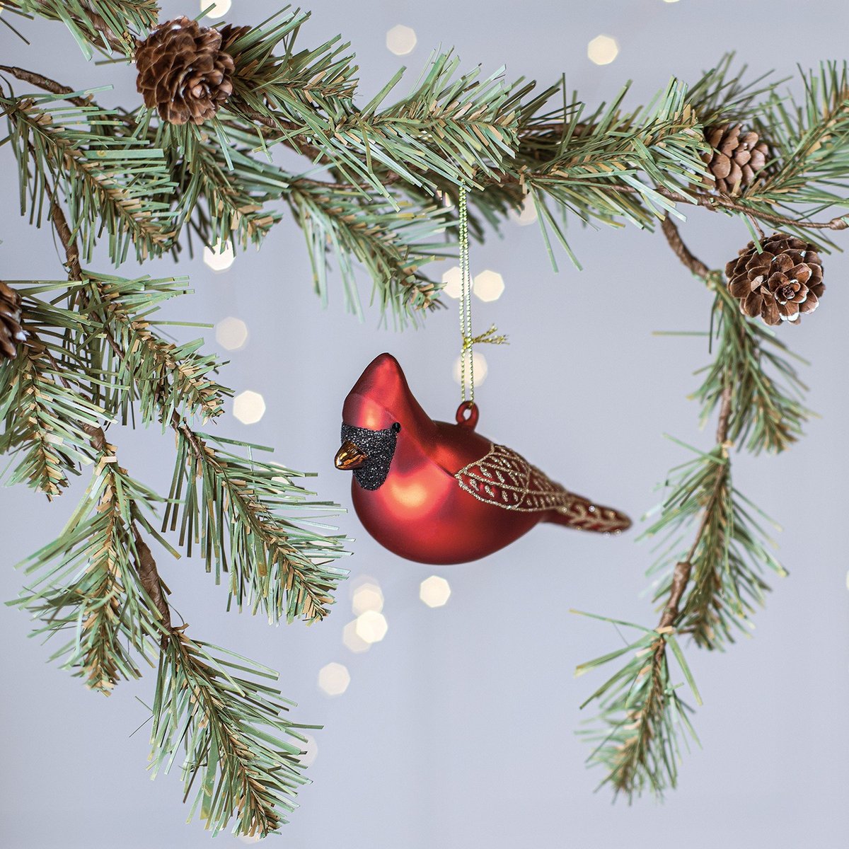 A glass ornament displaying a holiday red cardinal with gold glitter accents. A vintage style ornament from our Christmas Collection. The glass Cardinal ornament includes string loop for easy hanging. Complements well with our Christmas Woodland collection.