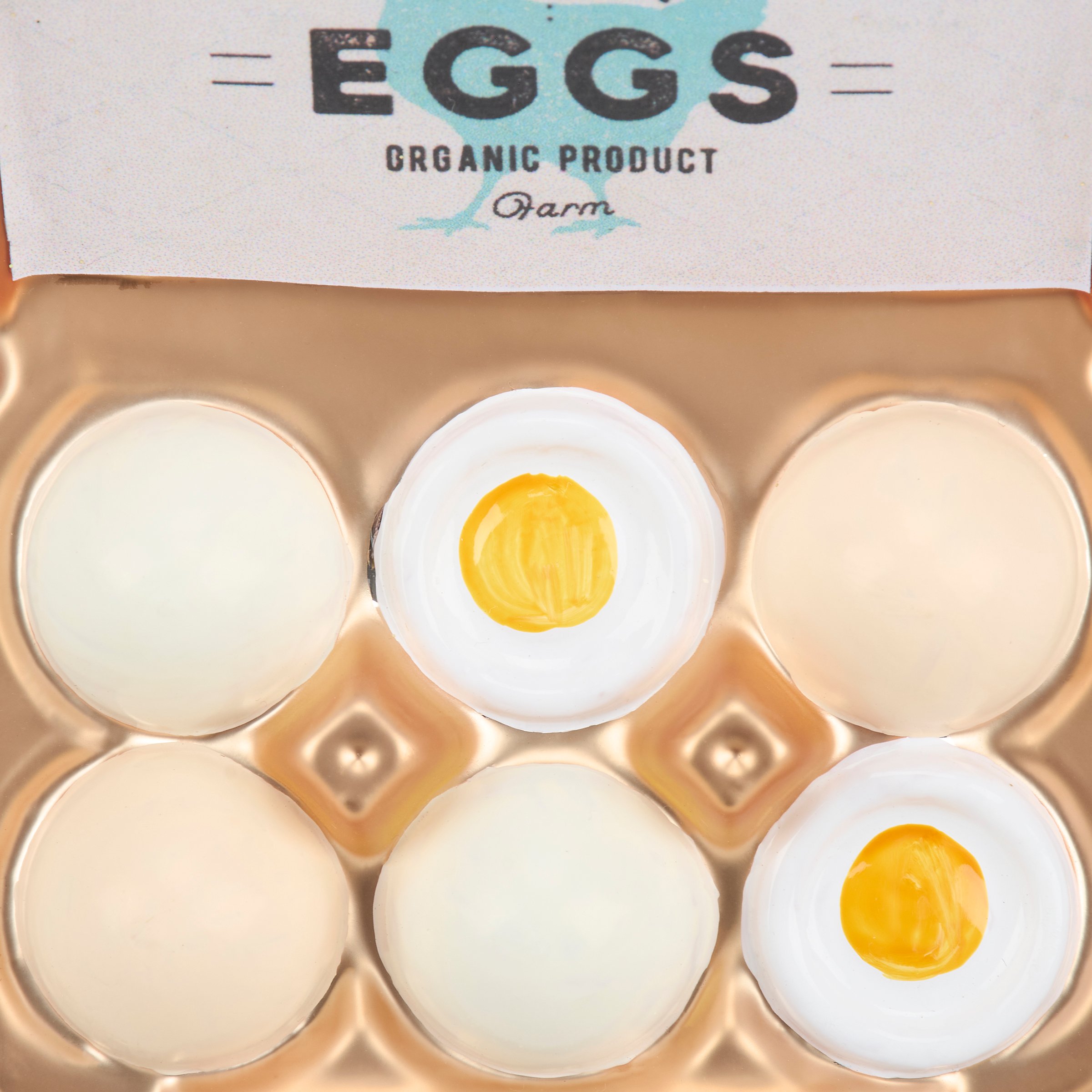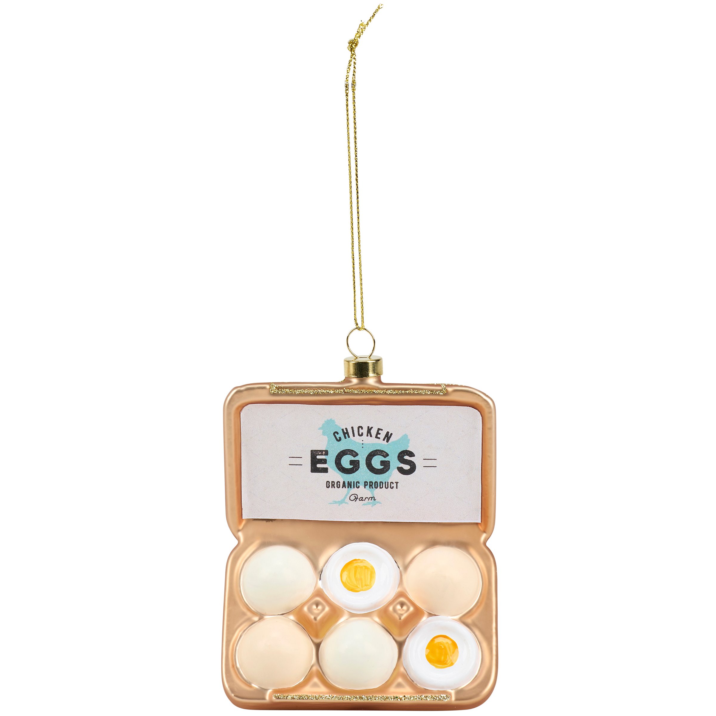 A glass ornament from our Farmhouse Collection displaying an open egg carton design with glitter accents inside and printed label detail. Our glass Chicken Eggs ornament is ready to hang for display via the included top loop and string hanger. A vintage style gift perfect for adding personality to a Christmas tree or for everyday farm themed displays.