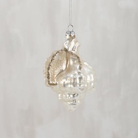 A glass ornament from our Beach Collection displaying a beach inspired design of a conch with glitter accents. Our glass Conch Shell ornament is ready to hang for display via the included top loop. A vintage style gift perfect for adding personality to a Christmas tree or for everyday beach-themed displays.