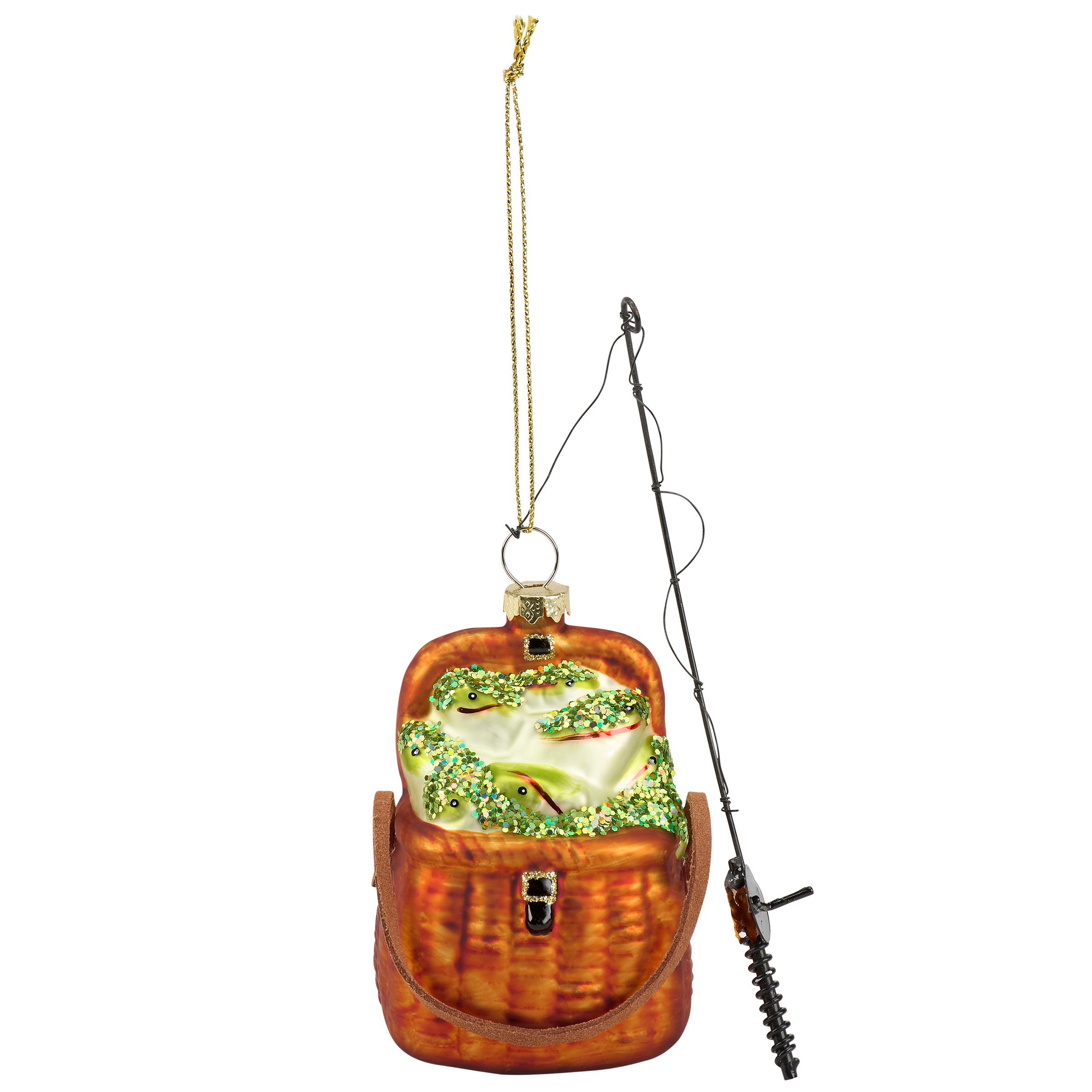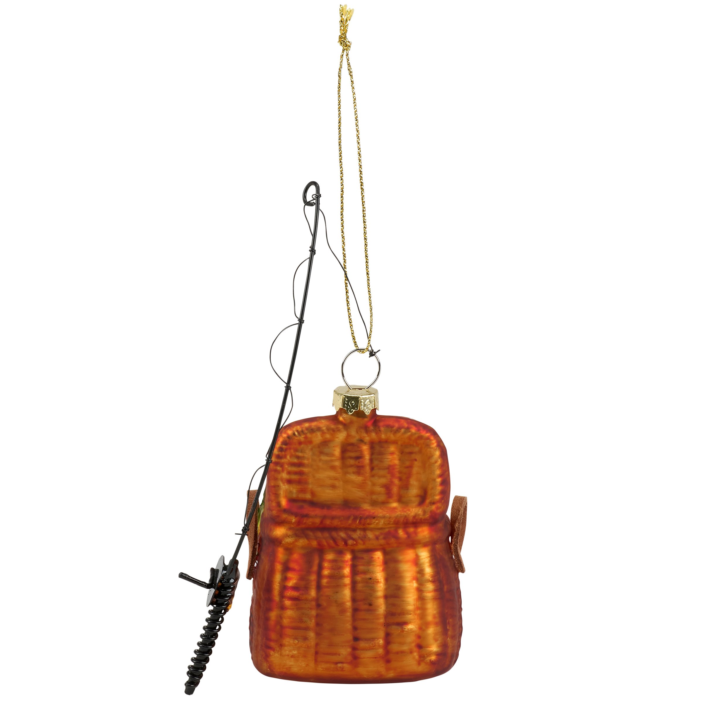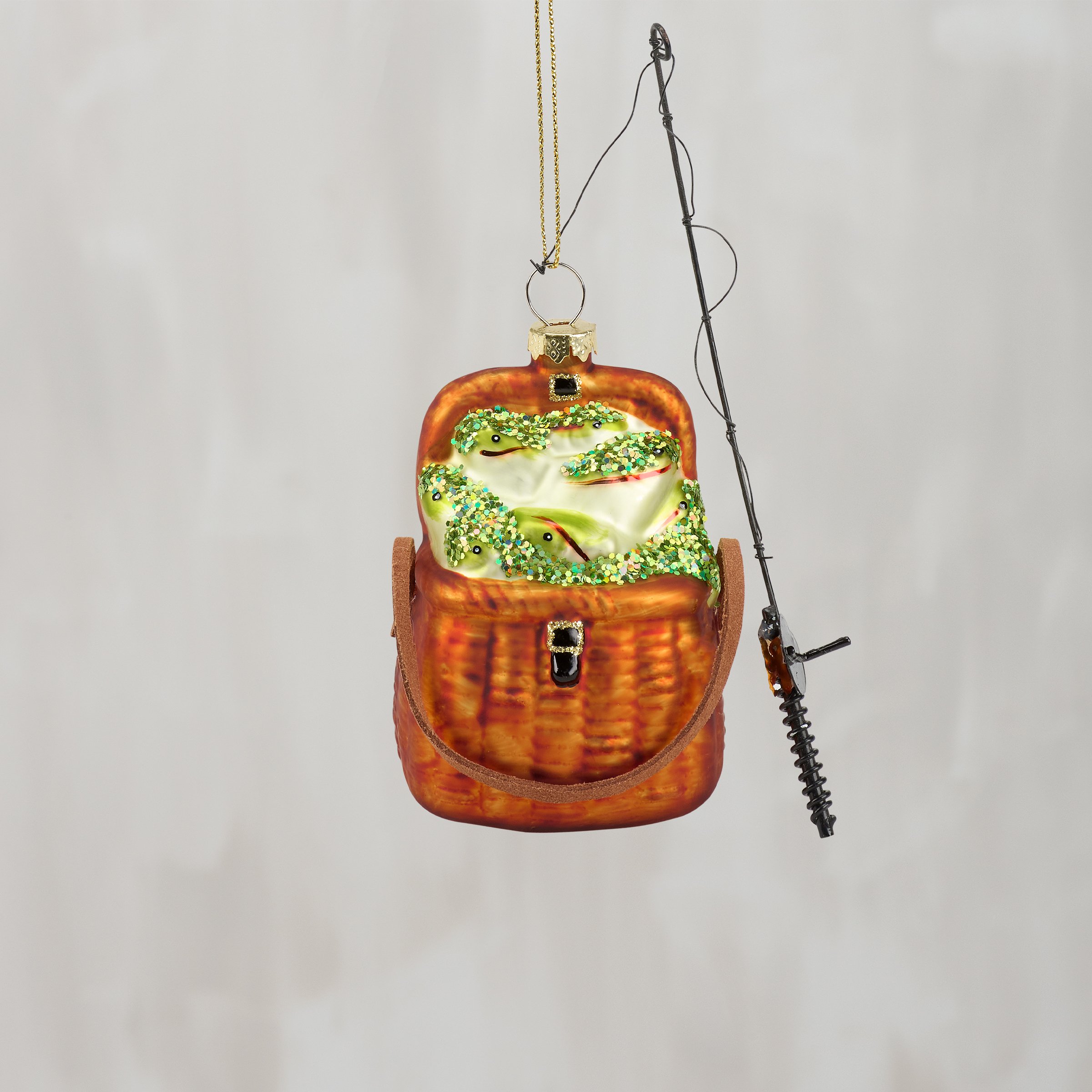 A glass ornament from our Lake & Cabin Collection displaying a fishing gear design with painted details and fun accents including a faux leather strap on the basket and string fishing line on the fishing rod. Our glass Fishing Gear ornament is ready to hang for display via the included top loop and string hanger. A vintage style gift perfect for adding personality to a Christmas tree or for everyday fishing themed displays.