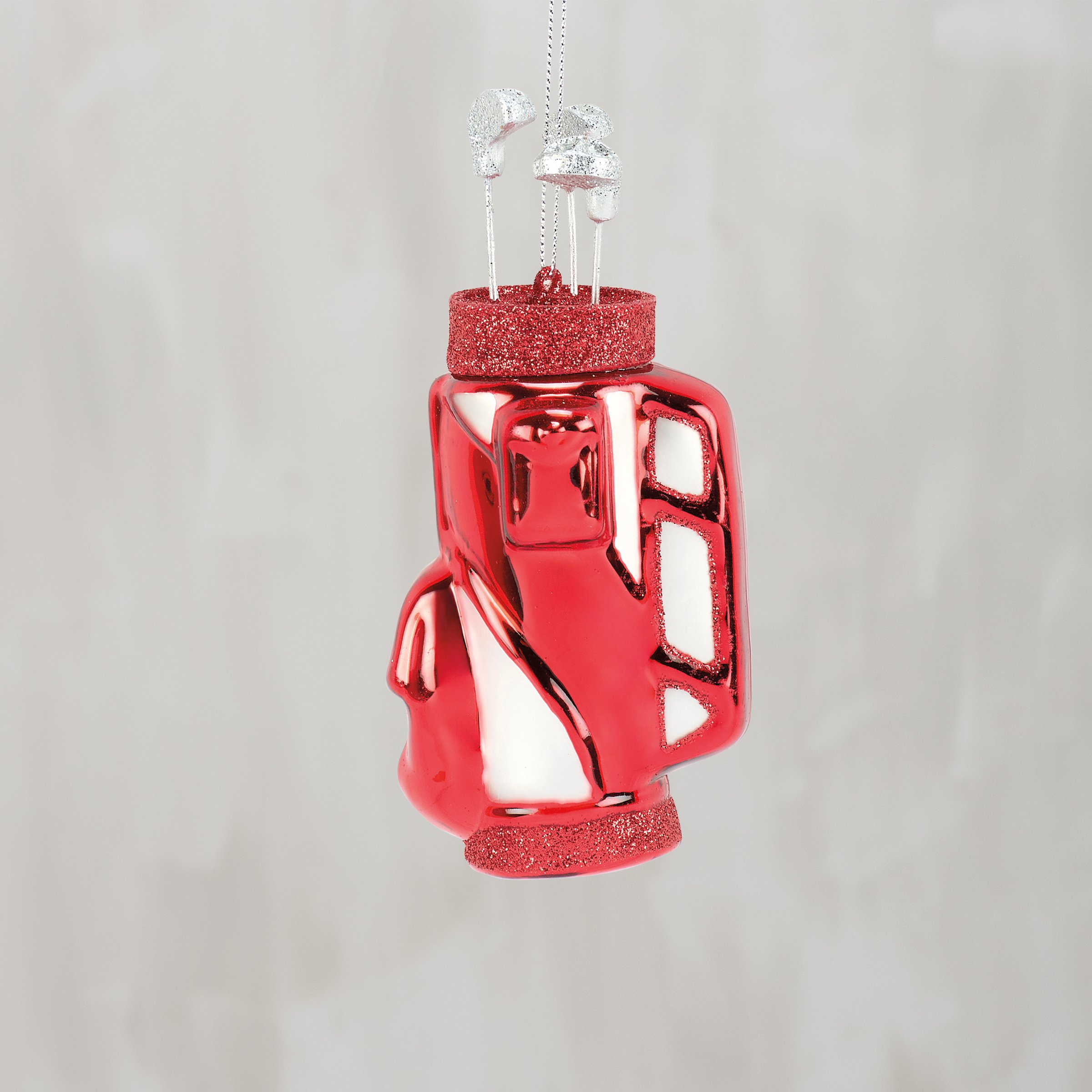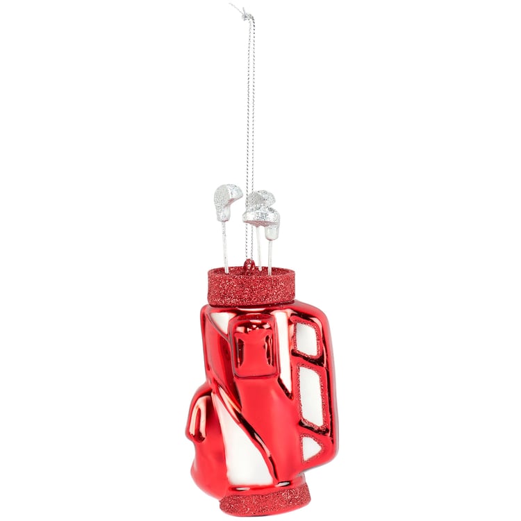 A glass ornament from our Christmas Collection displaying a fun golf bag design with painted details and glitter accents. Our glass Golf Bag ornament is ready to hang for display via the included top loop. A fun golf-themed gift perfect for adding personality to a Christmas tree.