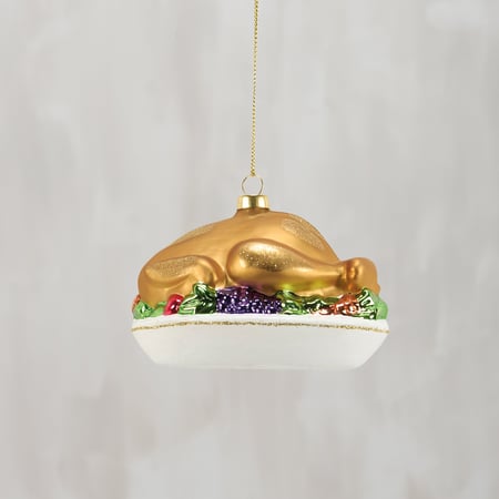 A glass ornament from our Christmas Collection displaying a vintage holiday turkey platter design with painted details and glitter accents. Our glass Holiday Turkey ornament is ready to hang for display via the included top loop. A vintage holiday gift perfect for adding personality to a Christmas tree.