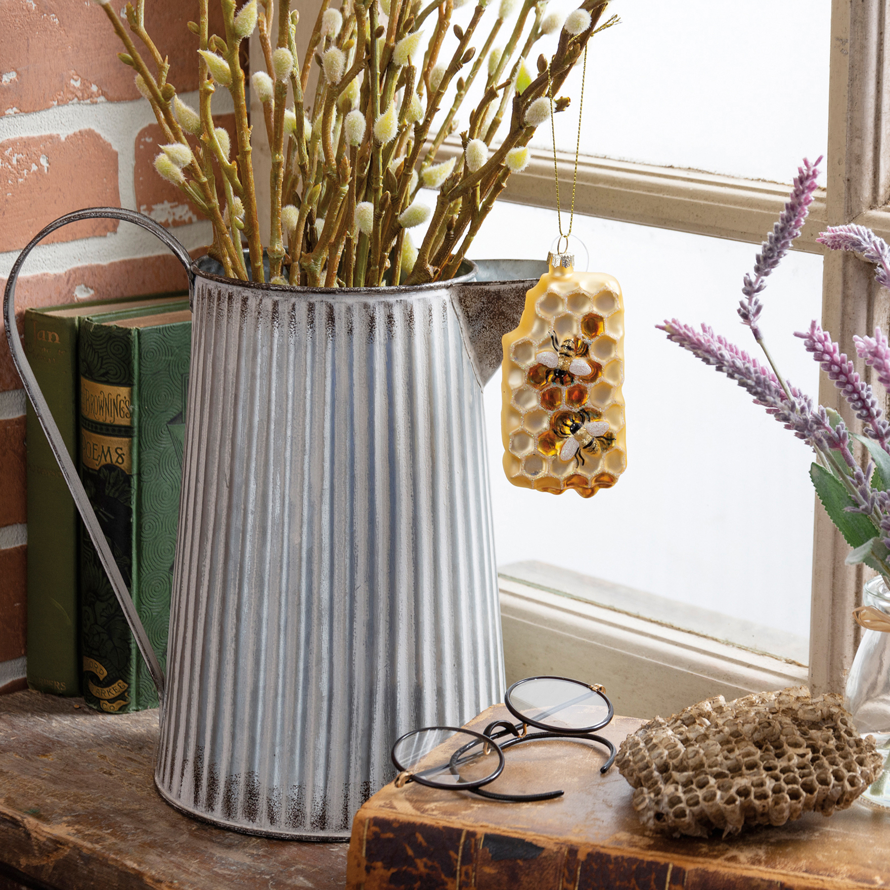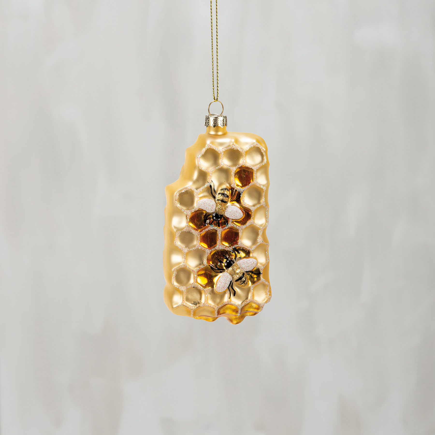 A coated glass honeycomb ornament from our Garden Collection with glitter details for added interest. Our Glass Honeycomb Ornament contains metal topper with loop for easy hanging and decorating.