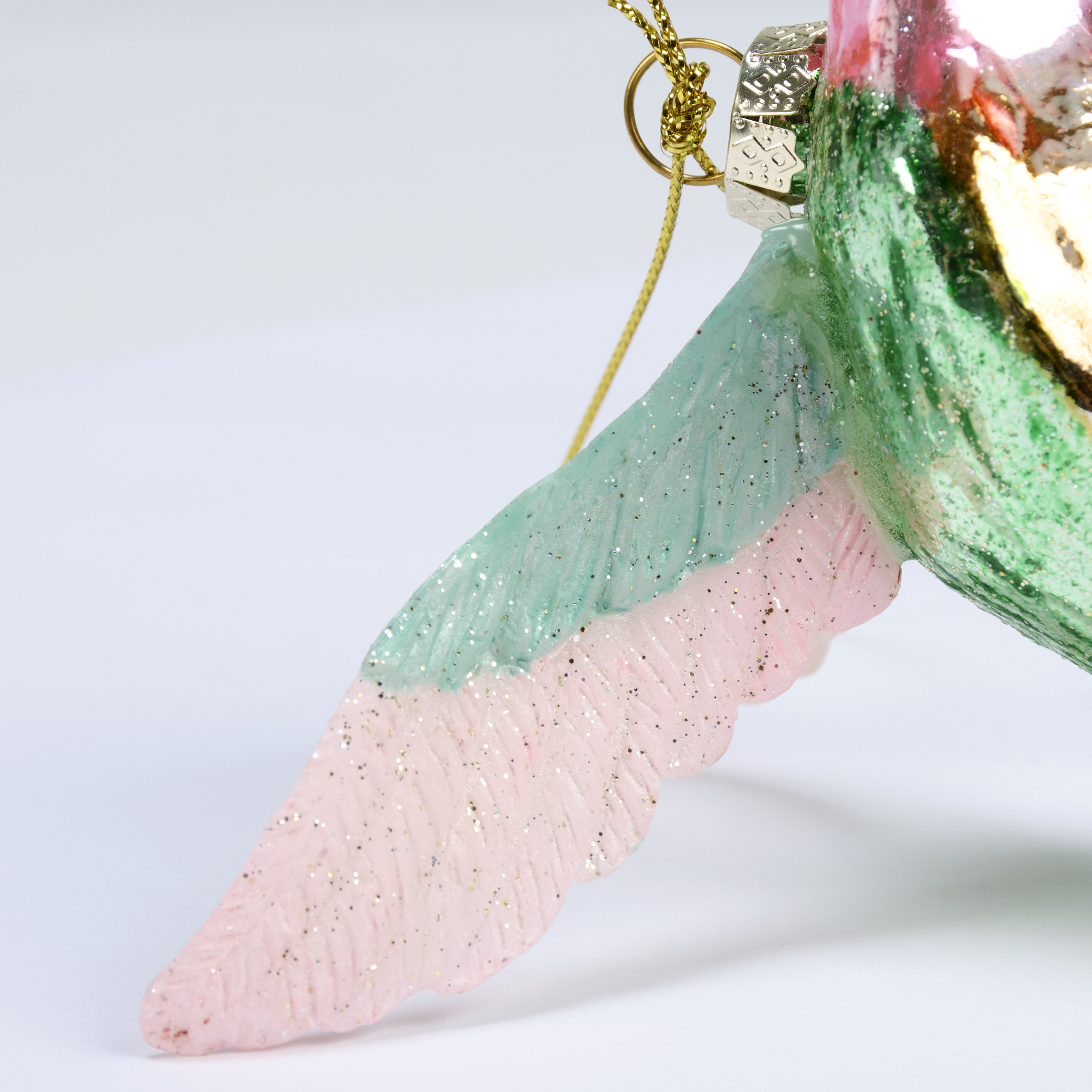 A glass ornament from our Art Nouveau Collection displaying an art nouveau inspired design of a hummingbird with glitter accents and painted details. Our glass Hummingbird ornament is ready to hang for display via the included top loop. A vintage style gift perfect for adding personality to a Christmas tree or for everyday nature-themed displays.