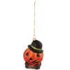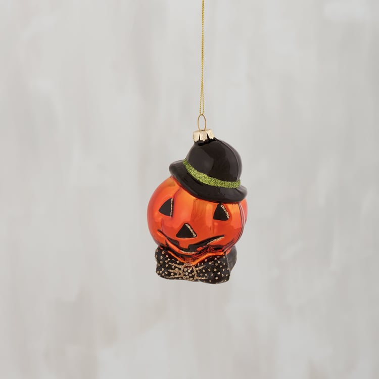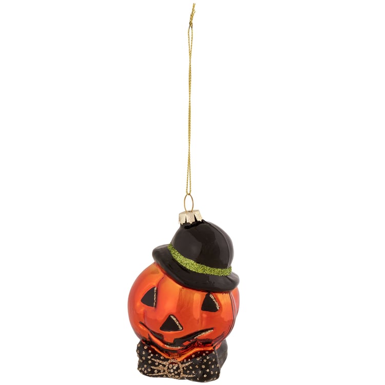 A glass ornament from our Halloween Collection displaying a design of an jack o'lantern wearing a hat and bowtie with glitter accents. Our glass Jack O' Lantern ornament is ready to hang via the included top loop. A vintage home accent perfect for seasonal display.