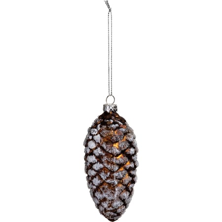 A large glass pinecone ornament from our Christmas Collection featuring glitter details for a snowy appearance. This Pinecone Christmas Ornament includes a string loop for easy hanging.
