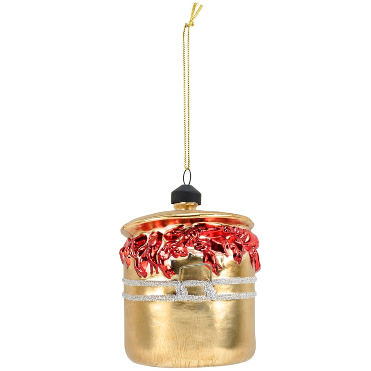 A glass ornament from our Beach Collection displaying a coastal inspired design of a lobster boil pot with glitter accents and painted details. Our glass Lobster Boil ornament is ready to hang for display via the included top loop. A vintage style gift perfect for adding personality to a Christmas tree or for everyday beach-themed displays.