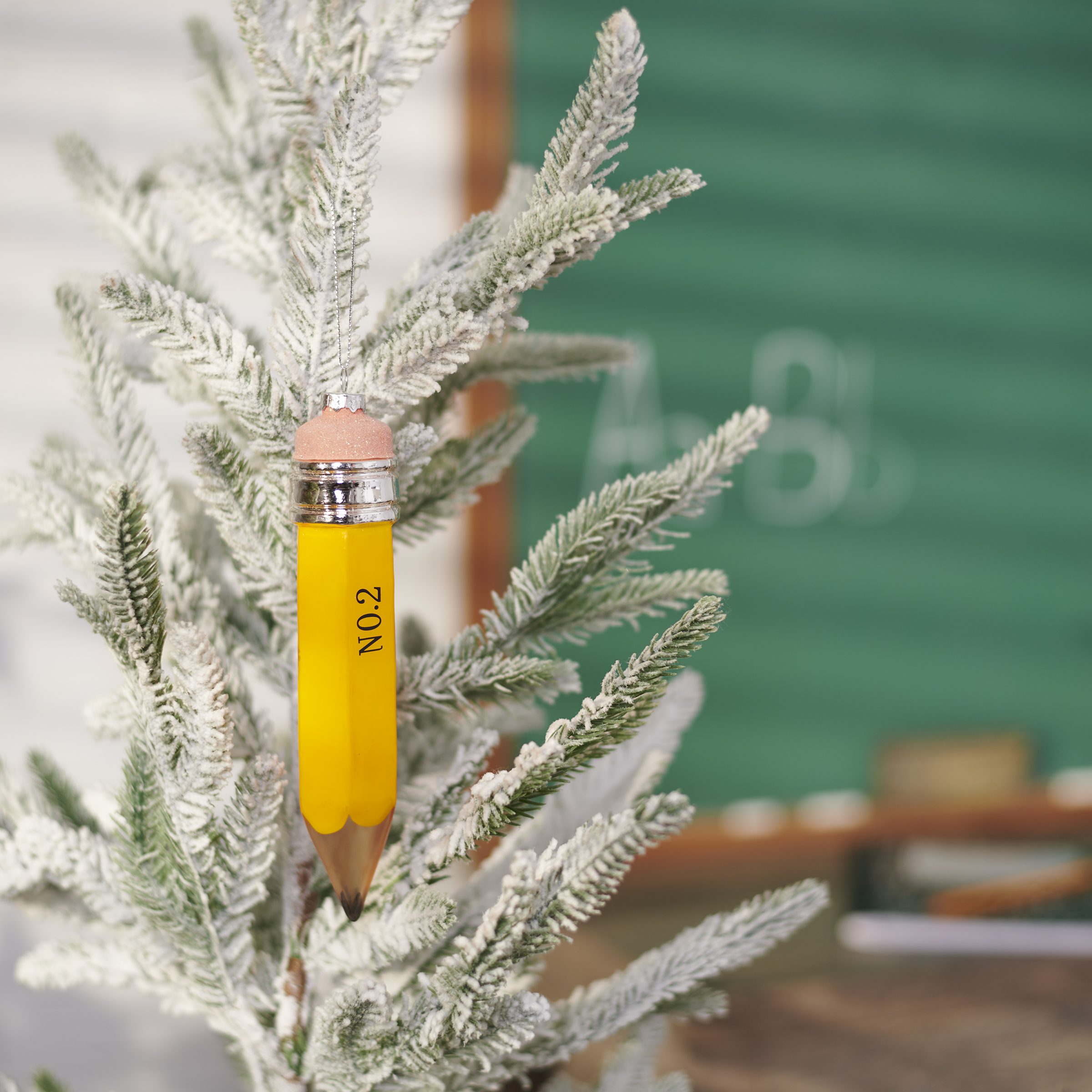 A glass no. 2 pencil ornament for Christmas. Contains top loop for easy hanging.