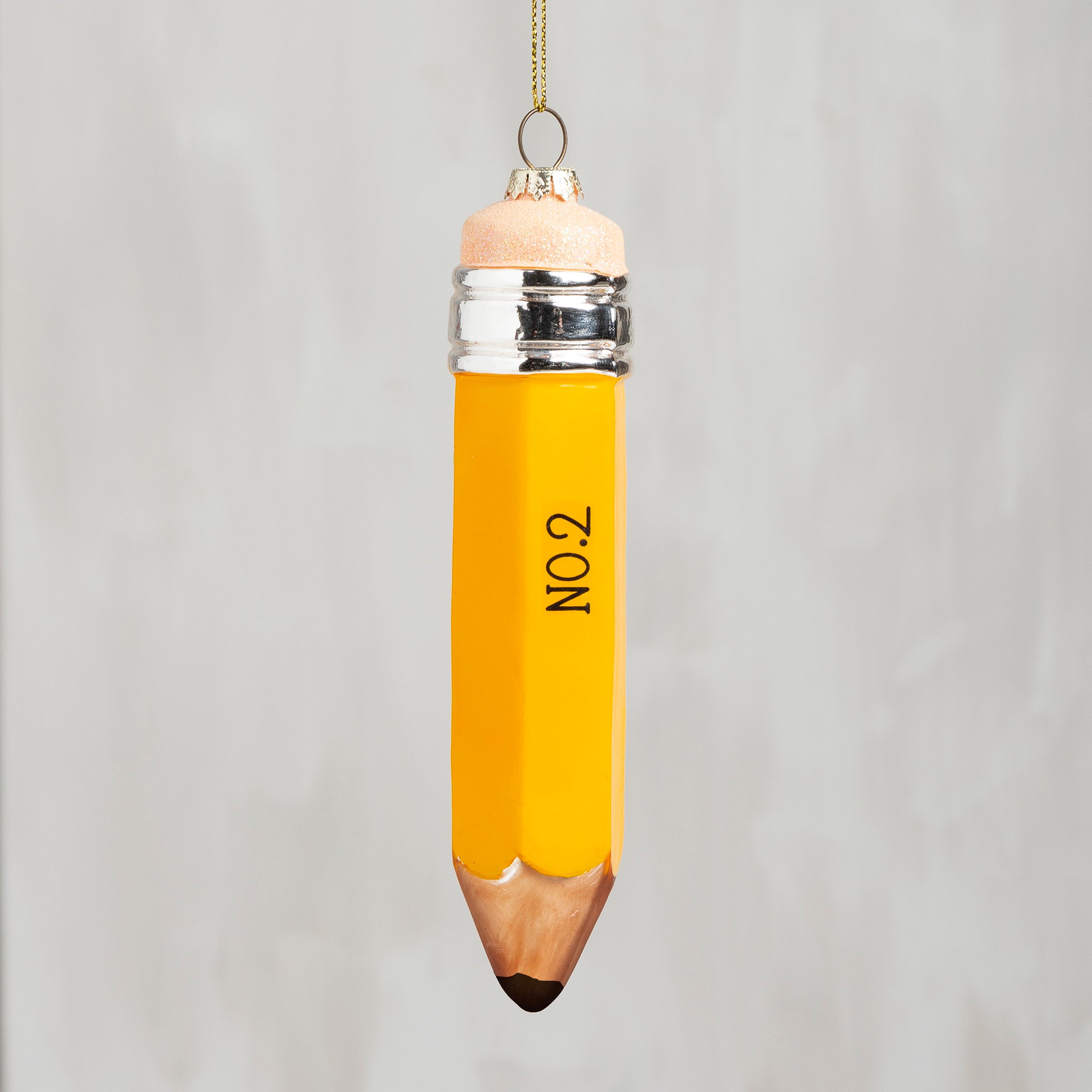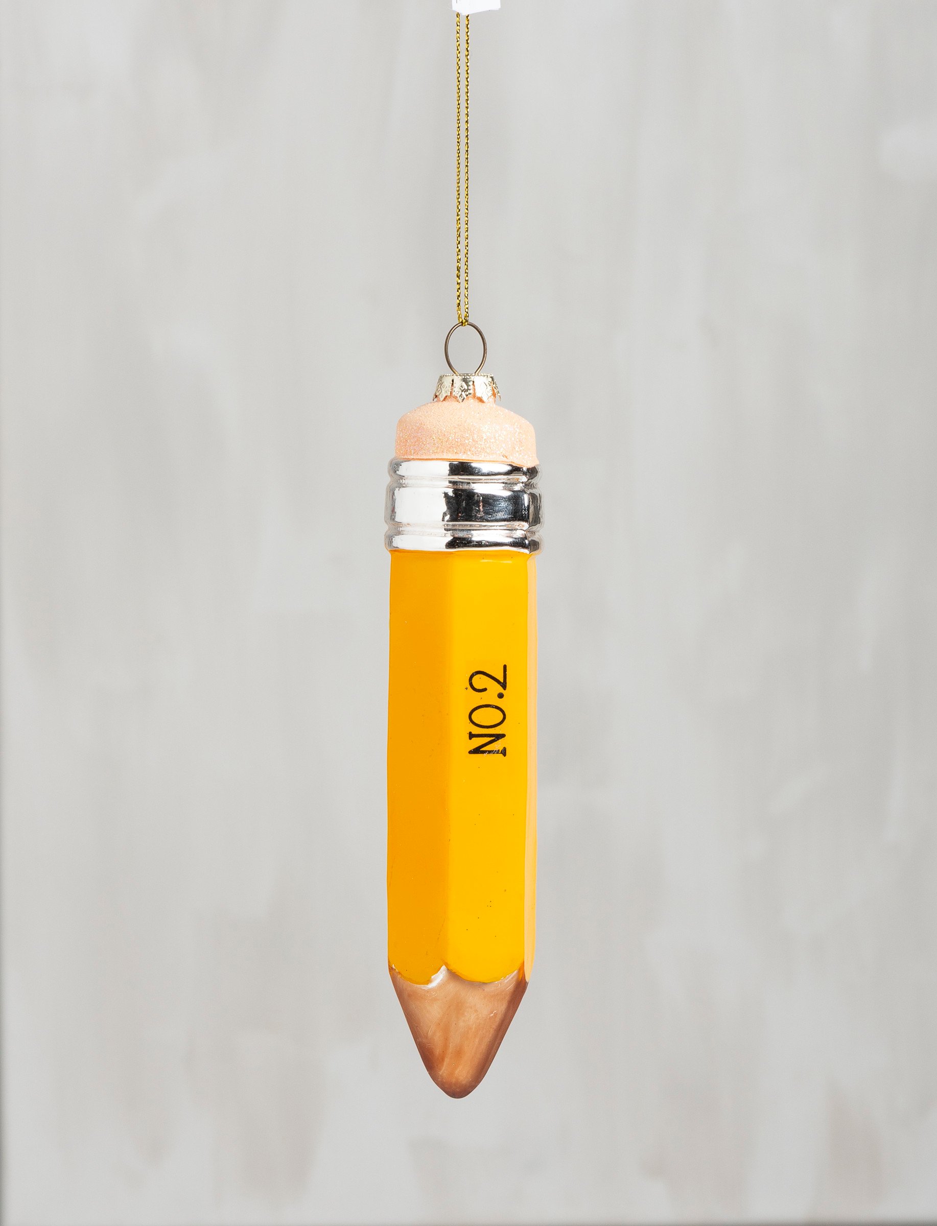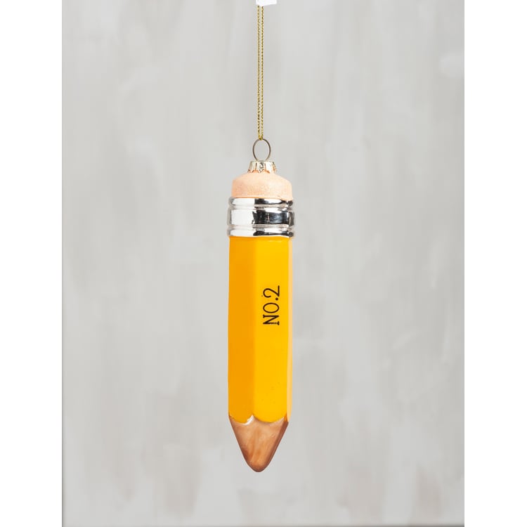 A glass no. 2 pencil ornament for Christmas. Contains top loop for easy hanging.