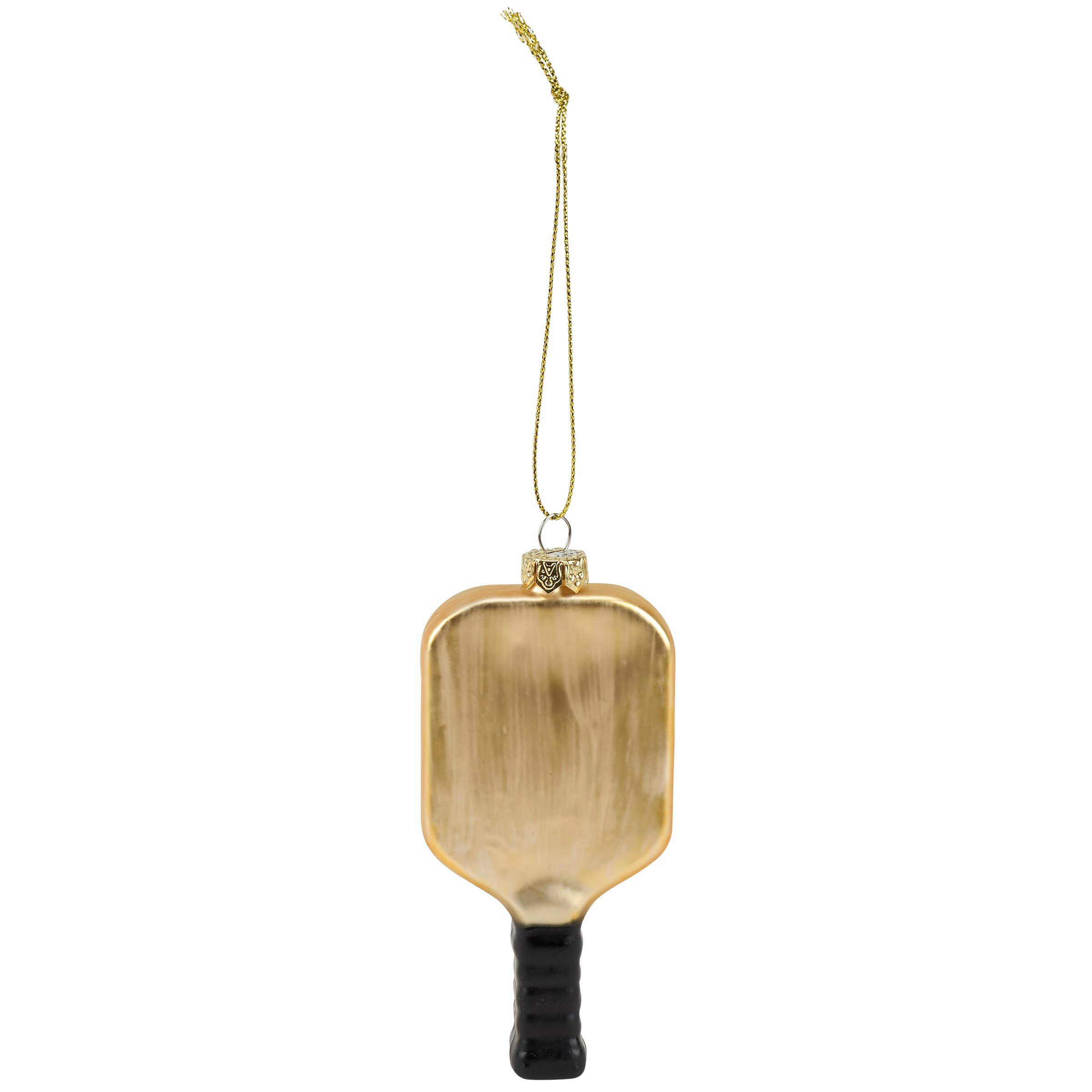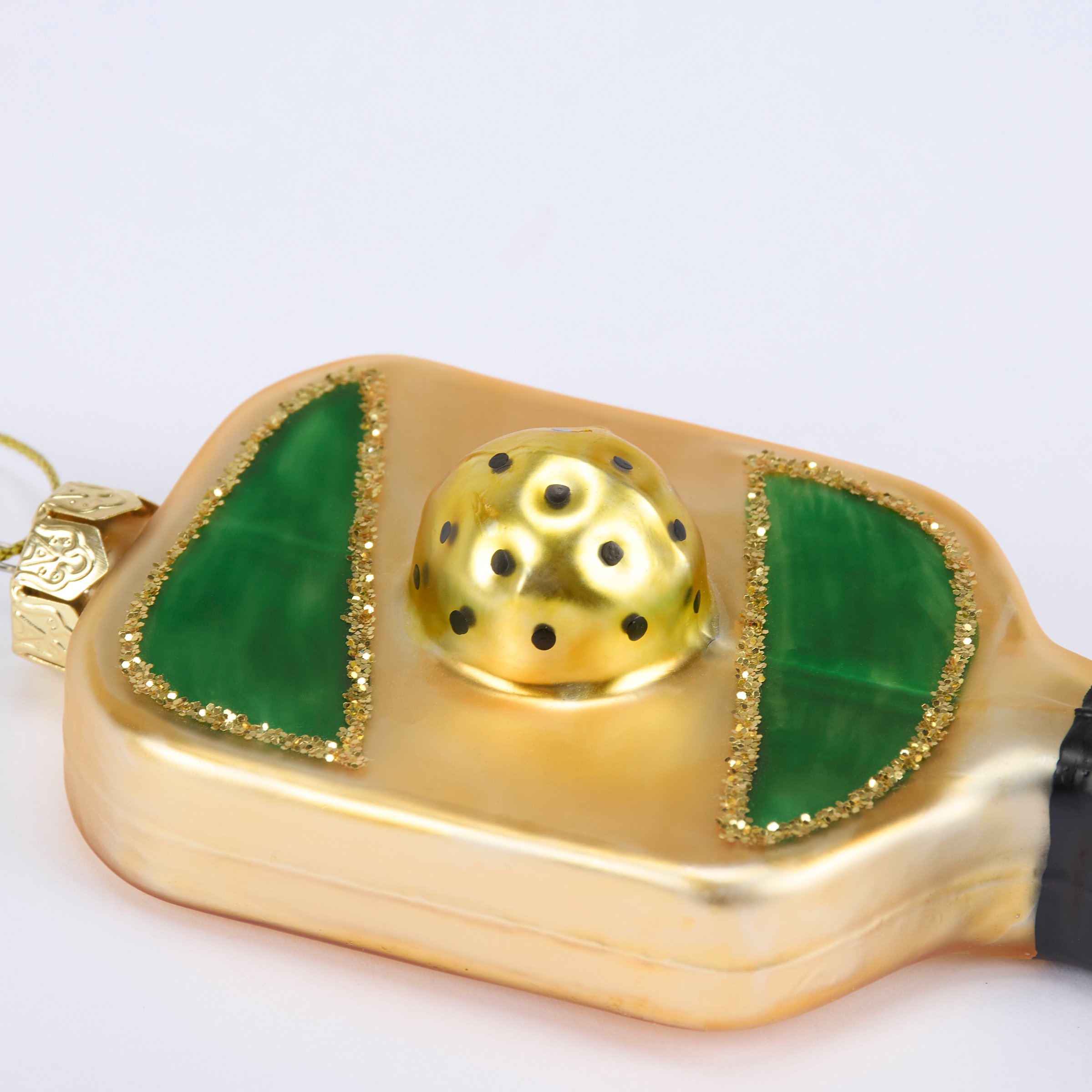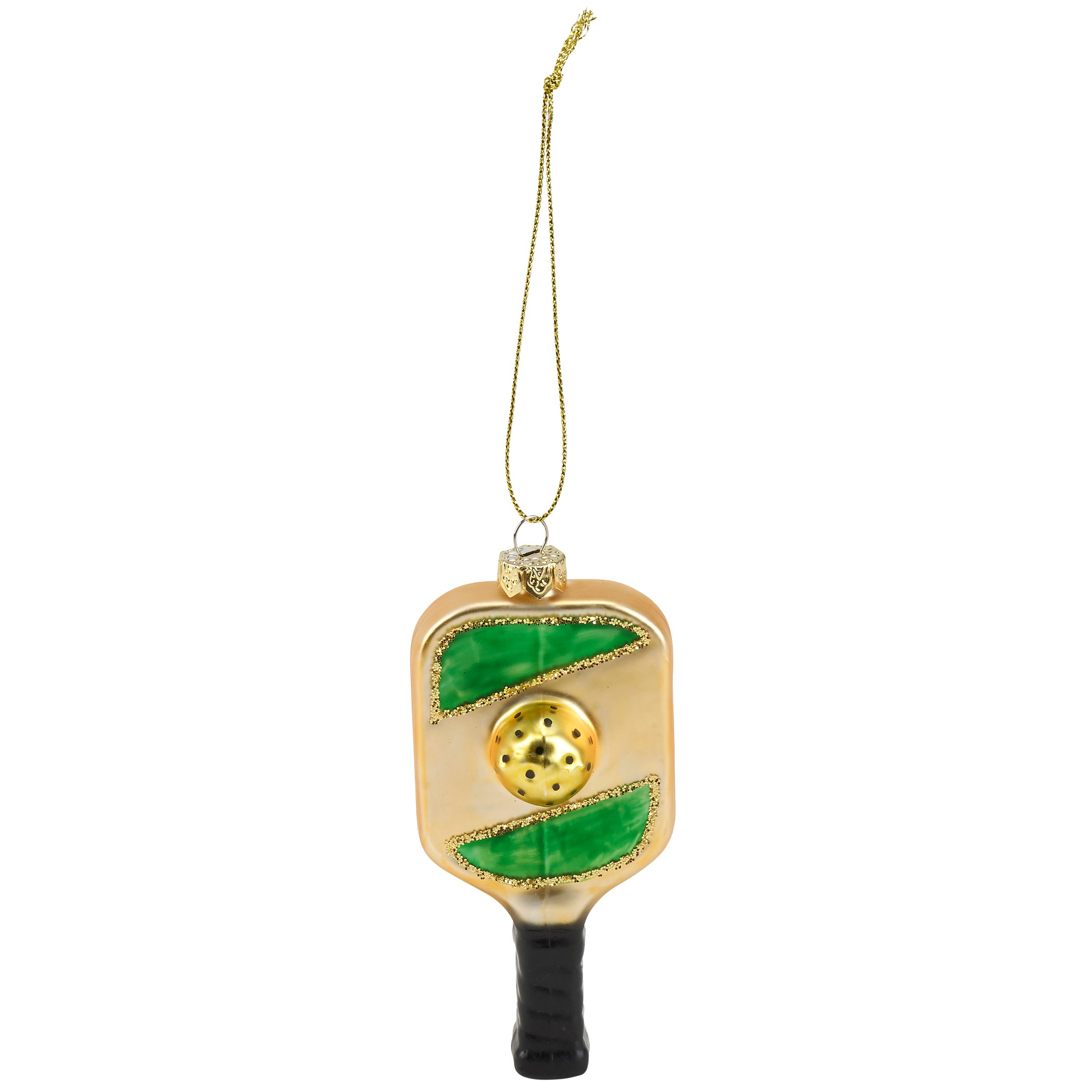 A glass ornament from our Christmas Collection displaying a pickleball inspired design of a pickleball on a paddle featuring painted details and glitter accents. Our glass Pickleball Paddle ornament is ready to hang for display via the included top loop and string hanger. A vintage style gift perfect for adding personality to a Christmas tree or for everyday pickleball themed displays.
