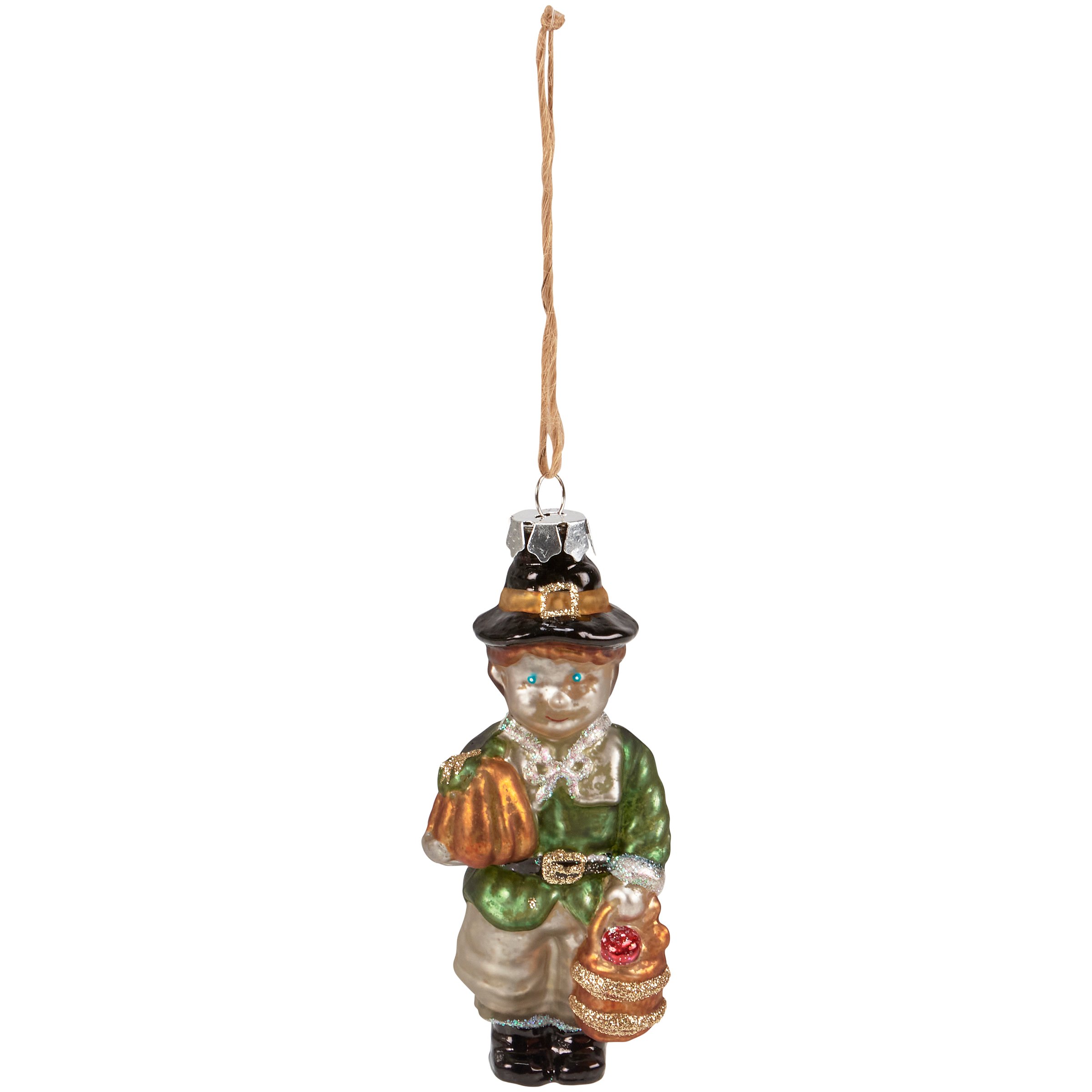 A glass ornament from our Fall & Harvest Collection displaying a design of a pilgrim holding a pumpkin and a barrel of food with color glitter accents. Our Pilgrim glass ornament is ready to hang via the included top loop. A vintage home accent perfect for seasonal display.